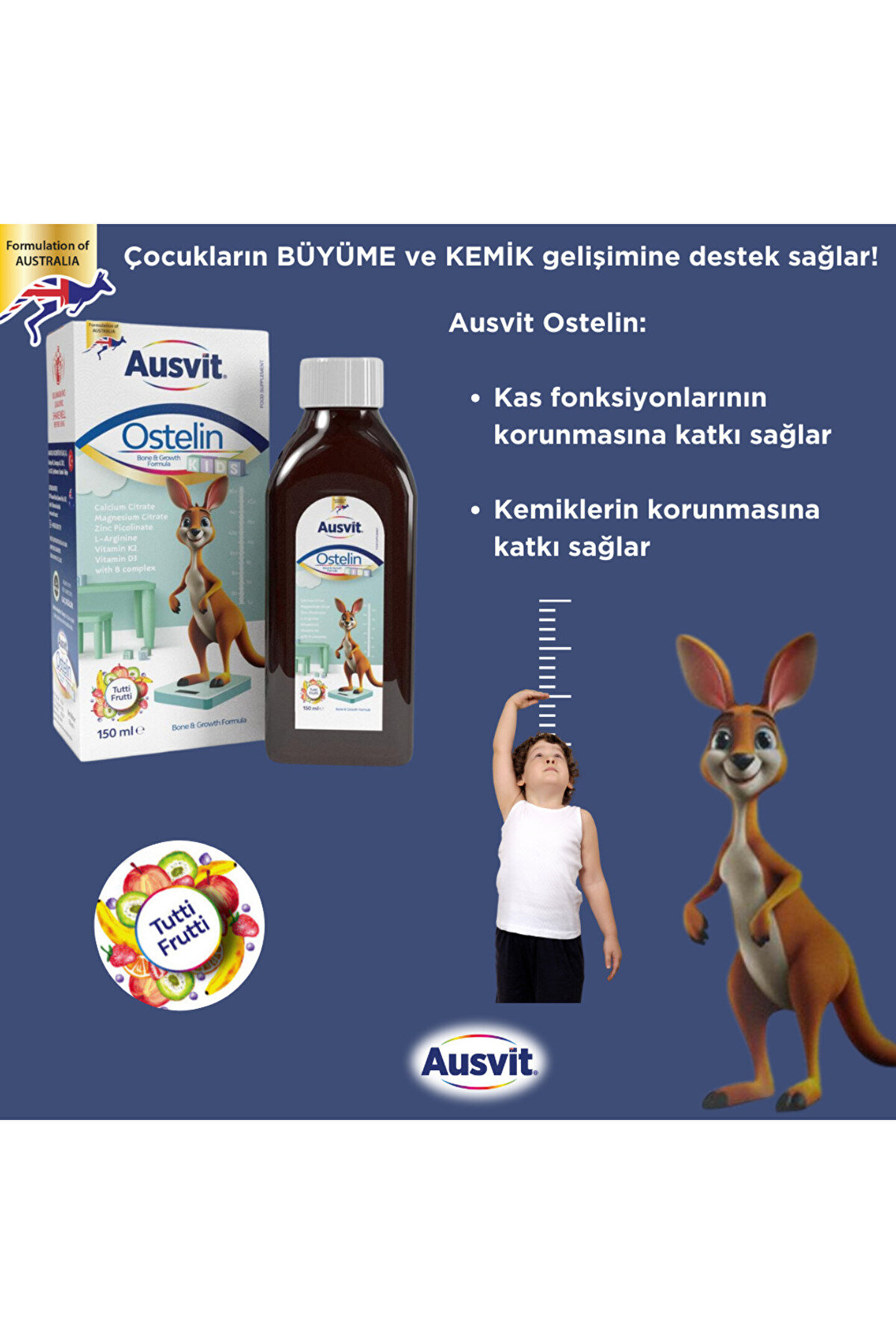 - Çocukların büyüme ve kemik gelişimini desteklemek için özel olarak formüle edilmiş, Ostelin Kids Bone and Growth Formula takviye edici gıda.; - Çocukların günlük vitamin ihtiyacını karşılamak üzere tasarlanmıştır.; - Orman meyveleri aroması ile çocuklara keyifli bir deneyim sunar ve onları tüketmeye teşvik eder.; - Sıvı formdaki bu multivitamin, kolayca karıştırılabilir ve çocukların beslenmesine pratik bir şekilde entegre edilebilir.; - Özel yaş grubuna uygun olarak geliştirilen bu ürün, 3 ila 12 yaş arası çocuklar için idealdir.