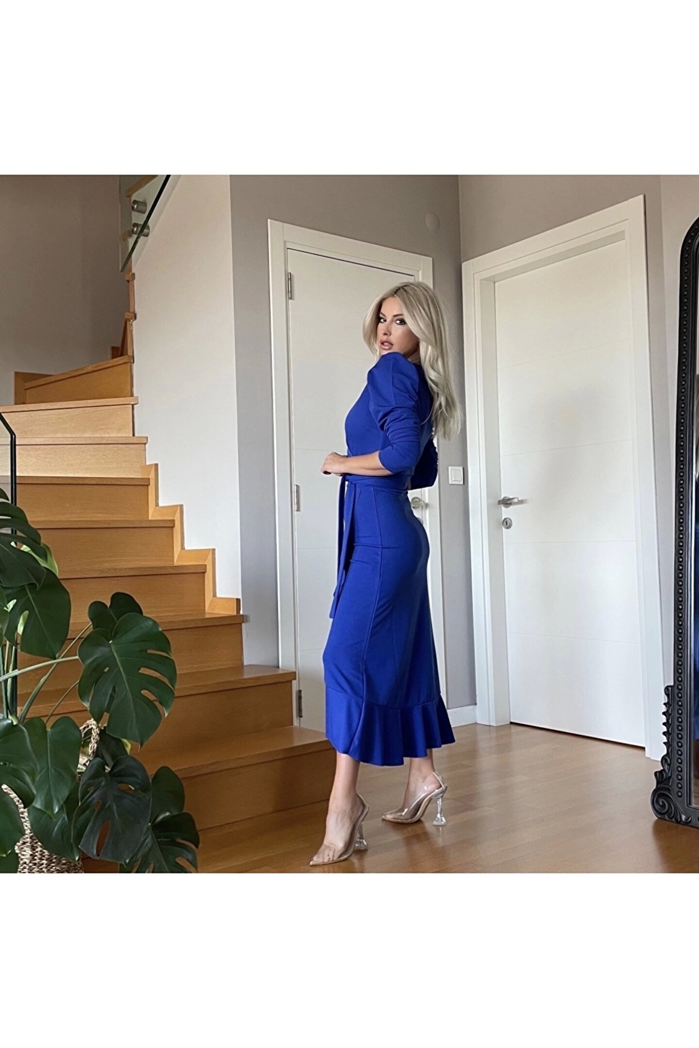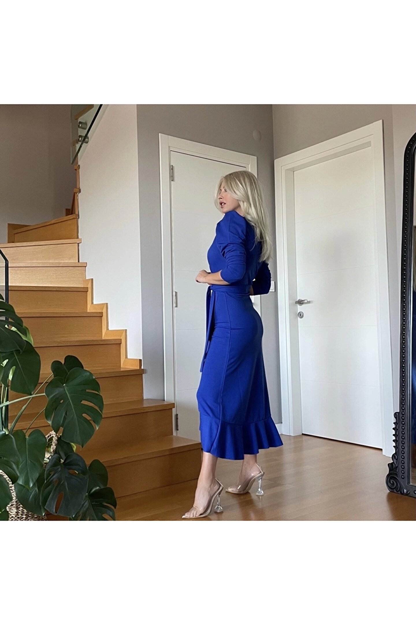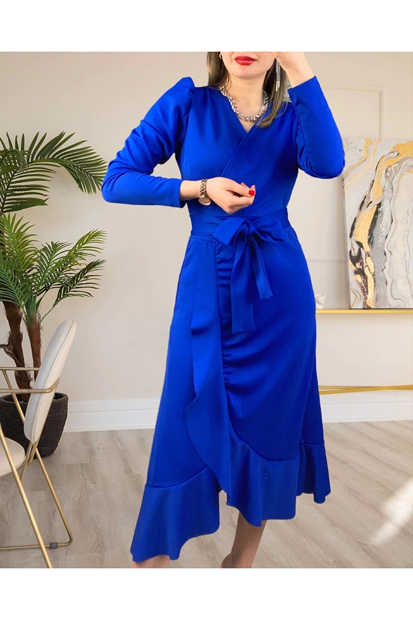 Krep Kumaş Midi Boy Kuşaklı Uzunkol Elbise