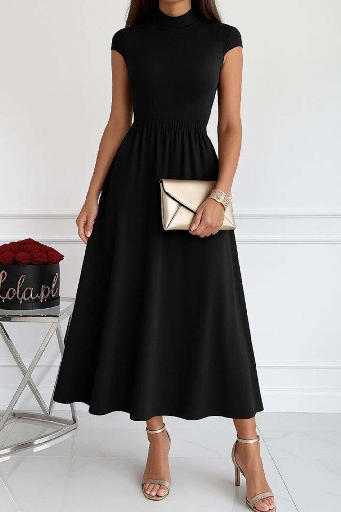 Ayena Moda Kadın Kısa Kollu Yarı Balıkçı Yaka Viskon Elbise