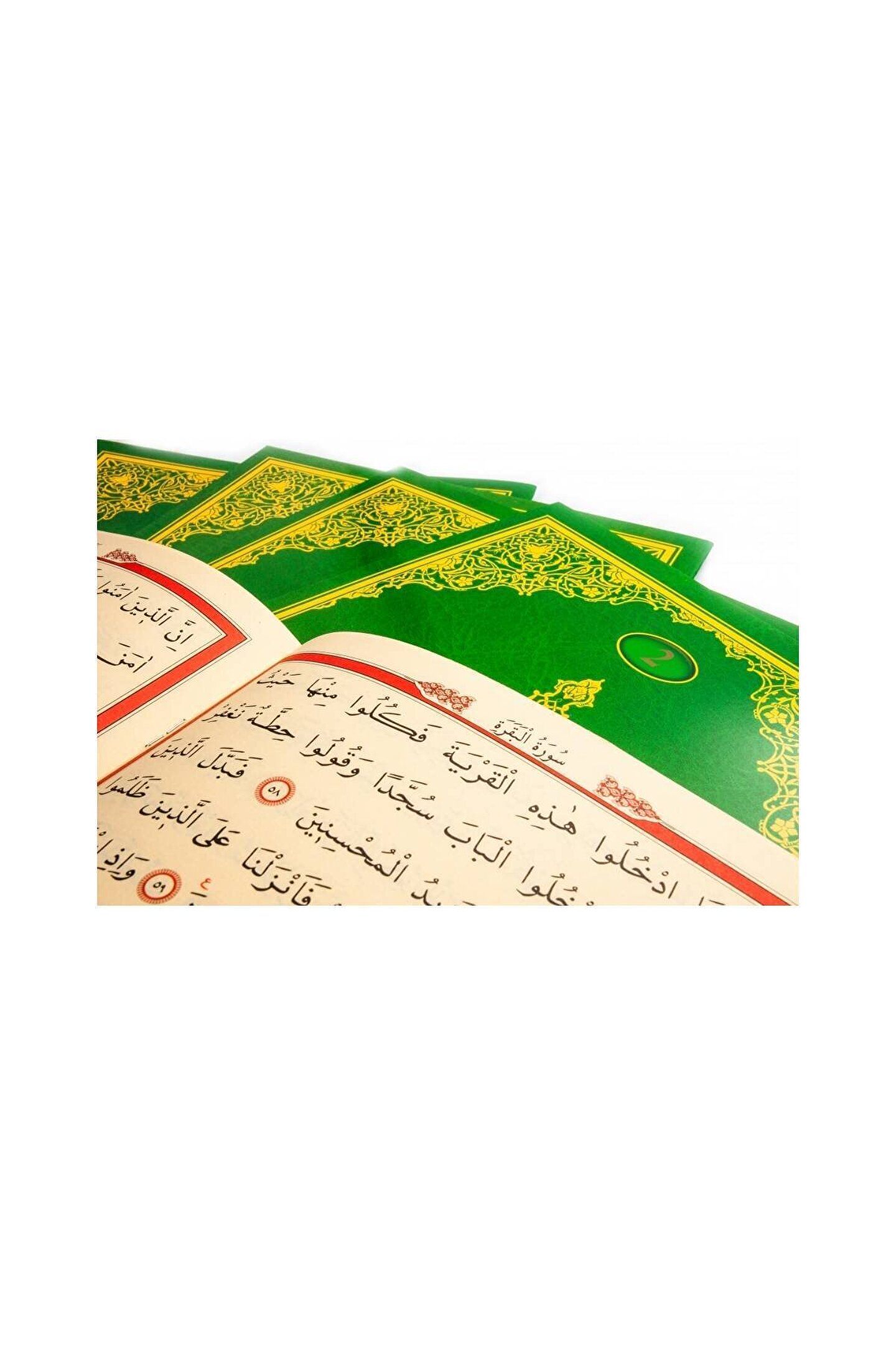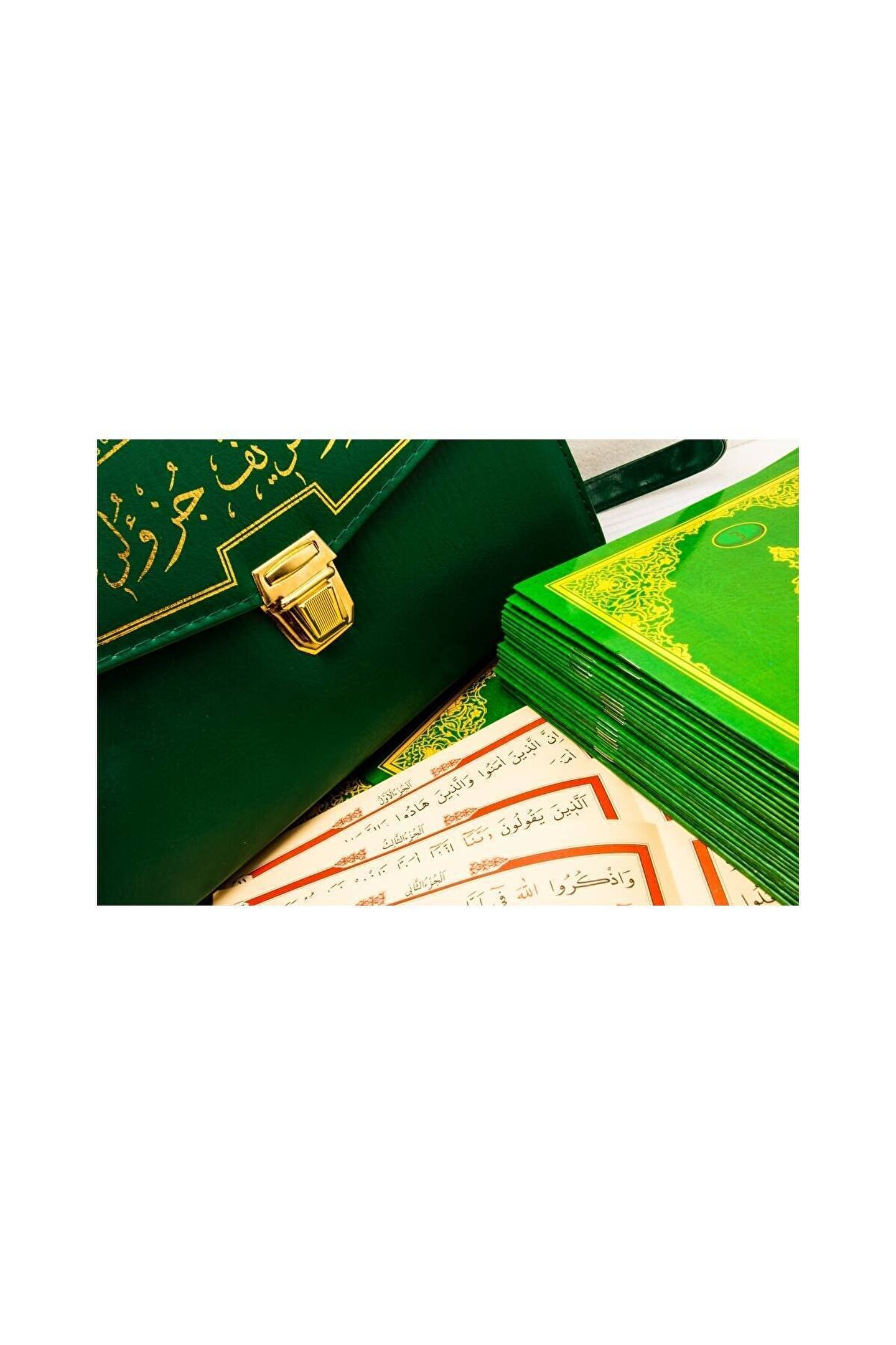 ESERİN ÖZELLİKLERİ Diyanet Mühürlü: Diyanet İşleri Başkanlığı Mushafları İnceleme ve Kıraat Kurulu'ndan Onaylı ve Mühürlü; Hat: Milyonlarca insanın Kur'ân-ı Kerim okumasını öğrendiği hattan.Okuması çok kolay bilgisayar hatlı; Renk: Yeşil; İç Baskı Özelliği: 2 Renk (Kırmızı - Siyah); Boy: Rahle Boy (21 cm * 28 cm); Kapak: Karton Kapak; İç Kağıt: Şamua Kağıt; Sayfa: 624 Sayfa; Ağırlık: 2,370 gram; Fihristli: Var; Çanta: Lüks Suni Deri Cilt, Paslanmaz Metal Aksam, Askılı; Cüz: Yan Kağıtlı, İplik Dikiş, Kesinlikle Ayrılmaz; Bu Kur'ân-ı Kerim Hafız Osman Hattına sâdık kalınarak Sayfa Tutar, Berkenar, Secavendli, Med'li ve Kasır'lı olarak hazırlanmıştır Seçilen yazı hem estetik hem de harflerin temel karakterlerini koruyan ve kolay okunmalarını sağlayan özel bir hattır. Harekeler ait oldukları harflerin hemen altında ya da üstünde sıralanmış, özellikle okumaya yeni başlayanlar hareke karışıklıklarına meydan vermeyecek şekilde düzenlenmiştir. Satır genişliği okuma kolaylığı sağlamak için arttırılmış, böylece harfler büyük satır ve harf aralıkları ferah tutulmuştur. Allah’ ve ‘Rab’ lafızları bayrak kırmızısı ile renklendirilmiştir. Kur’an-ı Kerim’i okurken doğru okunması için durularak nefes alınacak yerleri gösteren secaventler kırmızı ile gösterilmiştir. Sayfa üstlerinde kullanılan kılavuzlarda surelerin ve cüzlerin isimleriyle beraber numaraları da verilerek okuyucunun aradığı sure ve cüz’ü numarasından da rahatlıkla bulabilmeleri amaçlanmıştır. Her bir sure başlığında, surenin adı, nazil olduğu yer ve ayet sayısı, rakam ve yazı ile belirtilerek sure hakkında bir ön bilgi verilmiştir. Kur'ân-ı Kerîm'in otuz cüz'ü ayrı ayrı ciltlenerek hazırlanan Hatm-i Şerîf Cüzleri, mukabelelerde ve bilhassa toplu hatimlerde büyük bir rahatlık sağlamaktadır. Kendine mahsus çantası ile topluca taşıması da oldukça kolay olan Hatm-i Şerîf Cüz'leri, Allah Kelâmı'nı beraberce tilâvet ederek hatmetmek isteyenlerin tercihi olmaktadır. Ayrı ayrı bez ciltli bulunan Hatm-i Şerîf Cüz'leri ile mukabelelere katılmak isteyenler, cüz'leri ayrı ayrı taşımanın rahatlığını yaşamaktadırlar. Not: Evde, arabada, işyerinde devamlı yanınızda taşıyabileceğiniz başucu kitabınız.