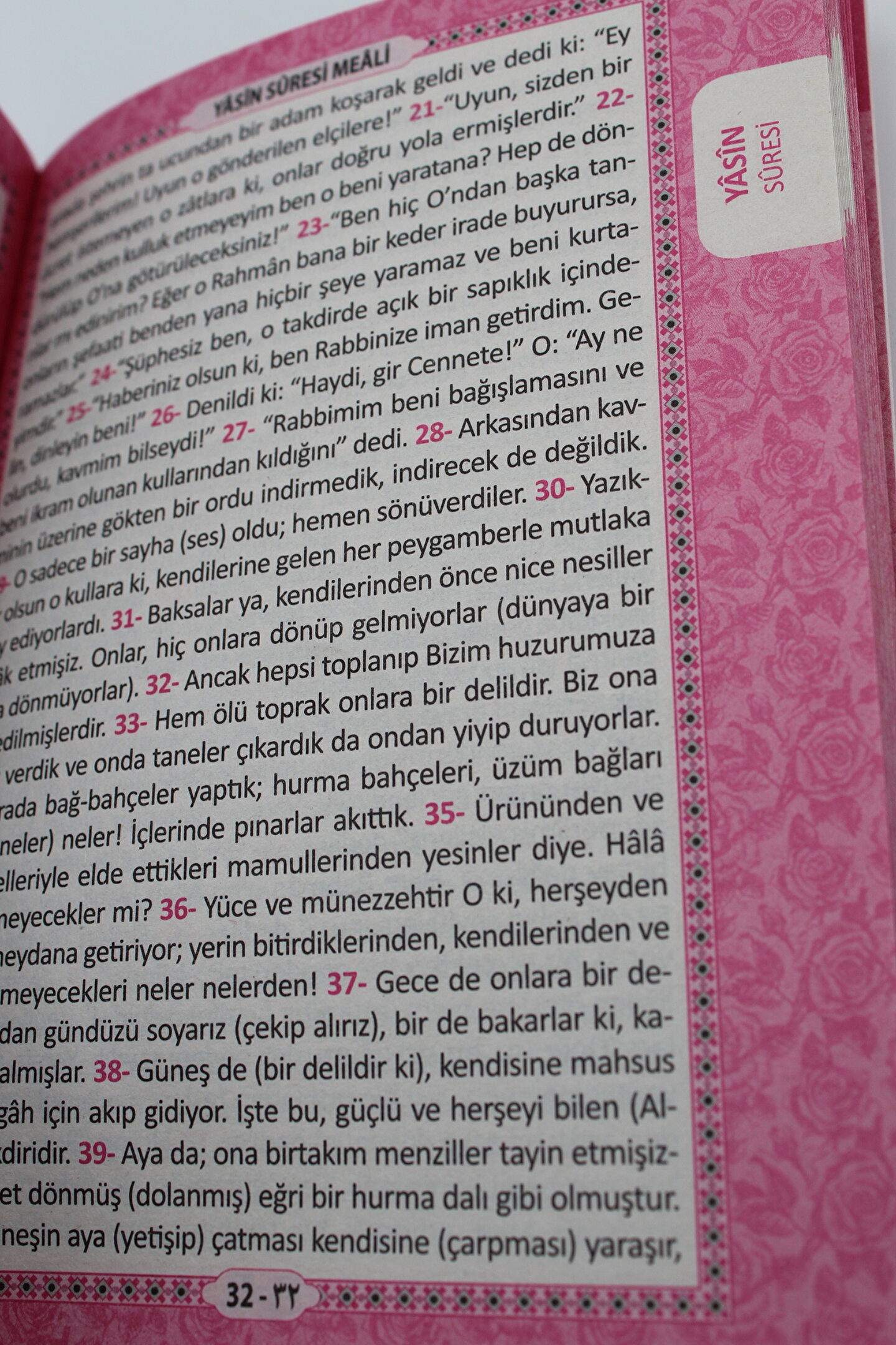 10 Adet Yasini Şerif Açıklamalı ve Mealli Çanta Boy ; Ürün Özellikleri ; Boyut: 12x16cm ; 2. Hamur Kağıt ; Karton Kapak ; 80 Sayfa ; 2 Renk Baskı ; Dünyanın en kolay okunan Bilgisayar Hattı ile hazırlandı, seçilen yazı hem estetik hem de harflerin temel karakterlerini koruyan ve kolay okunmalarını sağlayan özel bir hattır. Harekeler ait oldukları harflerin hemen altında ya da üstünde sıralanmış, özellikle okumaya yeni başlayanlar hareke karışıklıklarına meydan vermeyecek şekilde düzenlenmiştir. ;