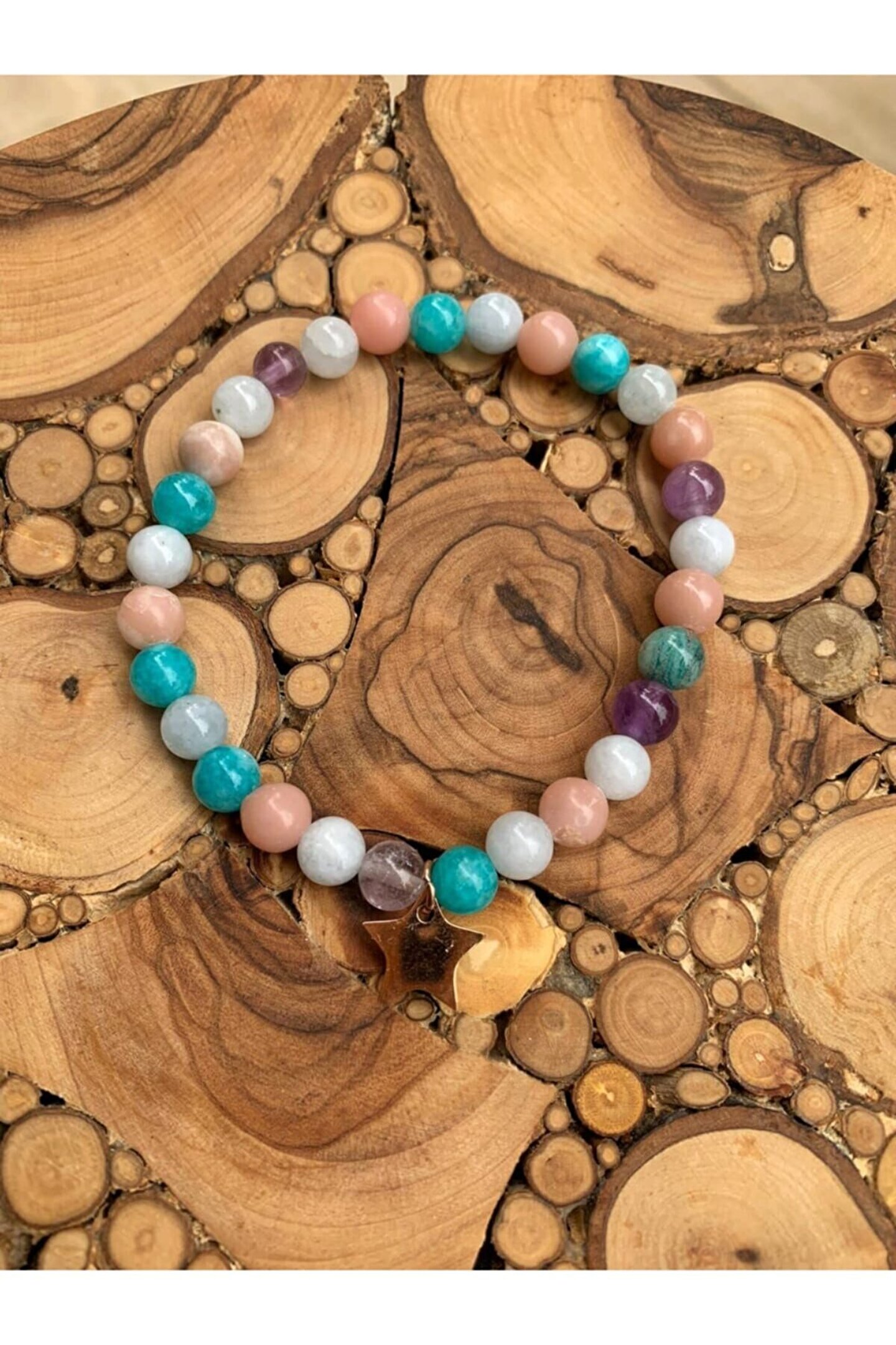 Doğal taş kullanımı sayesinde her bileklik benzersiz ve otantik bir görünüm sunar; Ametist, aytaşı, helidor ve amazonit gibi değerli taşların birleşimiyle zenginleştirilmiş tasarım, şıklığınızı tamamlar; Doğal taşların eşsiz dokusu ve renkleri, bilekliğinize zarif bir parlaklık katar; Her bileklik, el yapımı olmasıyla dikkat çeker ve kişisel bir dokunuşla tasarlanmıştır; Bu bileklik, günlük kullanım için idealdir ve her türlü kıyafetle uyum sağlar;