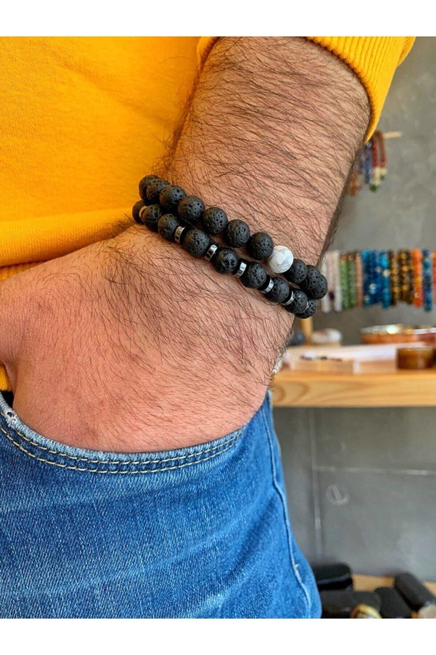 - Doğal taş kullanımı sayesinde her bileklik benzersiz ve otantik bir görünüm sunar; - Taş cinsi olarak seçilen lav taşı, bilekliğe doğal bir parlaklık ve estetik bir dokunuş katar; - Taş materyali ile üretilen bu bileklik, dayanıklılığı ve şıklığı bir arada sunar;