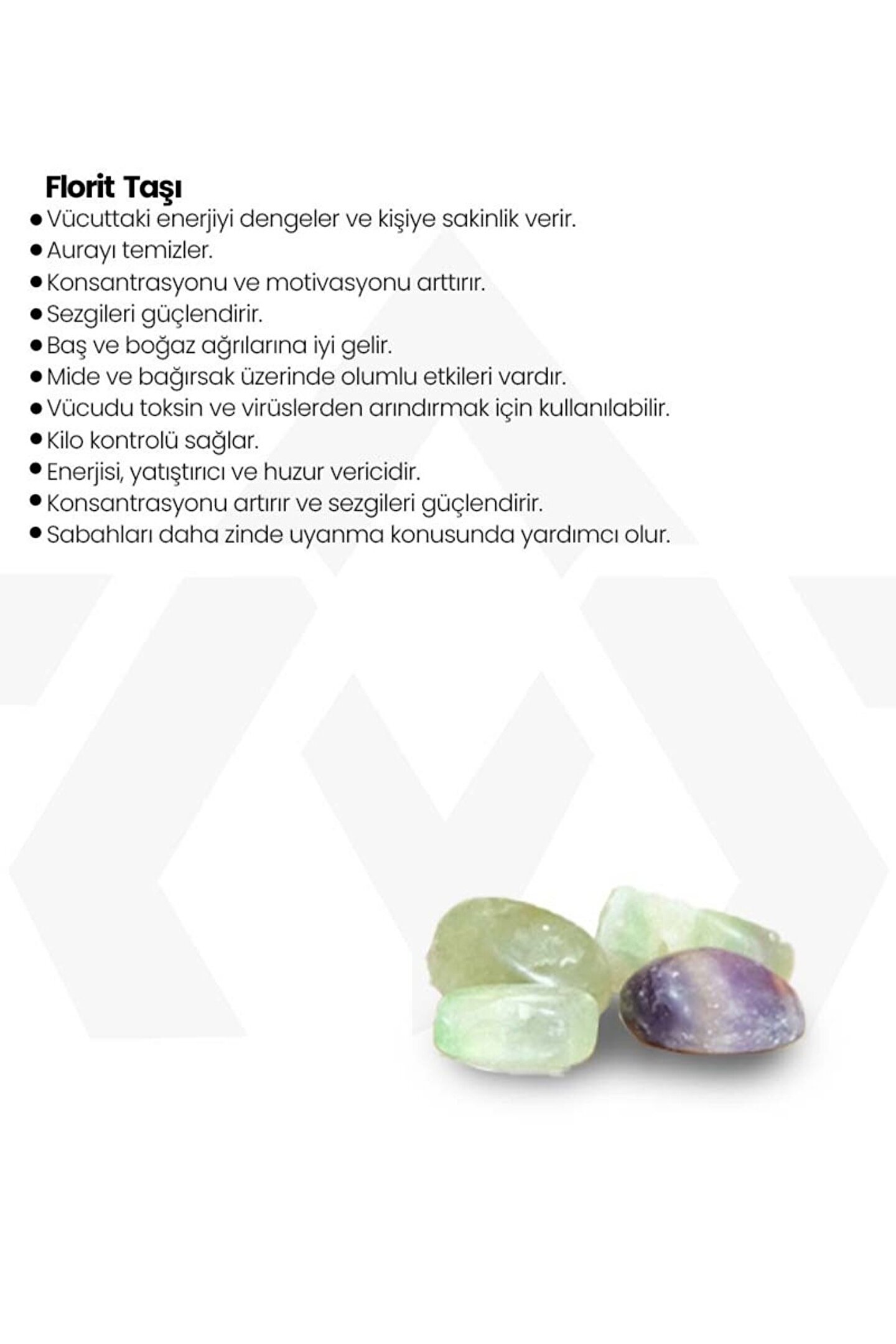 Ürünlerimizde şekil, renk ve desen farklılıkları görülebilir. Florit Taşı Özellikleri Vücuttaki enerjiyi dengeler ve kişiye sakinlik verir. ; Aurayı temizler. ; Konsantrasyonu ve motivasyonu arttırır. ; Sezgileri güçlendirir. ; Baş ve boğaz ağrılarına iyi gelir. ; Mide ve bağırsak üzerinde olumlu etkileri vardır. ; Vücudu toksin ve virüslerden arındırmak için kullanılabilir. ; Kilo kontrolü sağlar. ; Enerjisi, yatıştırıcı ve huzur vericidir. ; Konsantrasyonu artırır ve sezgileri güçlendirir. ; Sabahları daha zinde uyanma konusunda yardımcı olur. ;
