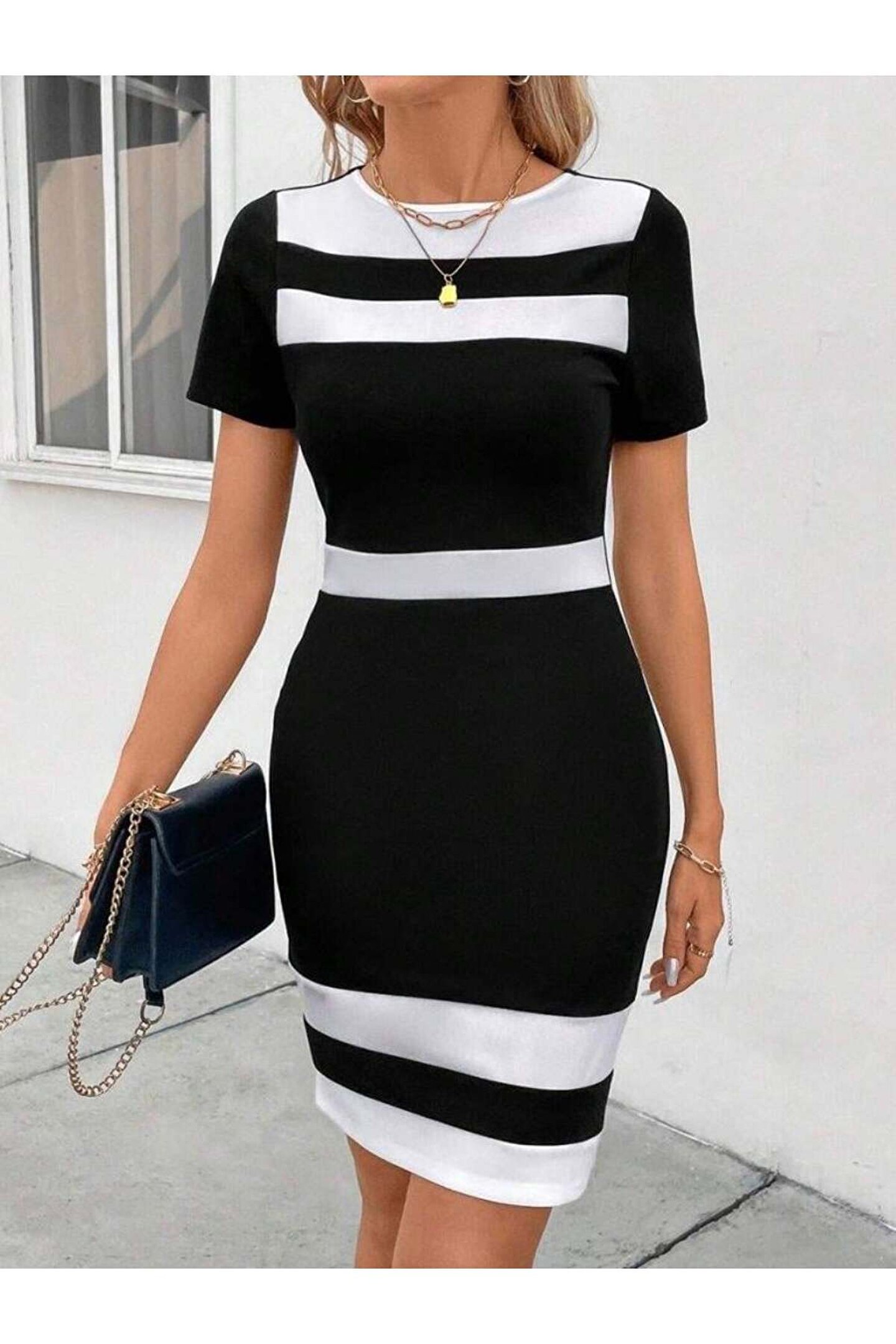 babatr.com Kadın Kısa Kollu Bisiklet Yaka çift Renkli Ithal Krep Elbise