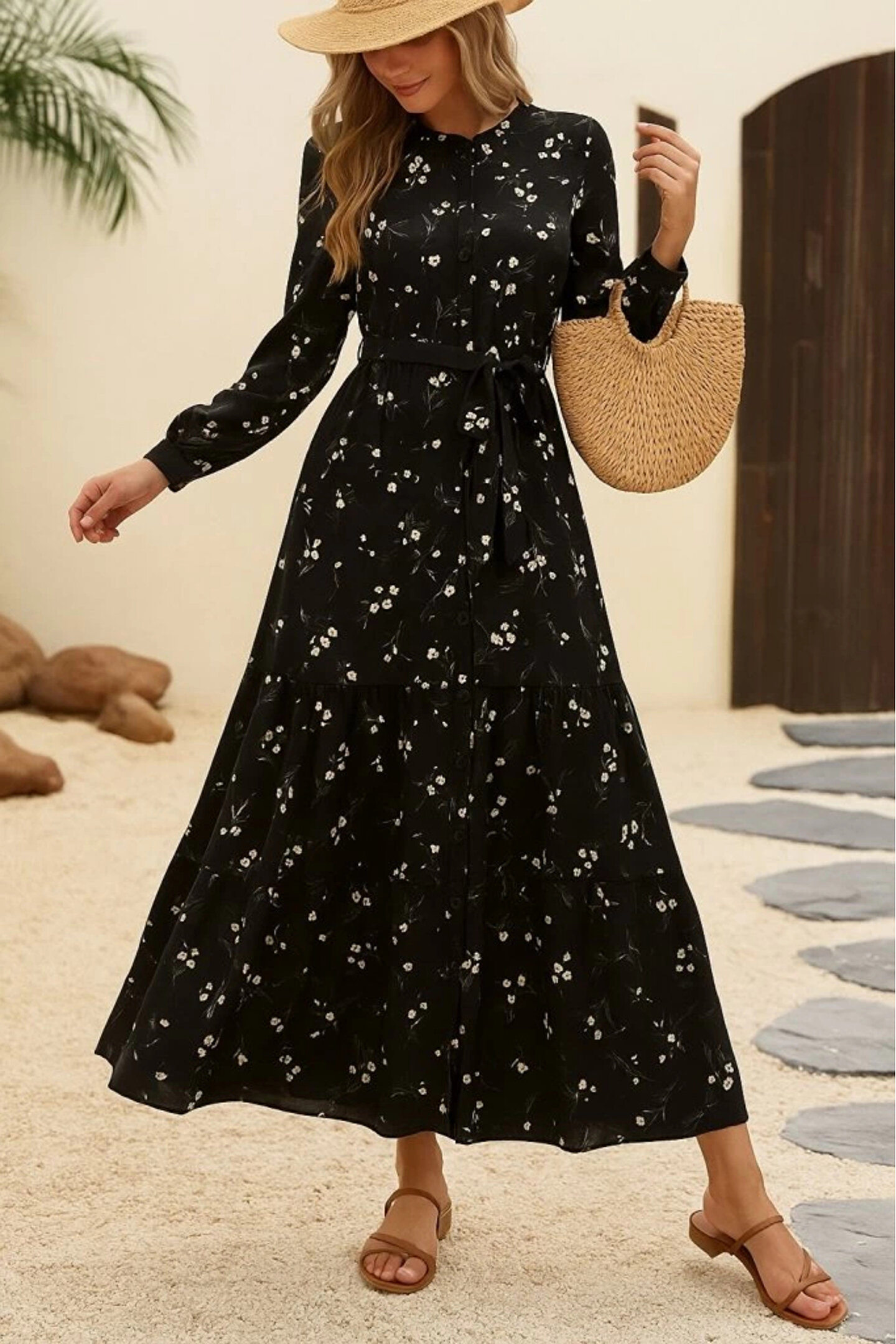 babatr.com Kadın Uzun Kollu Hakim Yakalı Düğmeli Kuşaklı Desenli Maxi Mikro Süprem Elbise
