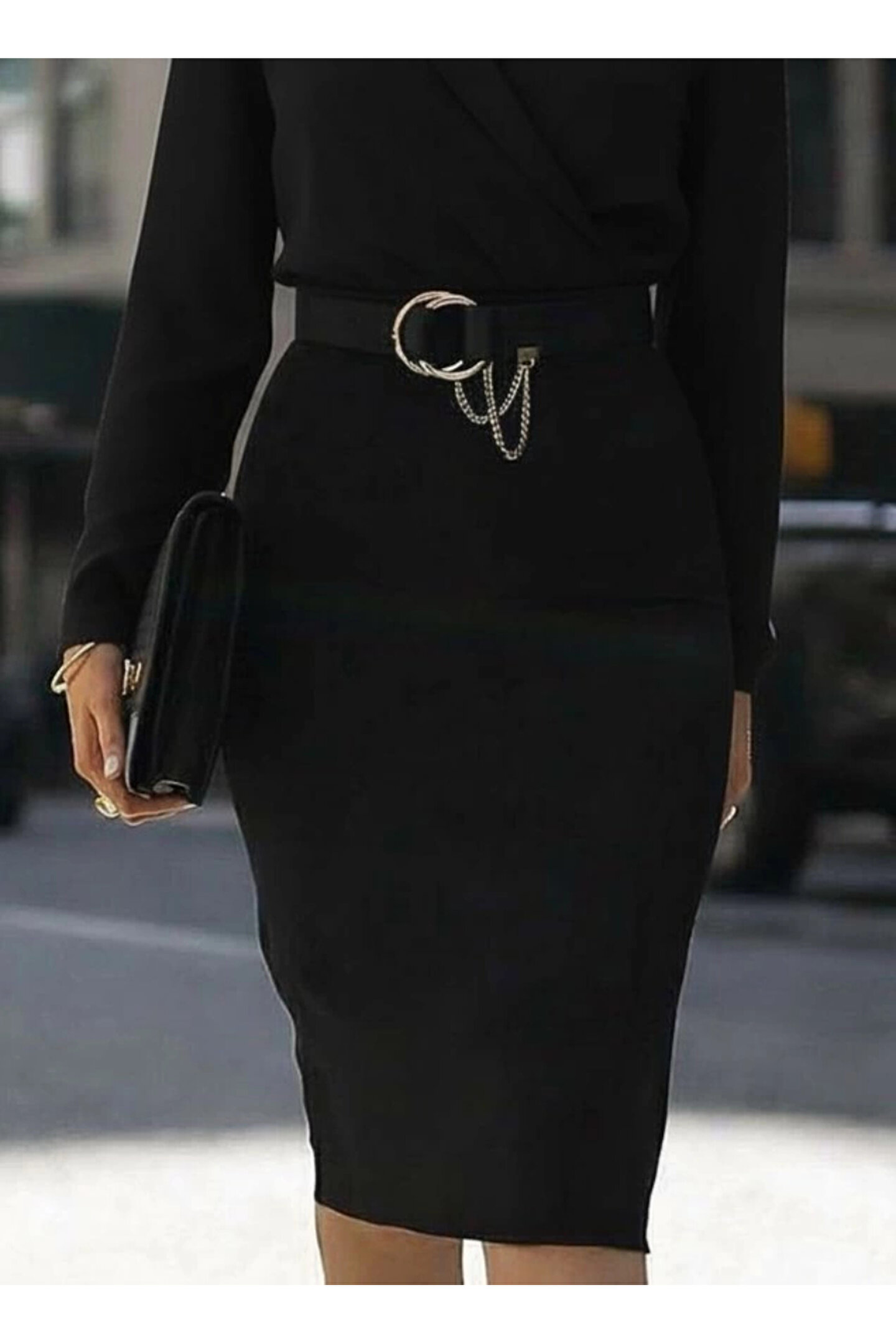 babatr.com Kadın Uzun Kollu Kruvaze Yaka Janjan Krep Midi Elbise