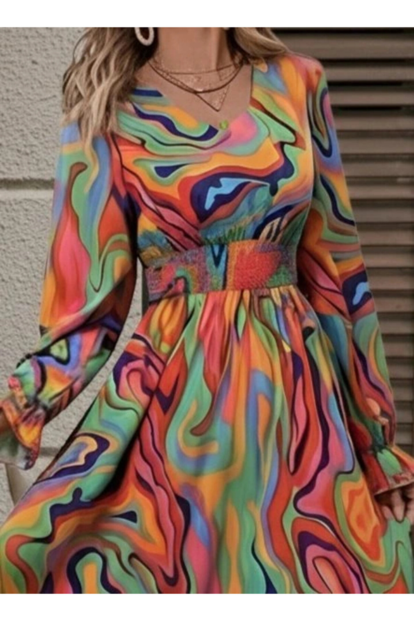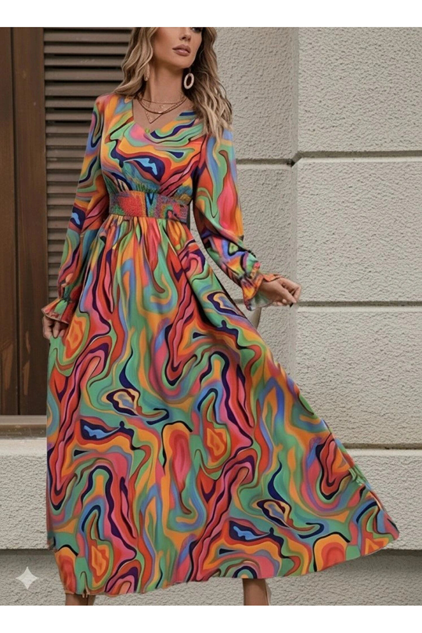 babatr.com Kadın Uzun Kollu V Yakalı Desenli Maxi Süprem Elbise