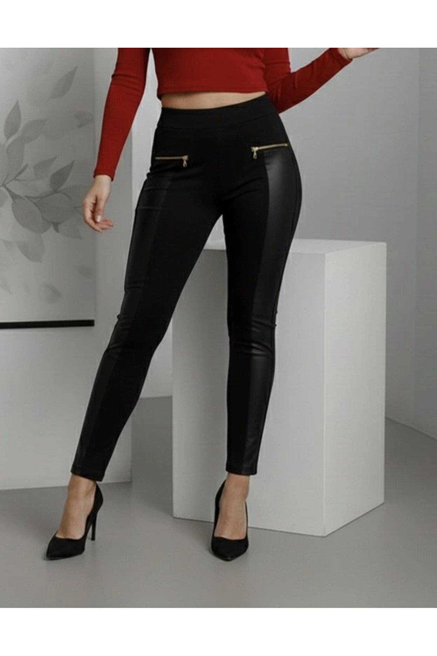 babatr.com Kadın Yüksek Bel Deri Detaylı Fermuarlı Dalgıç Tayt