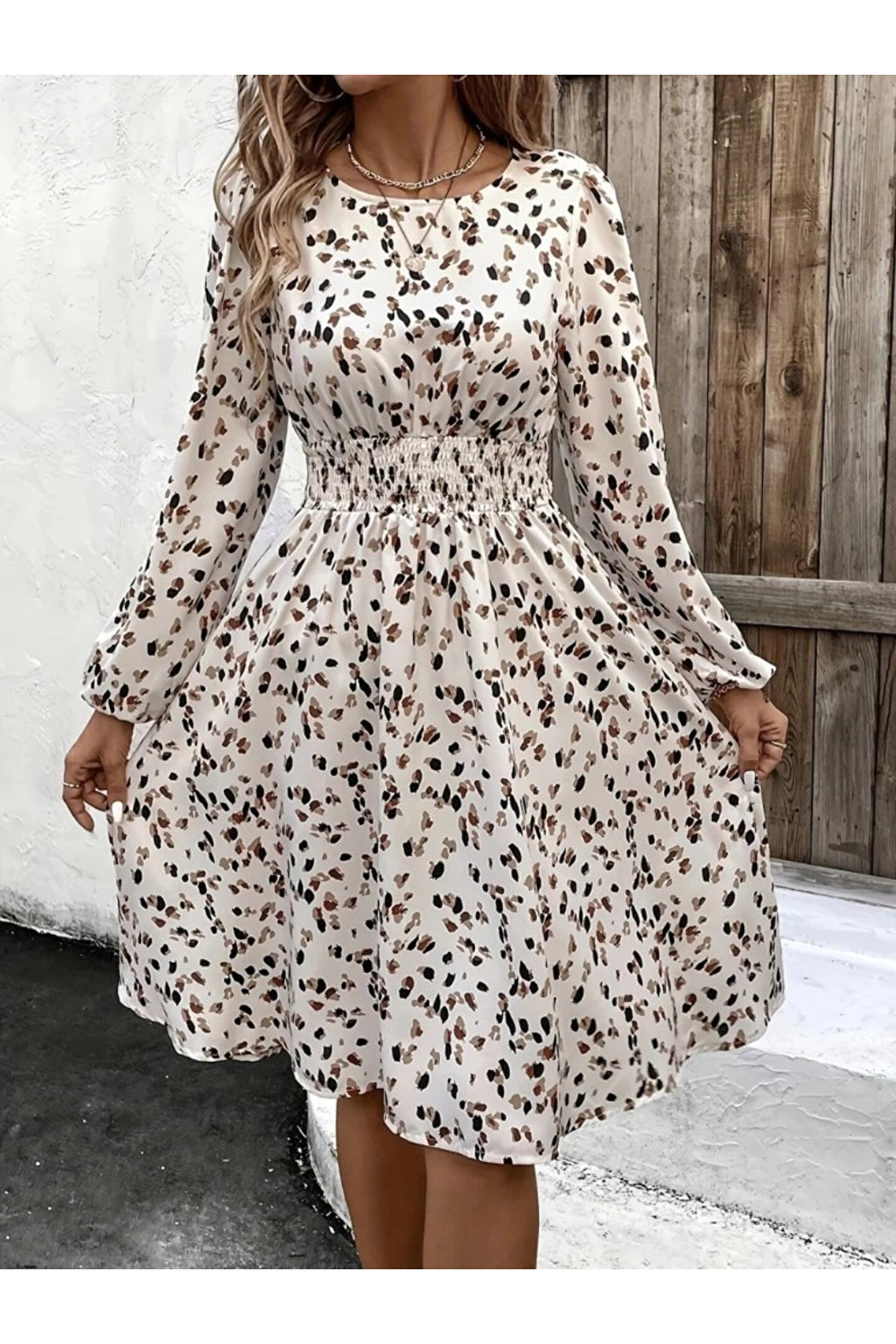 Kadın Uzun Kollu Bot Yaka Beli Lastikli Midi Süprem Elbise
