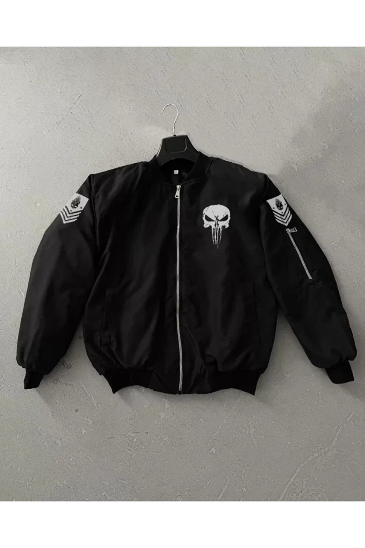 Unisex Uzun Kol Kuru Kafa Baskılı Bomber Ceket - Siyah