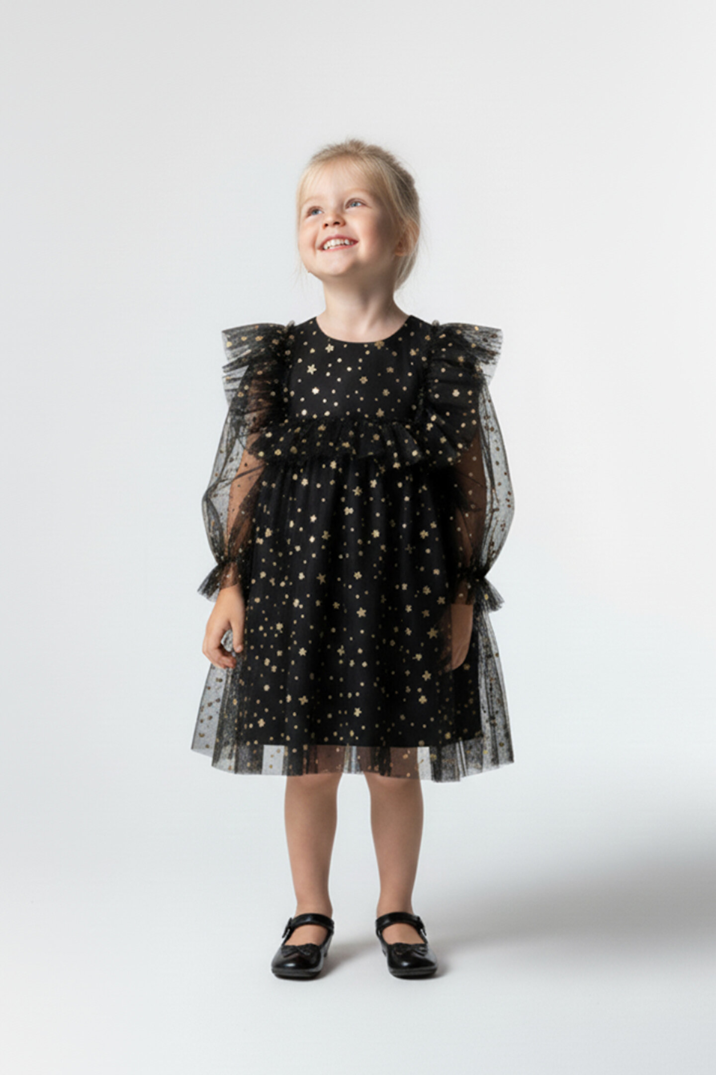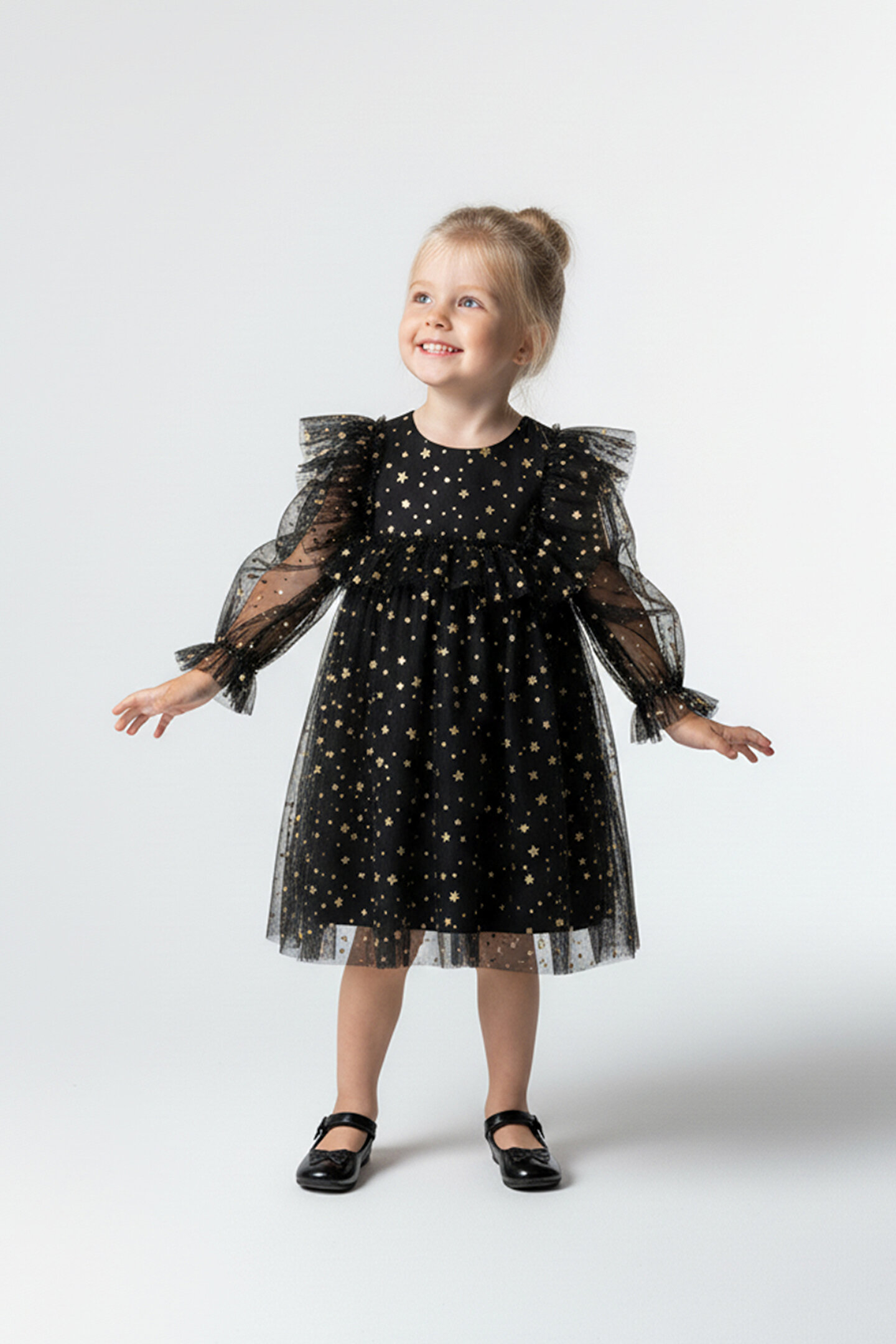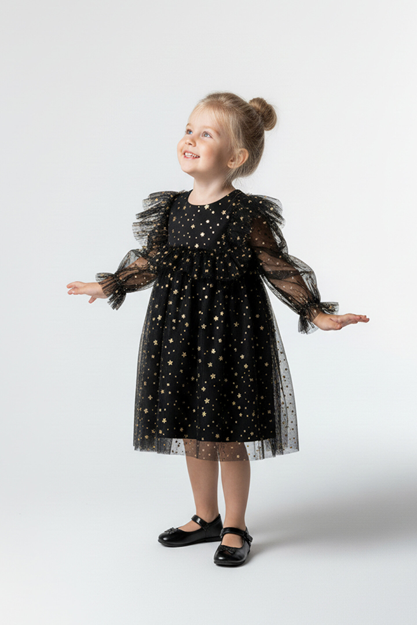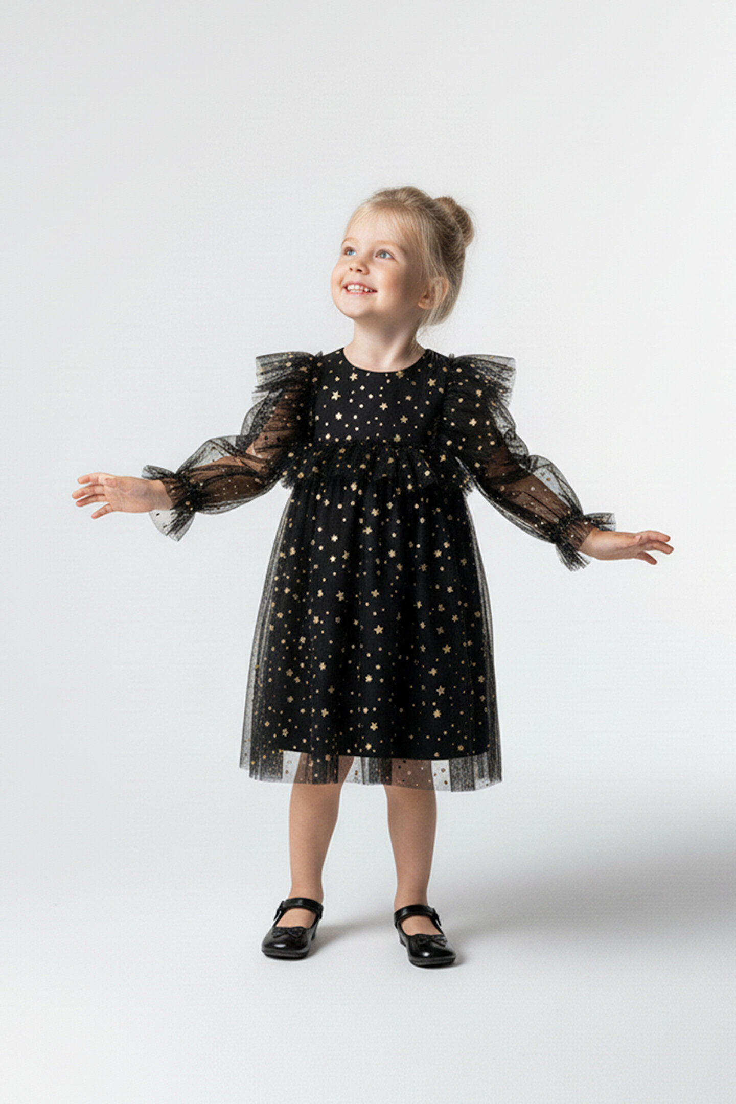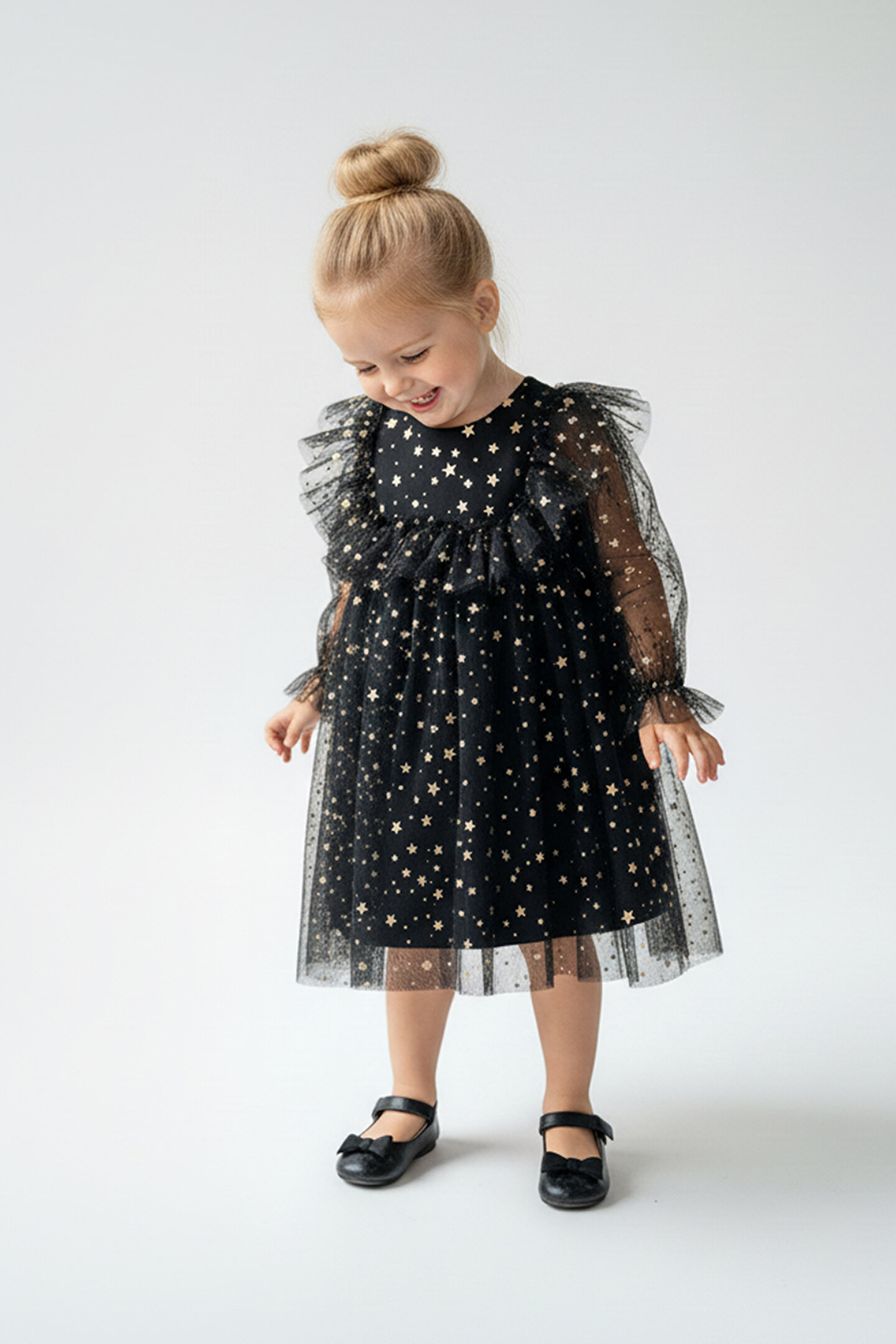 Mevsimlik Uzun Kollu Dantel Detaylı Kız Çocuk Elbisesi: Küçük prensesinizin özel günlerde zarafetini ve şıklığını ön plana çıkaracak bu elbise, yıldız detayıyla tasarlanmıştır.; Ayrıca etek kısmında bulunan yırtmaç detayı, hareket özgürlüğü sağlarken bebeğinizin zarif bir görünüm sergilemesini sağlar.; Özellikler tül Detaylar: Elbisenin ön kısmında ve kollarda bulunan yıldız detayıyla, zarafet ve incelik katarken, küçük prensesinizin görünümünü daha etkileyici hale getirir.; Arkasındaki yıldız detayıyla: Elbisenin ön kısmında bulunan yıldız detayıyla, sevimliliği ve şıklığı artırır.; Küçük prensesinizin görünümüne hoş bir dokunuş ekler.; Yırtmaç Detayı: Etek kısmında bulunan yırtmaç detayı, hareket özgürlüğü sağlarken, elbisenin tasarımına dinamizm katar.; Uzun Kollu Tasarım:Rahatlıkla giyilebilecek Uzun kollu tasarım, bebeğinizin özgürce hareket etmesine olanak tanır.; Mevsimlik Kullanıma Uygun: Hafif yapısı ve nefes alabilen kumaşıyla rahatlıkla giyilebilir.; Özel Günler İçin Uygun: Özel günlerde tercih edilebilecek şık tasarımıyla bebeğinizin her anında göz kamaştırmasını sağlar.; Bu yırtmaçlı,yıldız detayıyla Uzun kollu kız çocuk elbisesi, küçük prensesinizin serin ve şık kalmasını sağlarken, aynı zamanda özel günlerde de zarafetini tamamlar.; Zarif detaylarıyla bezenmiş bu elbise, bebeğinizin tarzını ve güzelliğini ön plana çıkarır.
