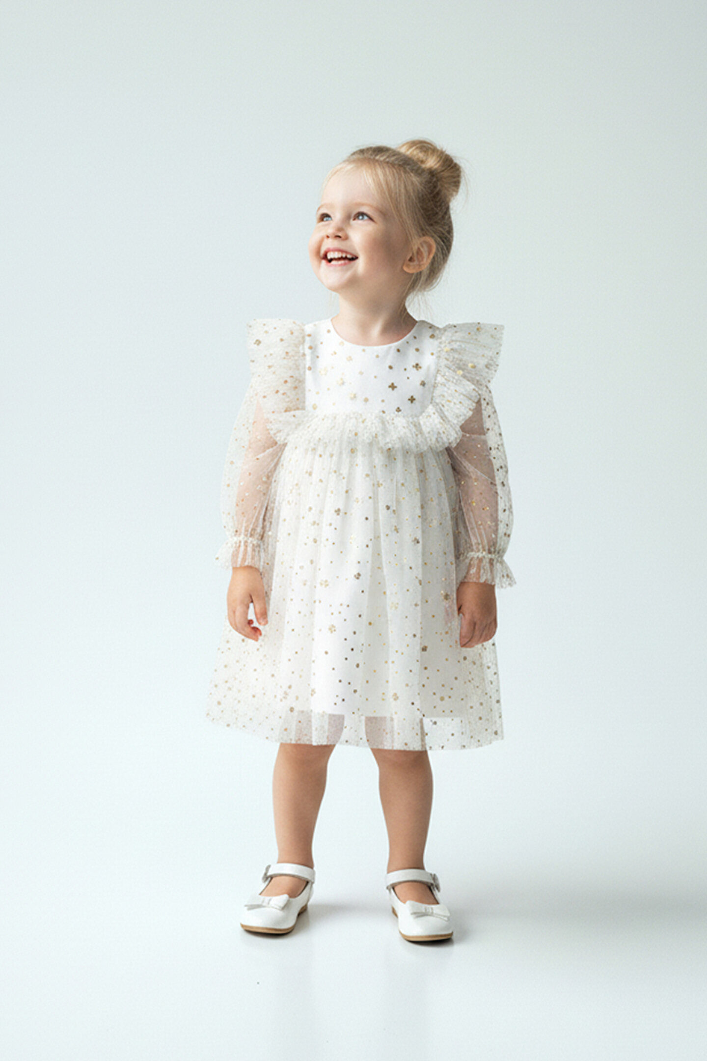 Mevsimlik Uzun Kollu Dantel Detaylı Kız Çocuk Elbisesi: Küçük prensesinizin özel günlerde zarafetini ve şıklığını ön plana çıkaracak bu elbise, yıldız detayıyla tasarlanmıştır.; Ayrıca etek kısmında bulunan yırtmaç detayı, hareket özgürlüğü sağlarken bebeğinizin zarif bir görünüm sergilemesini sağlar.; Özellikler tül Detaylar: Elbisenin ön kısmında ve kollarda bulunan yıldız detayıyla, zarafet ve incelik katarken, küçük prensesinizin görünümünü daha etkileyici hale getirir.; Arkasındaki yıldız detayıyla: Elbisenin ön kısmında bulunan yıldız detayıyla, sevimliliği ve şıklığı artırır.; Küçük prensesinizin görünümüne hoş bir dokunuş ekler.; Yırtmaç Detayı: Etek kısmında bulunan yırtmaç detayı, hareket özgürlüğü sağlarken, elbisenin tasarımına dinamizm katar.; Uzun Kollu Tasarım:Rahatlıkla giyilebilecek Uzun kollu tasarım, bebeğinizin özgürce hareket etmesine olanak tanır.; Mevsimlik Kullanıma Uygun: Hafif yapısı ve nefes alabilen kumaşıyla rahatlıkla giyilebilir.; Özel Günler İçin Uygun: Özel günlerde tercih edilebilecek şık tasarımıyla bebeğinizin her anında göz kamaştırmasını sağlar.; Bu yırtmaçlı,yıldız detayıyla Uzun kollu kız çocuk elbisesi, küçük prensesinizin serin ve şık kalmasını sağlarken, aynı zamanda özel günlerde de zarafetini tamamlar.; Zarif detaylarıyla bezenmiş bu elbise, bebeğinizin tarzını ve güzelliğini ön plana çıkarır.