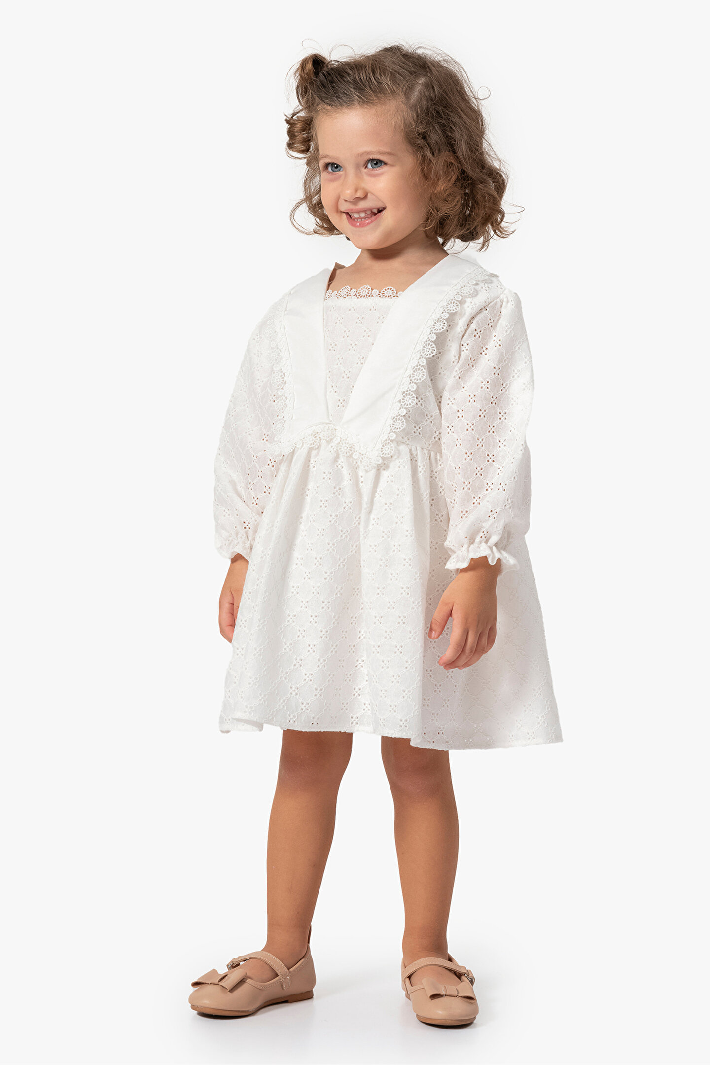 Mevsimlik Uzun Kollu Dantel Detaylı Kız Çocuk Elbisesi: Küçük prensesinizin yaz mevsiminde özel günlerde zarafetini ve şıklığını ön plana çıkaracak bu elbise, önünde bulunan fiyonk detayı ve dantel işlemeleriyle tasarlanmıştır.; Ayrıca etek kısmında bulunan yırtmaç detayı, hareket özgürlüğü sağlarken bebeğinizin zarif bir görünüm sergilemesini sağlar.; Özellikler: Dantel Detaylar: Elbisenin ön kısmında ve kollarda bulunan dantel detaylar, zarafet ve incelik katarken, küçük prensesinizin görünümünü daha etkileyici hale getirir.; Önünde Fiyonk Detayı: Elbisenin ön kısmında bulunan fiyonk detayı, sevimliliği ve şıklığı artırır.; Küçük prensesinizin görünümüne hoş bir dokunuş ekler.; Yırtmaç Detayı: Etek kısmında bulunan yırtmaç detayı, hareket özgürlüğü sağlarken, elbisenin tasarımına dinamizm katar.; Uzun Kollu Tasarım:Rahatlıkla giyilebilecek Uzun kollu tasarım, bebeğinizin serin kalmasını sağlar ve özgürce hareket etmesine olanak tanır.; Mevsimlik Kullanıma Uygun: Hafif yapısı ve nefes alabilen kumaşıyla yaz aylarında rahatlıkla giyilebilir.; Özel Günler İçin Uygun: Özel günlerde tercih edilebilecek şık tasarımıyla bebeğinizin her anında göz kamaştırmasını sağlar.; Bu yırtmaçlı, önü fiyonklu ve dantel detaylı Uzun kollu kız çocuk elbisesi, küçük prensesinizin serin ve şık kalmasını sağlarken, aynı zamanda özel günlerde de zarafetini tamamlar.; Zarif detaylarıyla bezenmiş bu elbise, bebeğinizin tarzını ve güzelliğini ön plana çıkarır.