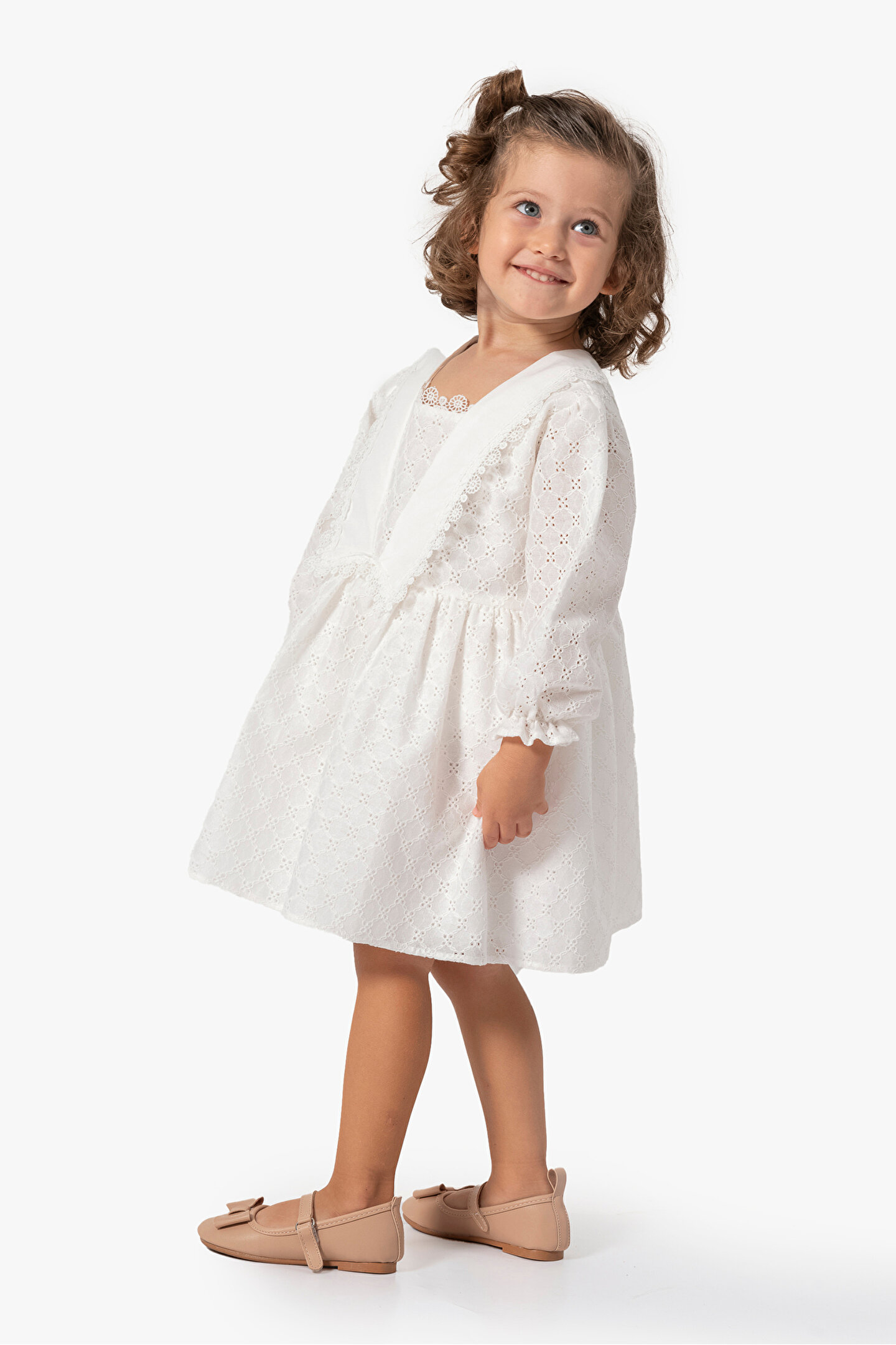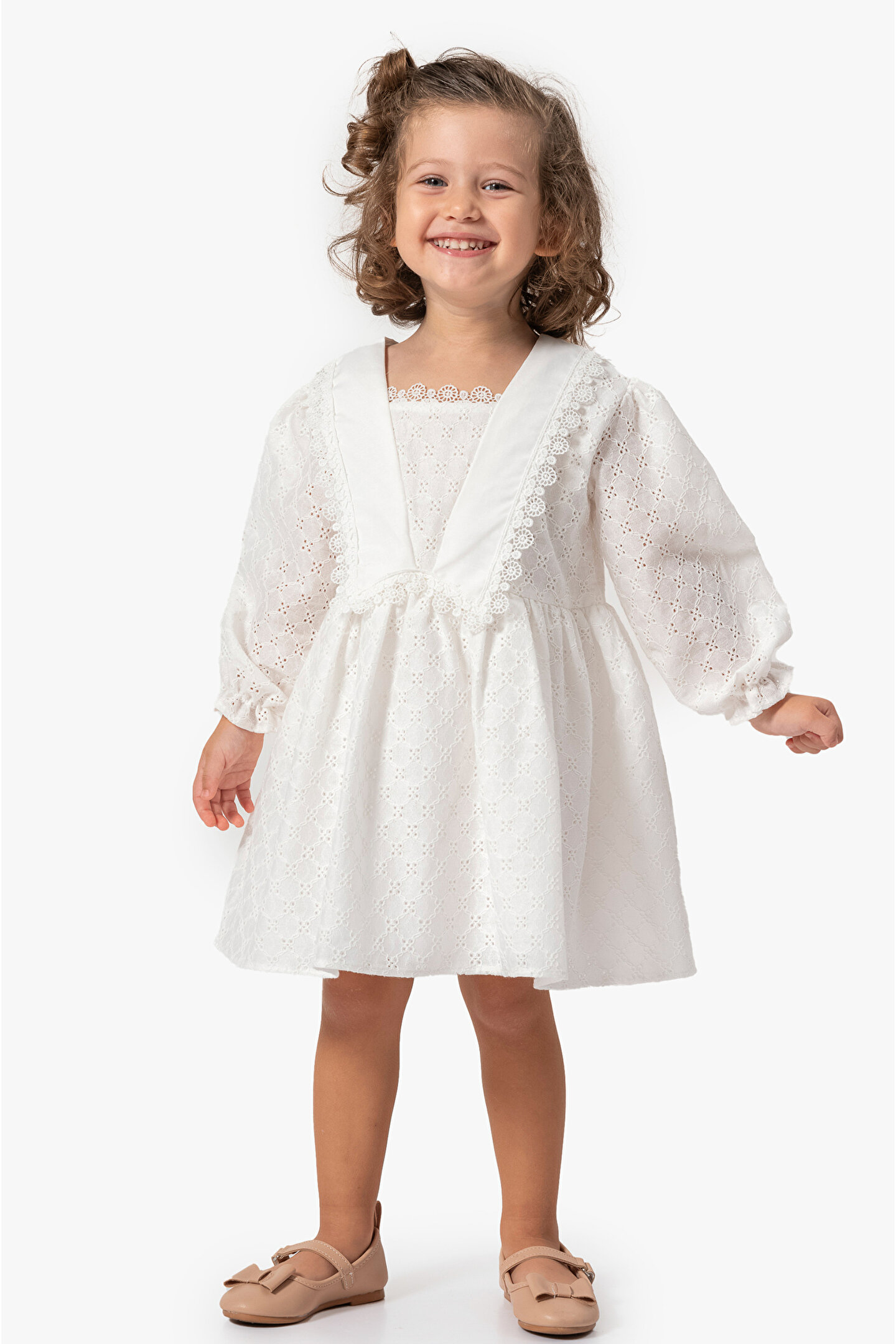 Mevsimlik Uzun Kollu Dantel Detaylı Kız Çocuk Elbisesi: Küçük prensesinizin yaz mevsiminde özel günlerde zarafetini ve şıklığını ön plana çıkaracak bu elbise, önünde bulunan fiyonk detayı ve dantel işlemeleriyle tasarlanmıştır.; Ayrıca etek kısmında bulunan yırtmaç detayı, hareket özgürlüğü sağlarken bebeğinizin zarif bir görünüm sergilemesini sağlar.; Özellikler: Dantel Detaylar: Elbisenin ön kısmında ve kollarda bulunan dantel detaylar, zarafet ve incelik katarken, küçük prensesinizin görünümünü daha etkileyici hale getirir.; Önünde Fiyonk Detayı: Elbisenin ön kısmında bulunan fiyonk detayı, sevimliliği ve şıklığı artırır.; Küçük prensesinizin görünümüne hoş bir dokunuş ekler.; Yırtmaç Detayı: Etek kısmında bulunan yırtmaç detayı, hareket özgürlüğü sağlarken, elbisenin tasarımına dinamizm katar.; Uzun Kollu Tasarım:Rahatlıkla giyilebilecek Uzun kollu tasarım, bebeğinizin serin kalmasını sağlar ve özgürce hareket etmesine olanak tanır.; Mevsimlik Kullanıma Uygun: Hafif yapısı ve nefes alabilen kumaşıyla yaz aylarında rahatlıkla giyilebilir.; Özel Günler İçin Uygun: Özel günlerde tercih edilebilecek şık tasarımıyla bebeğinizin her anında göz kamaştırmasını sağlar.; Bu yırtmaçlı, önü fiyonklu ve dantel detaylı Uzun kollu kız çocuk elbisesi, küçük prensesinizin serin ve şık kalmasını sağlarken, aynı zamanda özel günlerde de zarafetini tamamlar.; Zarif detaylarıyla bezenmiş bu elbise, bebeğinizin tarzını ve güzelliğini ön plana çıkarır.