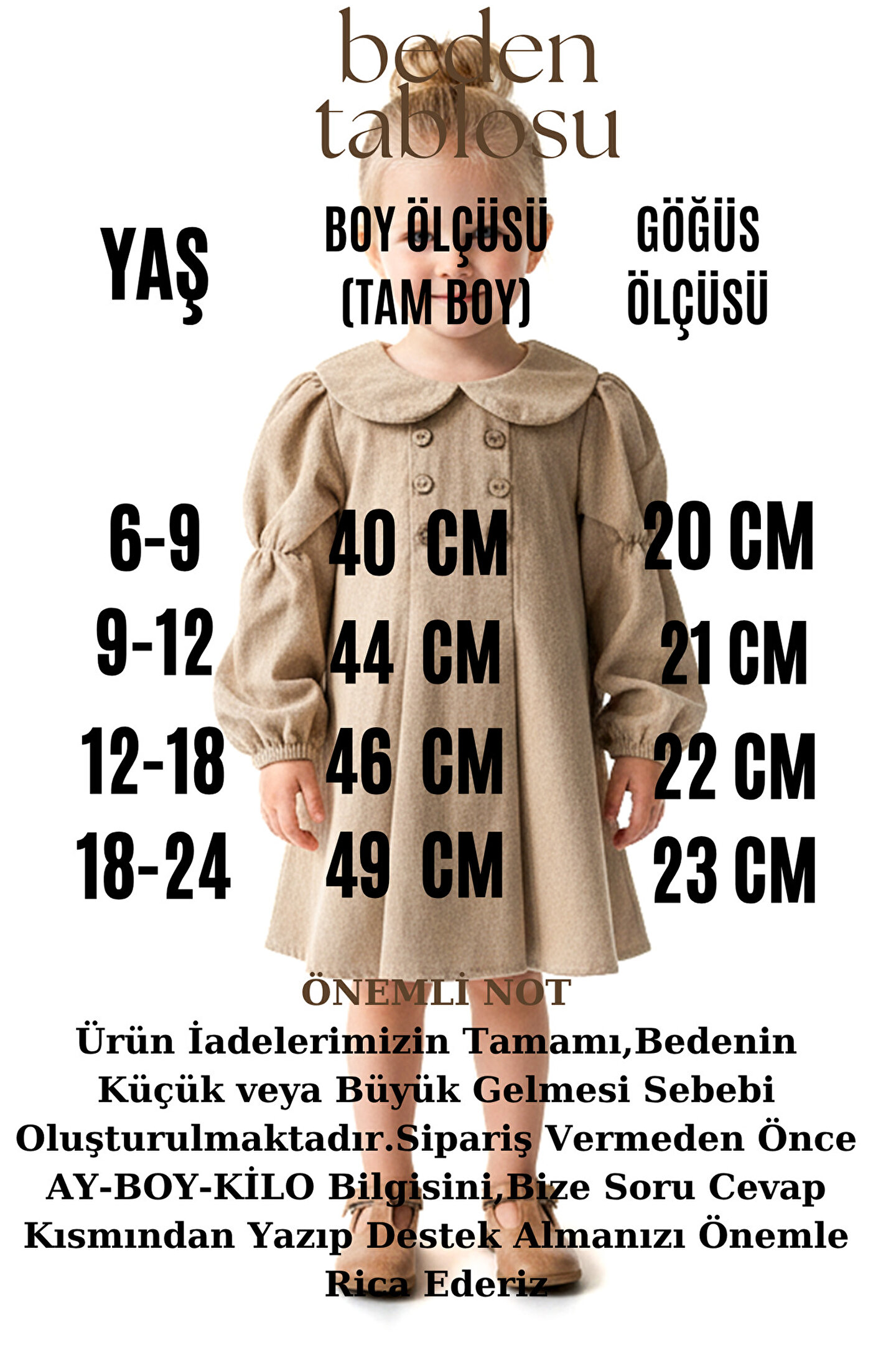 Mevsimlik Uzun Kollu Dantel Detaylı Kız Çocuk Elbisesi: Küçük prensesinizin özel günlerde zarafetini ve şıklığını ön plana çıkaracak bu elbise, önünde bulunan Yakalı fiyonk detayı ve dantel işlemeleriyle tasarlanmıştır.; Özellikler: Dantel Detaylar: Elbisenin ön kısmında ve kollarda bulunan dantel detaylar, zarafet ve incelik katarken, küçük prensesinizin görünümünü daha etkileyici hale getirir.; Önünde Yakalı Fiyonk Detayı: Elbisenin ön kısmında bulunan fiyonk detayı, sevimliliği ve şıklığı artırır.; Küçük prensesinizin görünümüne hoş bir dokunuş ekler.; Uzun Kollu Tasarım:Rahatlıkla giyilebilecek Uzun kollu tasarım, bebeğinizin serin kalmasını sağlar ve özgürce hareket etmesine olanak tanır.; Mevsimlik Kullanıma Uygun: Hafif yapısı ve nefes alabilen kumaşıyla rahatlıkla giyilebilir.; Özel Günler İçin Uygun: Özel günlerde tercih edilebilecek şık tasarımıyla bebeğinizin her anında göz kamaştırmasını sağlar.; Bu önü Yakalı fiyonklu ve dantel detaylı Uzun kollu kız çocuk elbisesi, küçük prensesinizin şık kalmasını sağlarken, aynı zamanda özel günlerde de zarafetini tamamlar.; Zarif detaylarıyla bezenmiş bu elbise, bebeğinizin tarzını ve güzelliğini ön plana çıkarır.