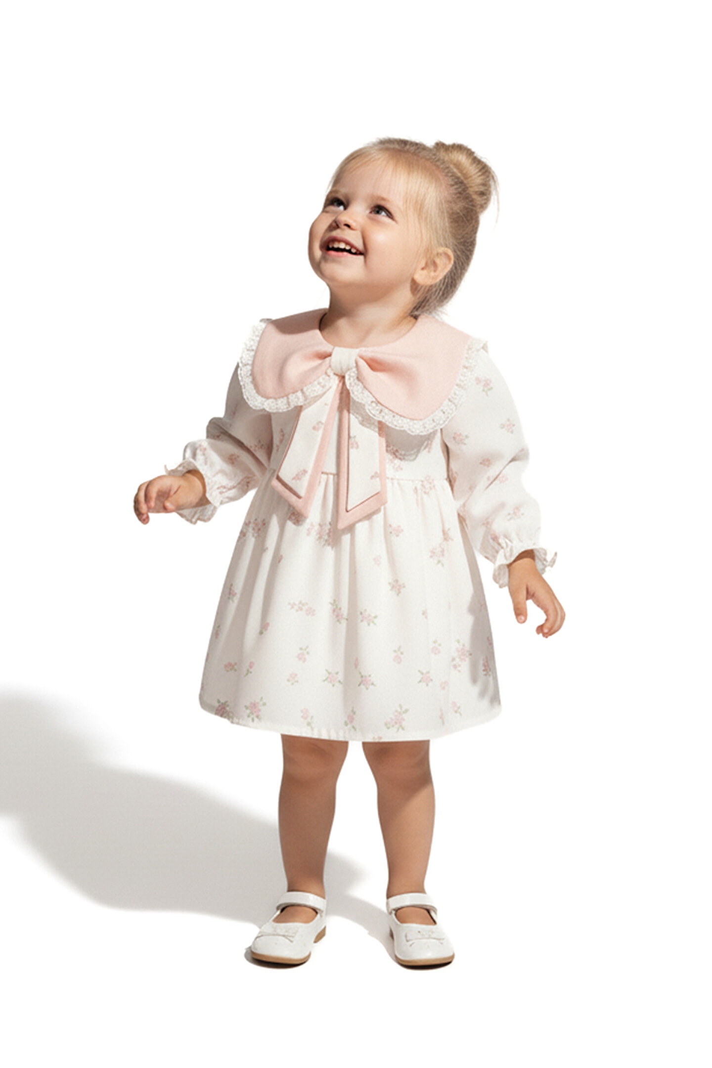 Mevsimlik Uzun Kollu Dantel Detaylı Kız Çocuk Elbisesi: Küçük prensesinizin özel günlerde zarafetini ve şıklığını ön plana çıkaracak bu elbise, önünde bulunan Yakalı fiyonk detayı ve dantel işlemeleriyle tasarlanmıştır.; Özellikler: Dantel Detaylar: Elbisenin ön kısmında ve kollarda bulunan dantel detaylar, zarafet ve incelik katarken, küçük prensesinizin görünümünü daha etkileyici hale getirir.; Önünde Yakalı Fiyonk Detayı: Elbisenin ön kısmında bulunan fiyonk detayı, sevimliliği ve şıklığı artırır.; Küçük prensesinizin görünümüne hoş bir dokunuş ekler.; Uzun Kollu Tasarım:Rahatlıkla giyilebilecek Uzun kollu tasarım, bebeğinizin serin kalmasını sağlar ve özgürce hareket etmesine olanak tanır.; Mevsimlik Kullanıma Uygun: Hafif yapısı ve nefes alabilen kumaşıyla rahatlıkla giyilebilir.; Özel Günler İçin Uygun: Özel günlerde tercih edilebilecek şık tasarımıyla bebeğinizin her anında göz kamaştırmasını sağlar.; Bu önü Yakalı fiyonklu ve dantel detaylı Uzun kollu kız çocuk elbisesi, küçük prensesinizin şık kalmasını sağlarken, aynı zamanda özel günlerde de zarafetini tamamlar.; Zarif detaylarıyla bezenmiş bu elbise, bebeğinizin tarzını ve güzelliğini ön plana çıkarır.