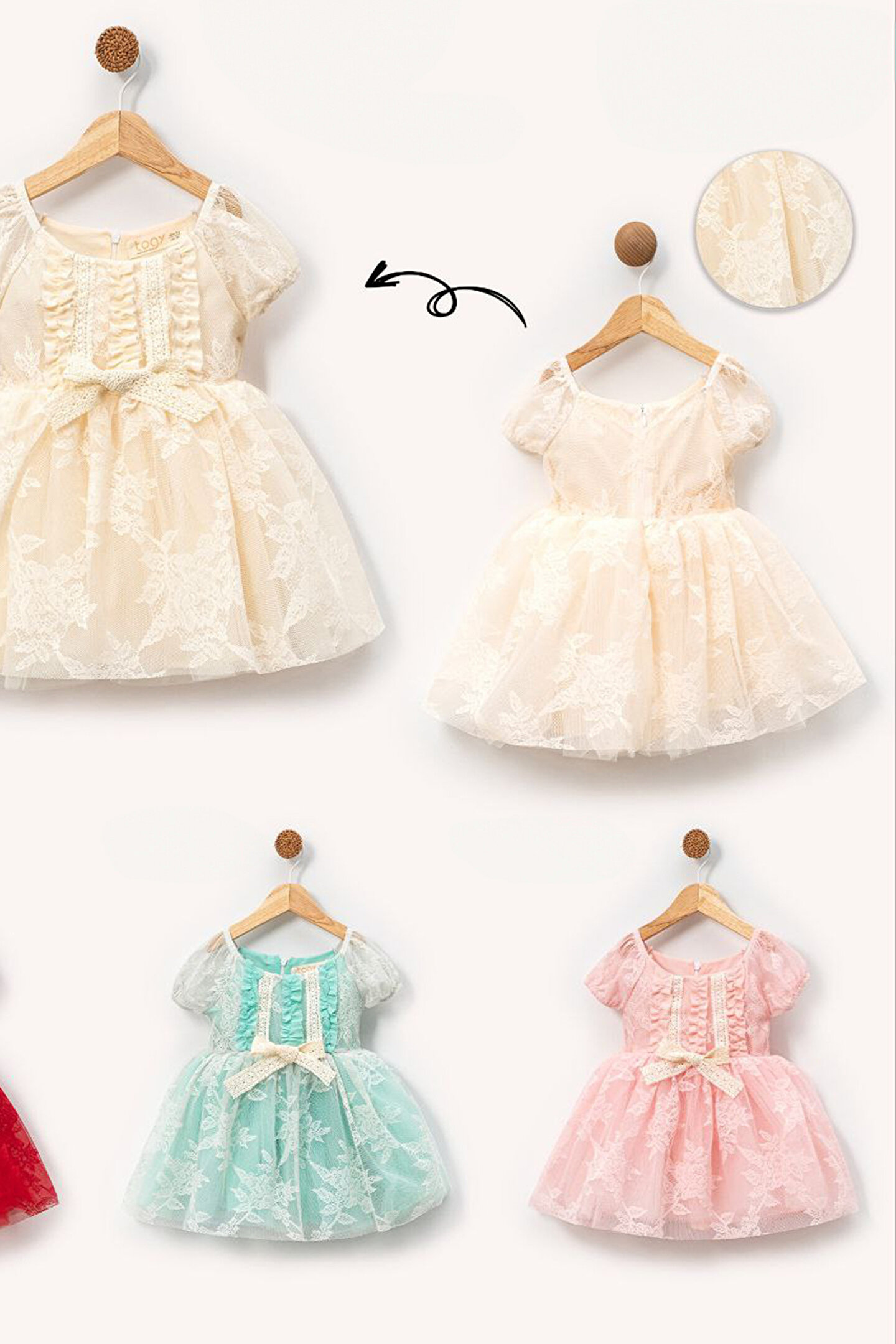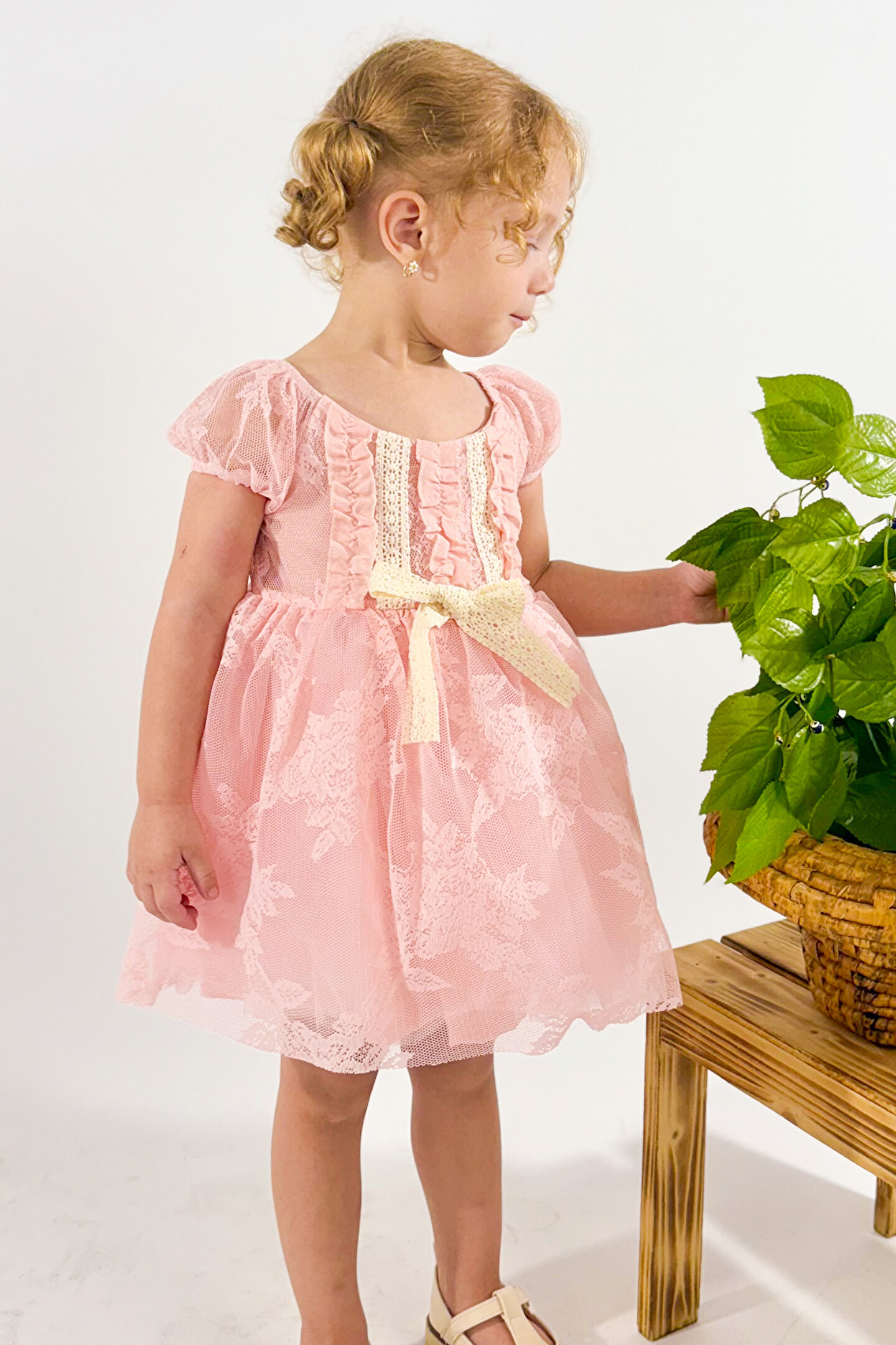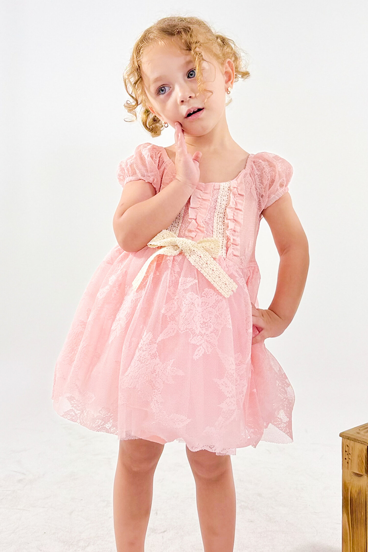 Yazlık Kısa Kollu Kolsuz Askılı Dantel Detaylı Astarlı Kız Çocuk Elbisesi: Küçük prensesinizin yaz mevsiminde özel günlerde zarafetini ve şıklığını ön plana çıkaracak bu elbise, önünde bulunan fiyonk detayı ve dantel işlemeleriyle tasarlanmıştır.; Ayrıca etek kısmında bulunan yırtmaç detayı, hareket özgürlüğü sağlarken bebeğinizin zarif bir görünüm sergilemesini sağlar.; Özellikler: Dantel Detaylar: Elbisenin ön kısmında ve kollarda bulunan dantel detaylar, zarafet ve incelik katarken, küçük prensesinizin görünümünü daha etkileyici hale getirir.; Önünde Fiyonk Detayı: Elbisenin ön kısmında bulunan fiyonk detayı, sevimliliği ve şıklığı artırır.; Küçük prensesinizin görünümüne hoş bir dokunuş ekler.; Yırtmaç Detayı: Etek kısmında bulunan yırtmaç detayı, hareket özgürlüğü sağlarken, elbisenin tasarımına dinamizm katar.; Kısa Kollu Tasarım: Sıcak yaz günlerinde rahatlıkla giyilebilecek kısa kollu tasarım, bebeğinizin serin kalmasını sağlar ve özgürce hareket etmesine olanak tanır.; Yazlık Kullanıma Uygun: Hafif yapısı ve nefes alabilen kumaşıyla yaz aylarında rahatlıkla giyilebilir.; Özel Günler İçin Uygun: Özel günlerde tercih edilebilecek şık tasarımıyla bebeğinizin her anında göz kamaştırmasını sağlar.; Bu yırtmaçlı, önü fiyonklu ve dantel detaylı kısa kollu Kolsuz Askılı kız çocuk elbisesi, küçük prensesinizin yazın serin ve şık kalmasını sağlarken, aynı zamanda özel günlerde de zarafetini tamamlar.; Zarif detaylarıyla bezenmiş bu elbise, bebeğinizin tarzını ve güzelliğini ön plana çıkarır.