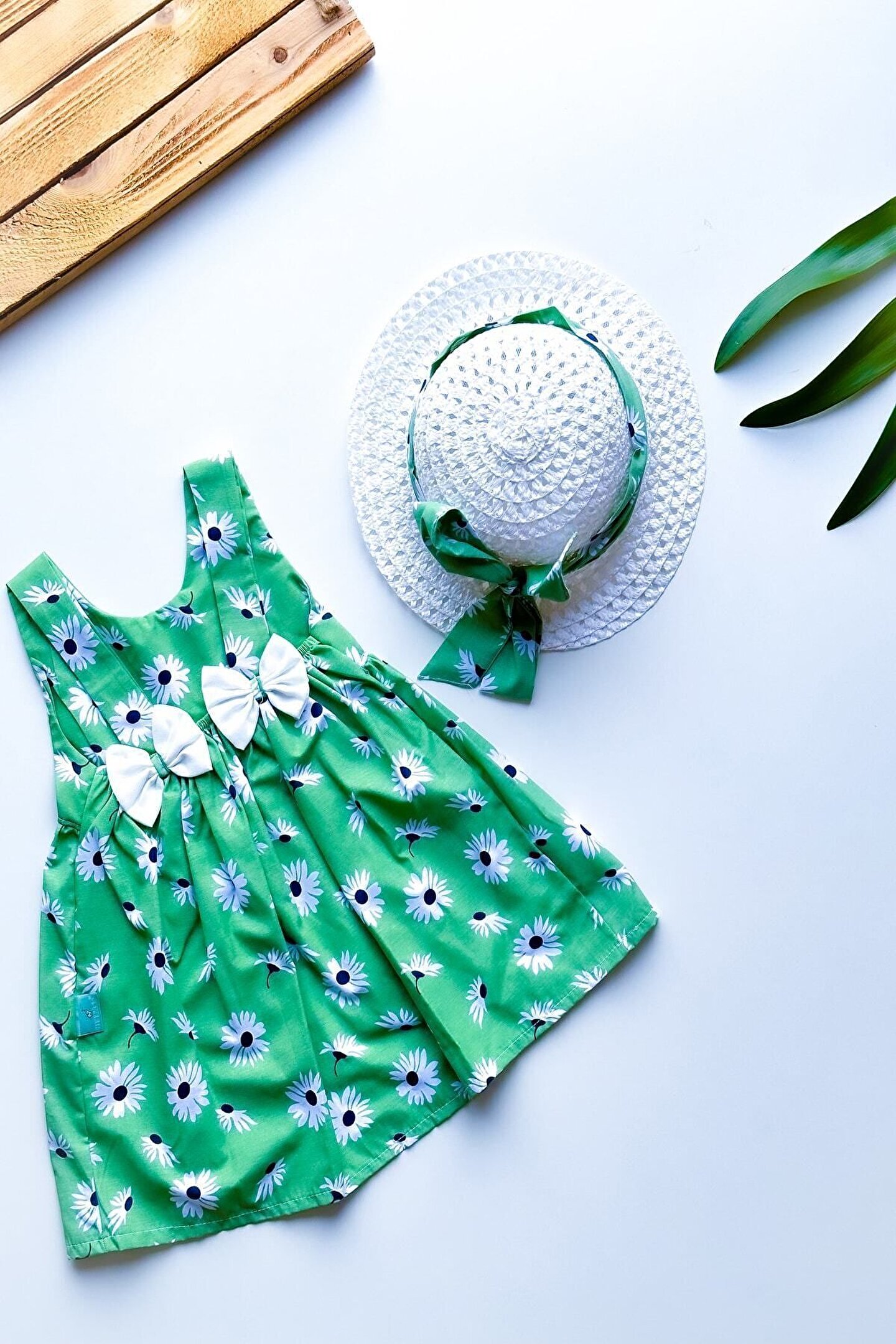 Bisiklet yakası ile rahat bir kullanım sunan bu elbise, bebeğinizin gün boyu konforunu düşünerek tasarlanmıştır.; Design koleksiyonunun bir parçası olan bu takım, şık tasarımıyla göz alıcı bir görünüm sağlar.; Regular boy kesimi ile her türlü aktiviteye uyum sağlayacak şekilde dizayn edilmiştir.; Günlük kullanıma uygun olan bu takım, hem rahatlık hem de stil sahibi bir görünüm arayan ebeveynlerin tercihi olur.; Askılı kol boyu sayesinde yaz aylarında serinlik sağlayarak bebeğinizin konforunu artırır.; Bebek yaş grubuna özel olarak üretilmiş olup, tüm yaş gruplarına hitap eden geniş beden skalasıyla her büyüme evresinde kullanılabilirlik sunar.; Comfort kalıbı ile bebeğinizin hareket özgürlüğünü kısıtlamaz ve gün boyu rahat bir kullanım vaat eder.; Dokuma kumaş tipi dayanıklılık ve estetik görünümü bir arada sunarak uzun süreli kullanım imkanı verir.; Aksesuar detaylarıyla zenginleştirilmiş bu takım, şapkasının papatya motifleriyle neşeli bir stil katmaktadır.; Düz deseniyle sade ama etkileyici bir görünüm sergilerken, orta kalınlığa sahip kumaşı mevsim geçişlerinde ideal sıcaklık dengesini korur.; Yeşilin canlı tonuyla dikkat çeken renk seçeneği, bebek gardırobuna taze bir soluk getirir.;