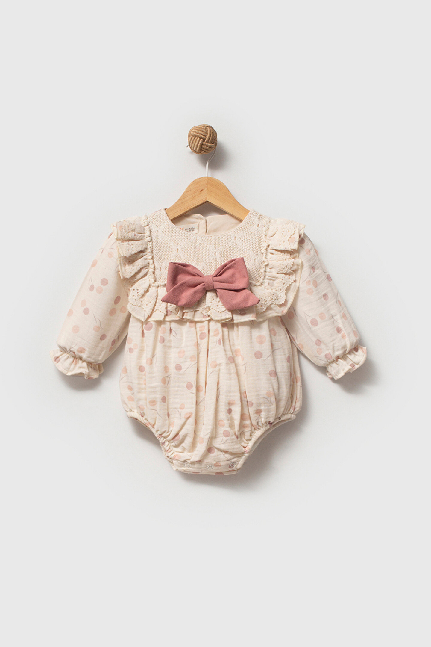 Mevsimlik Uzun Kollu Dantel Detaylı Kız Çocuk Elbise Romper: Küçük prensesinizin yaz mevsiminde özel günlerde zarafetini ve şıklığını ön plana çıkaracak bu elbise Romper, önünde bulunan fiyonk detayı ve dantel işlemeleriyle tasarlanmıştır.; Ayrıca etek kısmında bulunan yırtmaç detayı, hareket özgürlüğü sağlarken bebeğinizin zarif bir görünüm sergilemesini sağlar.; Özellikler: Dantel Detaylar: Elbisenin Romper ön kısmında ve kollarda bulunan dantel detaylar, zarafet ve incelik katarken, küçük prensesinizin görünümünü daha etkileyici hale getirir.; Önünde Fiyonk Detayı: Elbisenin ön kısmında bulunan fiyonk detayı, sevimliliği ve şıklığı artırır.; Küçük prensesinizin görünümüne hoş bir dokunuş ekler.; Yırtmaç Detayı: Etek kısmında bulunan yırtmaç detayı, hareket özgürlüğü sağlarken, elbisenin tasarımına dinamizm katar.; Uzun Kollu Tasarım:Rahatlıkla giyilebilecek Uzun kollu tasarım, bebeğinizin serin kalmasını sağlar ve özgürce hareket etmesine olanak tanır.; Mevsimlik Kullanıma Uygun: Hafif yapısı ve nefes alabilen kumaşıyla rahatlıkla giyilebilir.; Özel Günler İçin Uygun: Özel günlerde tercih edilebilecek şık tasarımıyla bebeğinizin her anında göz kamaştırmasını sağlar.; Bu yırtmaçlı, önü fiyonklu ve dantel detaylı Uzun kollu kız çocuk elbisesi Romper, küçük prensesinizin serin ve şık kalmasını sağlarken, aynı zamanda özel günlerde de zarafetini tamamlar.; Zarif detaylarıyla bezenmiş bu elbise Romper, bebeğinizin tarzını ve güzelliğini ön plana çıkarır.