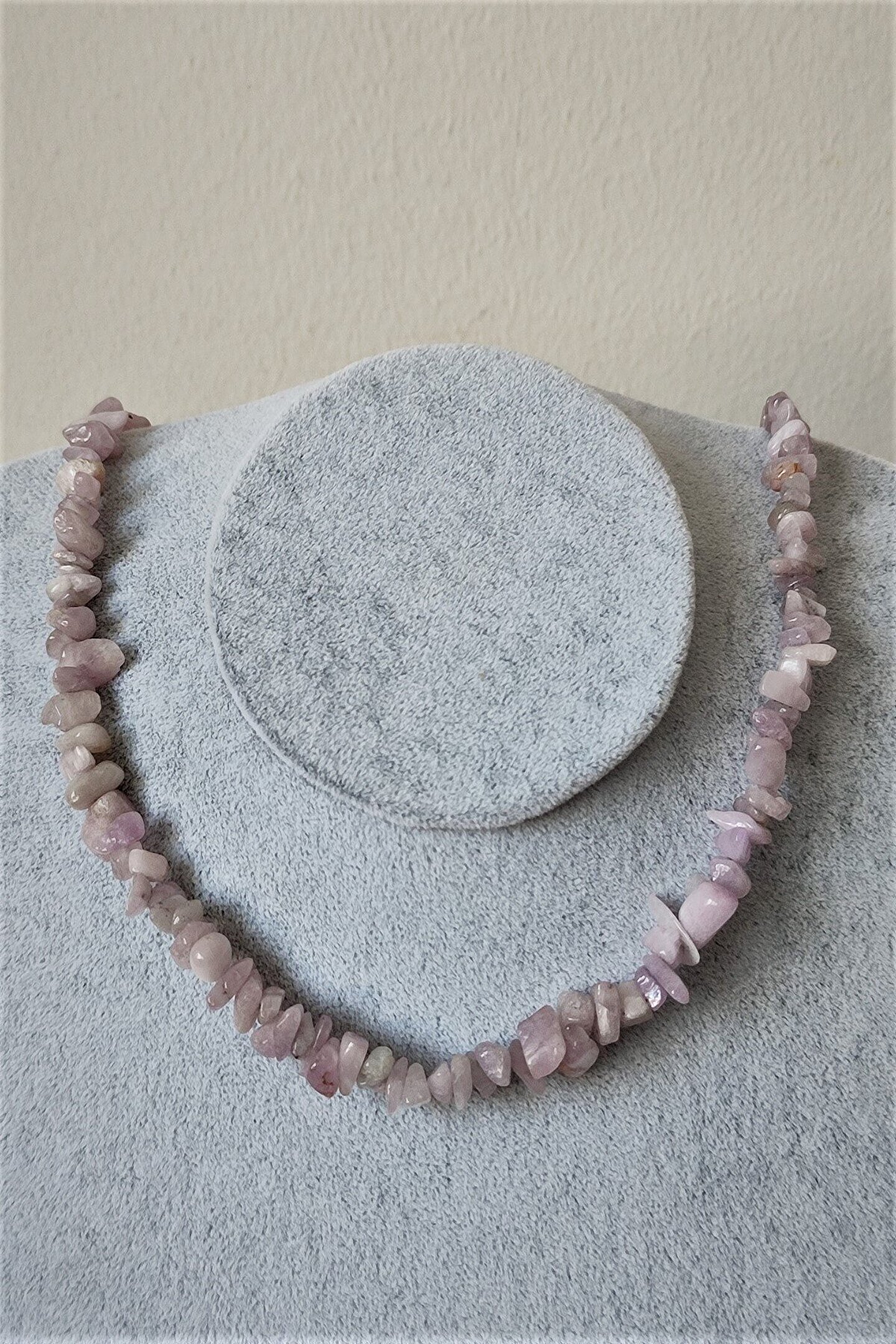 Doğal taş kullanımı sayesinde her kolye benzersiz ve otantik bir görünüm sunar; Sertifikalı kunzit kırıktaş doğaltaş, hem estetik hem de dayanıklılık açısından öne çıkar; Bijuteri kolye, zarif tasarımıyla günlük kullanımda şıklığınızı tamamlar;