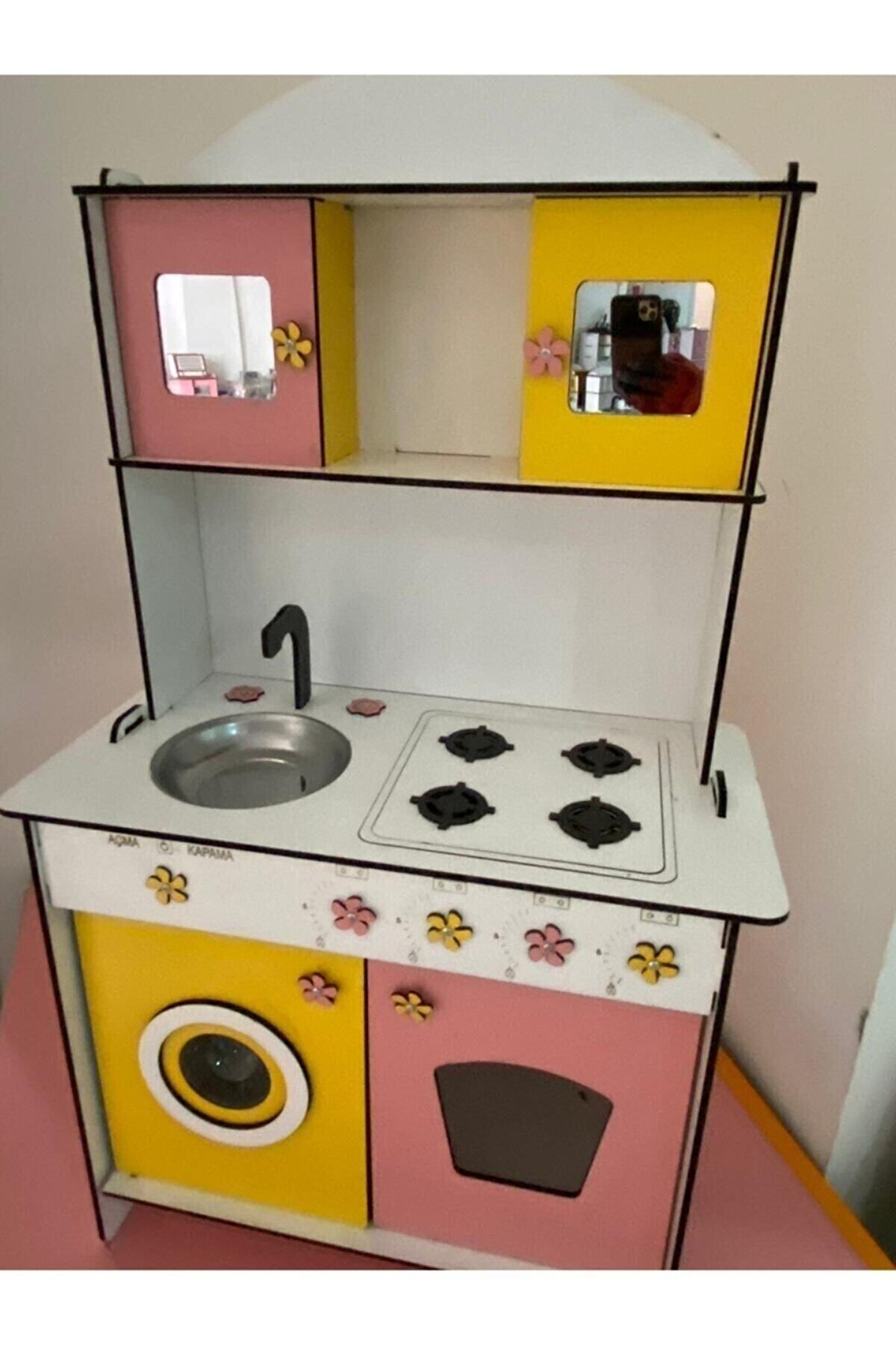 Ürün kendi imalatımız olup 6 mm MDF'den üretilmektedir. ; 106x60 ölçülerinde çocuğun ayakta rahatlıkla oynayabileceği boyuttadır ; Çocukların motor becerileri ve hayal güçleri gelişimini destekleyen harika tasarım gelişim oyuncağıdır ; Ürünümüzü sipariş verdikten sonra msj ile renk belirtebilirsiniz, renk belirtilmezse görseldeki ürünün aynısı gönderilir. ; Doğum günü hediyesi olarak tercih edilen ürünler arasındadır. Evcilik oyuncakları , oyuncak mutfak setleri, eğitici oyuncaklar , kız çocuk oyuncakları alanında tercih edildiği gibi erkek çocuklar içinde oldukça talep gören bir oyuncaktır. ; Kargoda veya kurulum sırasında oluşabilecek kazara kırılma veya deformasyon olması durumunda hasarlı parçalar firmamız tarafından ücretsiz bir şekilde gönderilmektedir, hasarlı parçanın görselini atmanız yeterlidir. ; Not; ürün özellikleri, ölçüler ve kullanılan malzemeler açıkça belirtilmiştir. Ürün iadesi kabul edilmemektedir buna göre sipariş verilmesini rica ederiz. ; İSTEĞE BAĞLI OLARAK KAPAKLARA 30 TL EK ÜCRET İLE AYNALI PLEKSİ TAKILABİLİR. ;