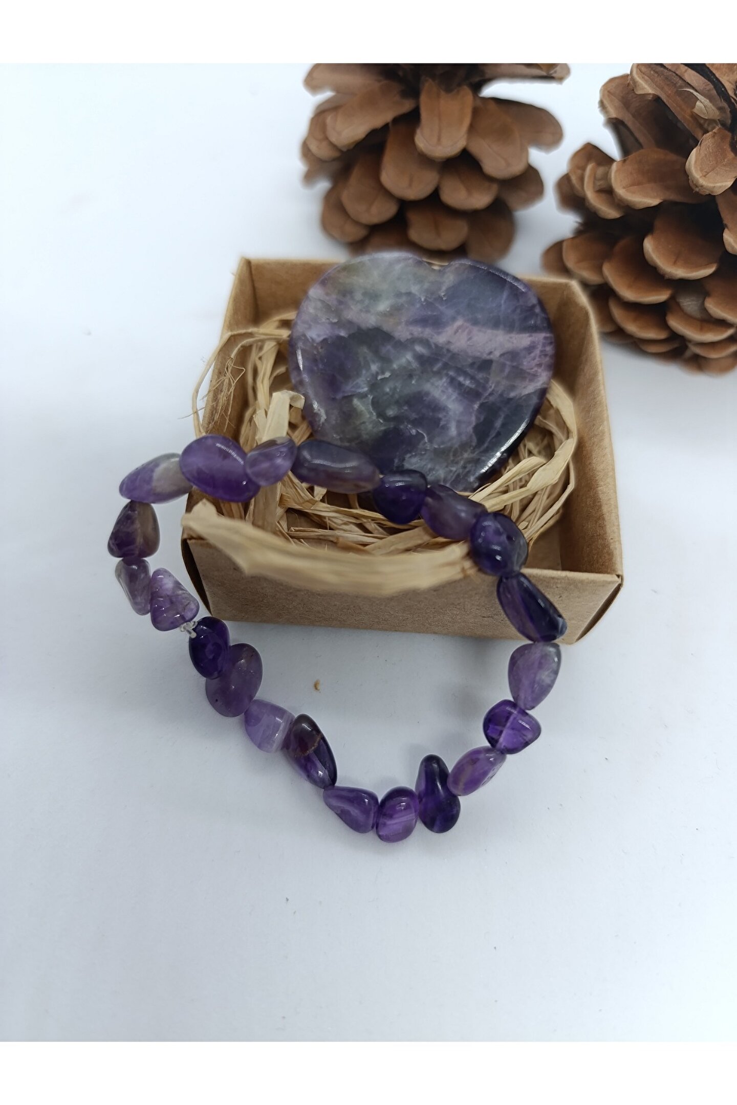 Görseldegördüğünüz ametist taşı kalp biblo ve tımbıl bileklik görselde görülen kutuiçerisinde gönderilecektir.