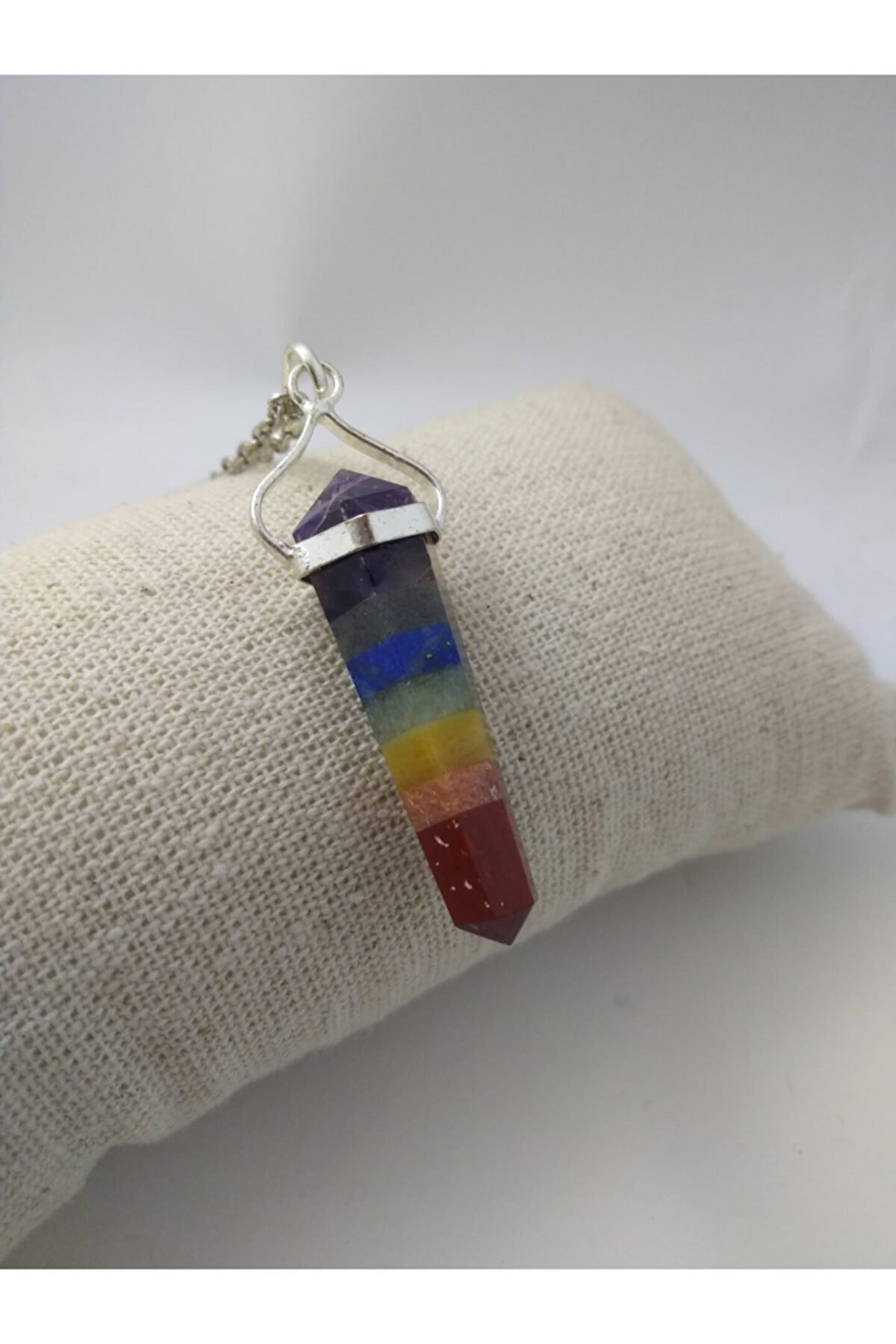 Çakra taşı kolye/ pandül şeklinde doğaltaş kolye Çakralar, bedenimizde bulunan enerji merkezleridir. Çakra sistemindeki temel amaç bedenin enerji merkezlerini harekete geçirerek sağlıklı çalışmasını sağlamak, ruhsal ve bedensel bütünlüğü oluşturmaktır. Ürünün özellikler I; Ürünlerimiz gerçek doğal taş olup pandül şekli ile tasarlanmıştır. Gövde kısmındaki metal gümüş olup, zincir gümüş değildir. Çakra kolyeleri, değişik 7 renkten oluşur. Her bir renk bir çakra katmanını simgeler. Ürünümüzde kullanılan çarka taşları; ametist, oniks, lapis lazuli,aventurin, sitsin, akik, jasper Ürünümüz size hediye kutusu içinde gönderilecektir. Parfüm, alkol v.B. Gibi maddeler ile temasından kaçınılmalıdır. Boyutu yaklaşık 3,5 cm'dir. 50-55 cm uzun zincir ile gönderim yapılır. Paket içeriği: 1 adet