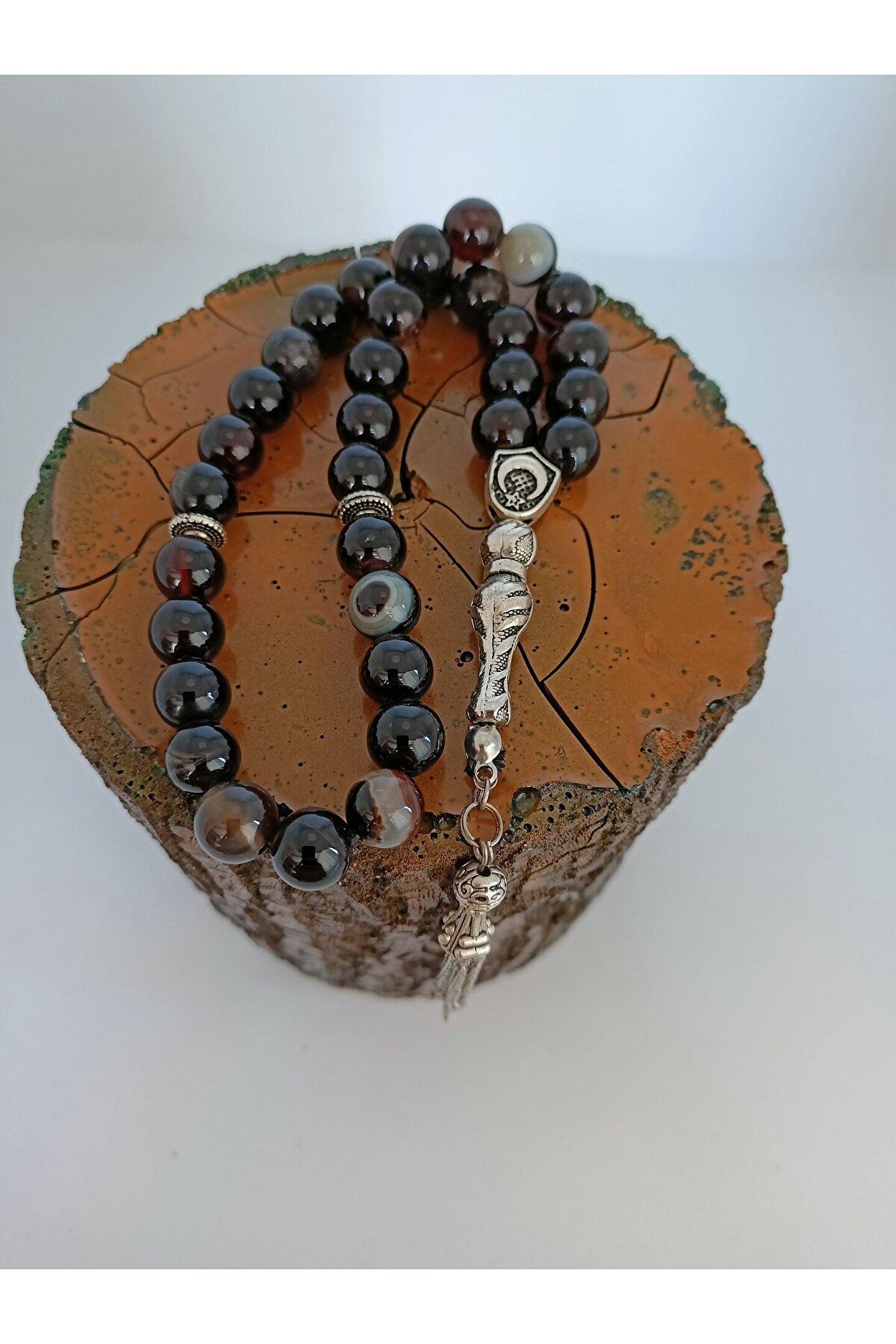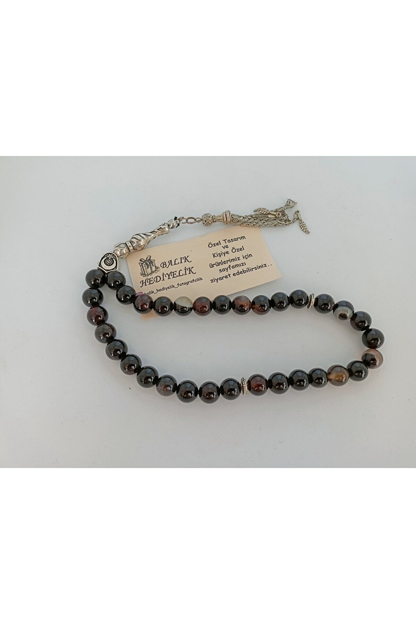 SİYAH AKİK TAŞITESPİH Ahşap Kutulu / 10 mm DOĞALTAŞ TESPİH-1021 AKİK TAŞI (Stres Taşı): Akik taşının en bilinen faydası kişiyi ruhsal açıdankorumasıdır. Güçlü bir enerjisi olan butaş gerginliği ve stresi azaltarak kişinin uyumsuzluklarını en aza indirir. Hamilelikte anneve bebek sağlığı için faydalıdır. Aynı zamanda dünyevibaşarıya yardımcı olarak kişiyi yorgunluktan ve tükenmiş hissetme duygusundanuzaklaştırır. Bunun yanı sıra ağrıları azalttığı, cilde ve kemiklere iyigeldiğine inanılmaktadır. Şifası ve kişiye hissettirdiği maneviyat nedeniyleoldukça tercih edilmektedir. Ürünün Özellikleri; Ürünlerimiz gerçek doğaltaş ile hazırlanmıştır. Mumlu ipe dizili olup, sarkma veya kopma yapmaz. Tespihtane boyutu 10 mm ve küre kesimdir. Doğaltaş tespih 33’lü olup, istediğiniz püskül modelini tercih edebilirsiniz . Sadece bize bildirmeniz yeterli. Ürün size görselde gördüğünüz ahşap hediye kutusu içerisinde gönderilecektir.