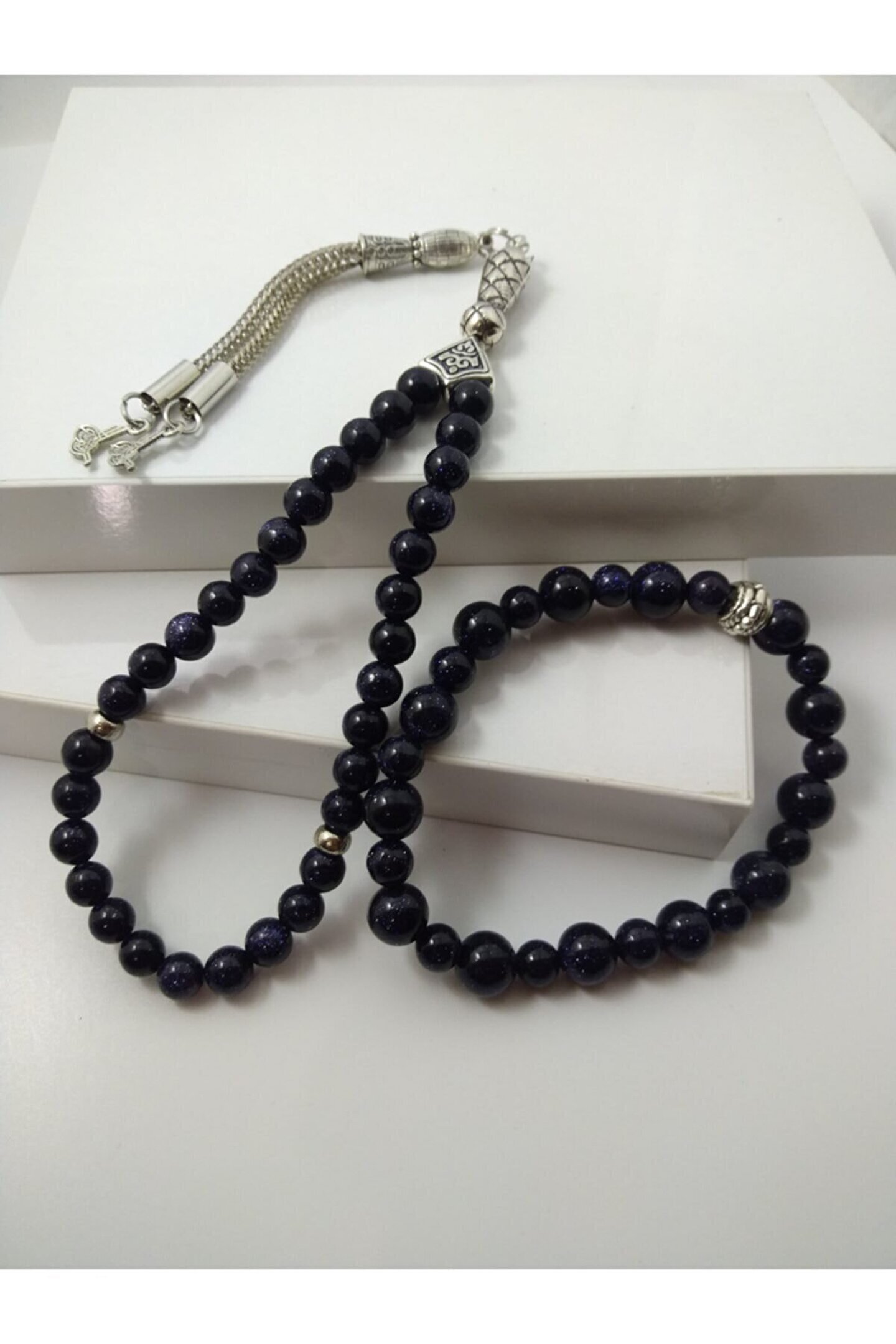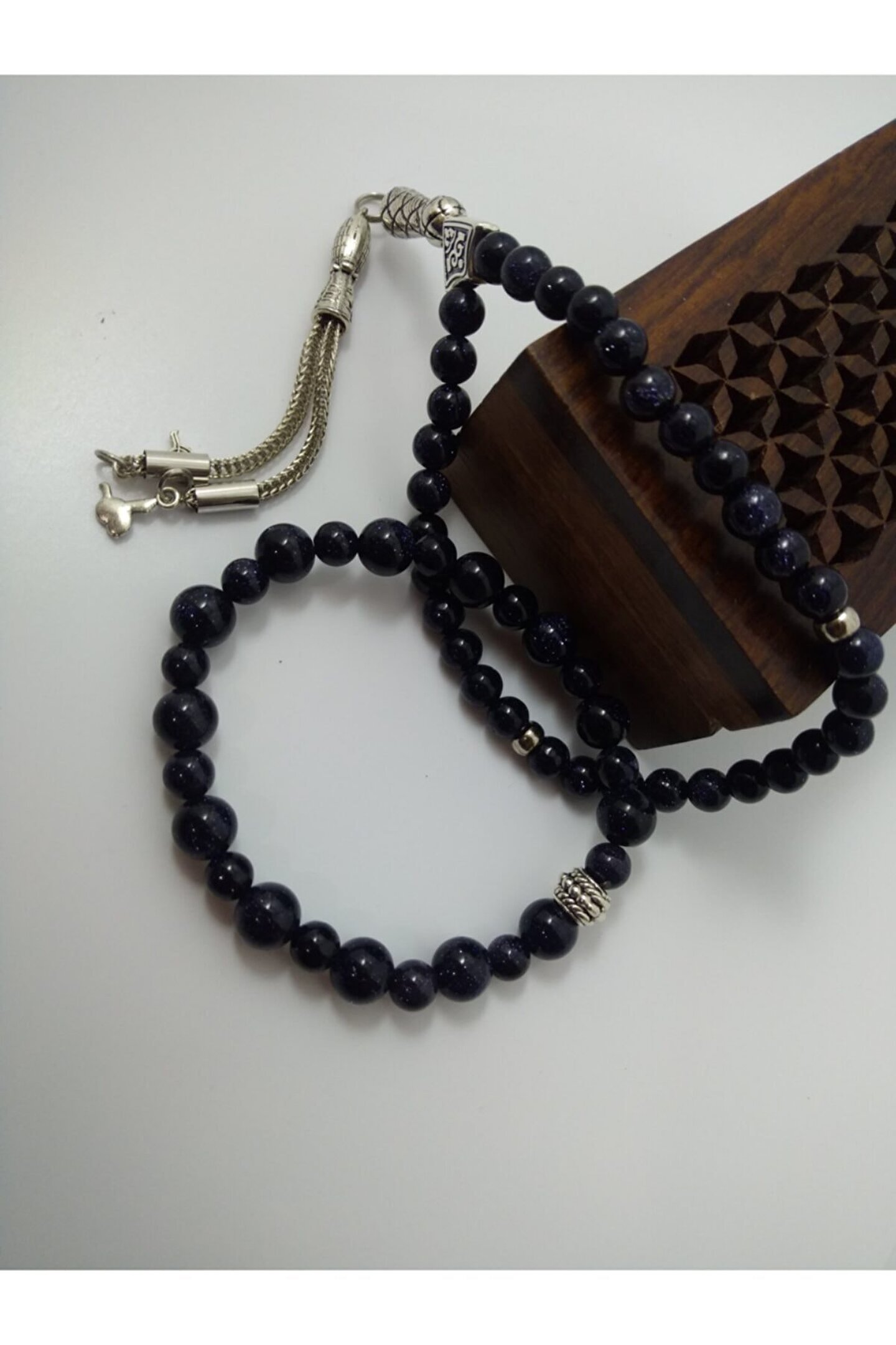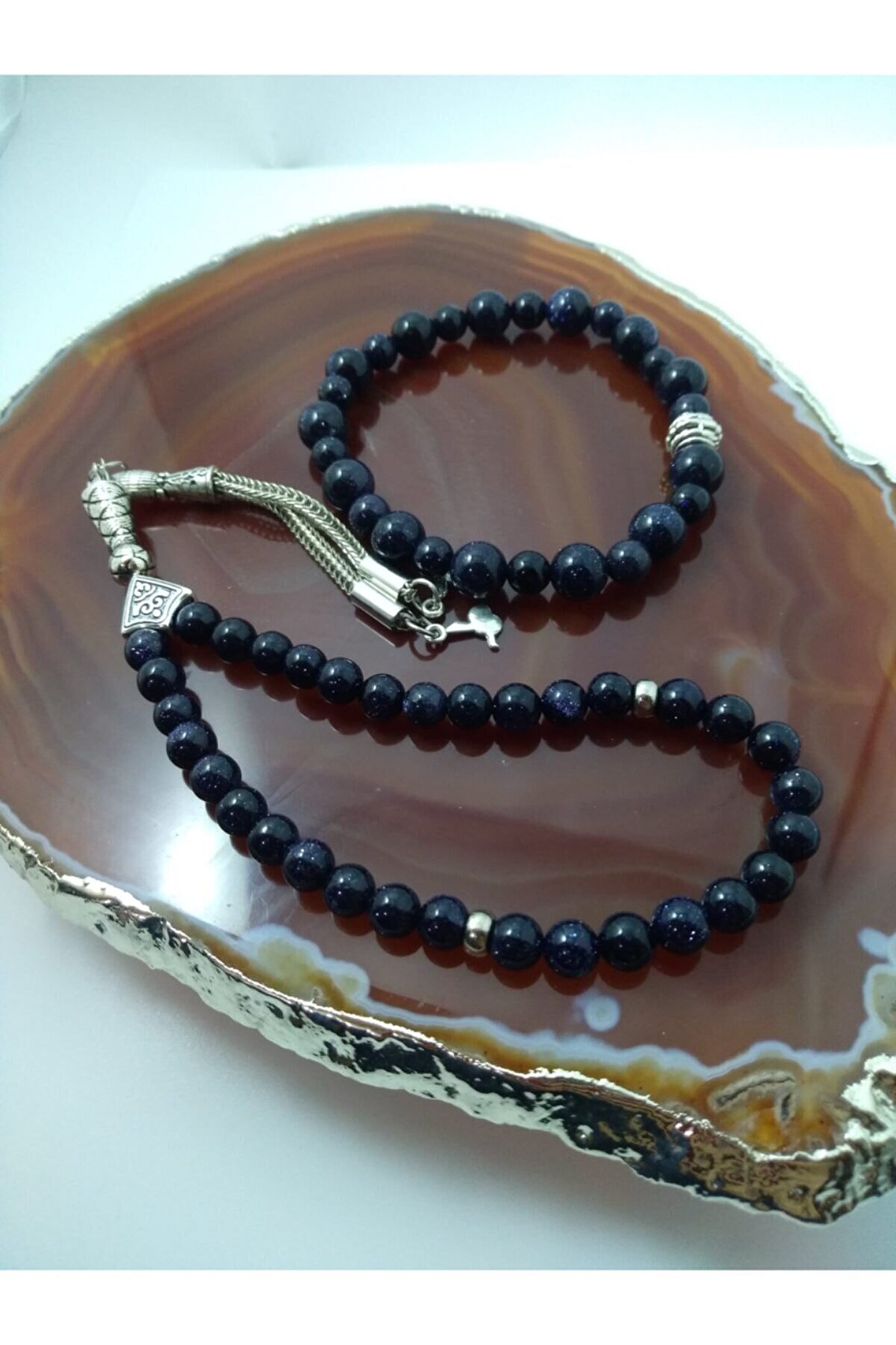YILDIZ TAŞI TESPİH VE BİLEKLİK TAKIM / DOĞALTAŞ TESPİH-BİLEKLİK TAKIM YILDIZ TAŞI(Aşk ve Neşe Taşı): Yıldız taşının faydalarından en bilineni kişinin açık yürekliliğini sembolize eder.Hayal taşı olarak da bilinir. Enerji gücü çok yüksek bir taştır. Sert görünümlü insanların görünüşleri ve duygularında yumuşama sağladığı bilinmektedir. Kişiye neşe, mutluluk, huzur ve yaşama sevinci verdiğine inanılır. Ürünün Özellikleri; Ürünlerimiz gerçek doğal taş ile hazırlanmıştır. “Tane boyutu 8 mm ve küre kesimdir.” *Doğaltaş tespih 33’lü olup, istediğiniz püskül modelini tercih edebilirsiniz. Sadece bize bildirmeniz yeterli. *Bileklik bedenleri standart olup, lastikli misina ile hazırlanır. Bileklik ebatları sabit olup(17-18 cm) yedek taş ve misina ile gönderilmektedir. Görselde gördüğünüz ürün size lazer kesim ahşap kutu içerisinde gönderilecektir. Paket İçeriği: 1 Ad. 33’lü Tespih+1 Ad. Bileklik+1 Ad. Ahşap Tespih Kutusu