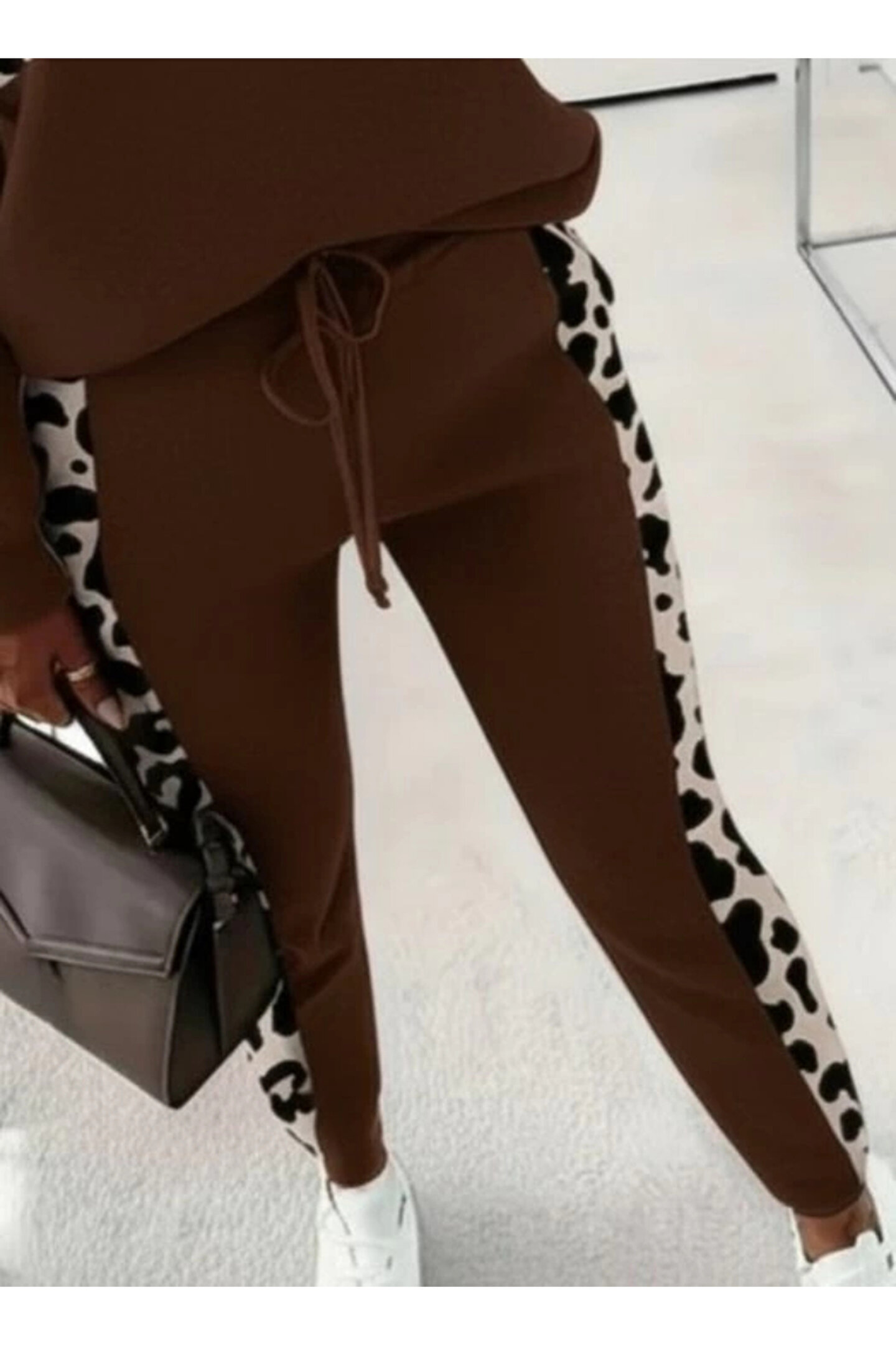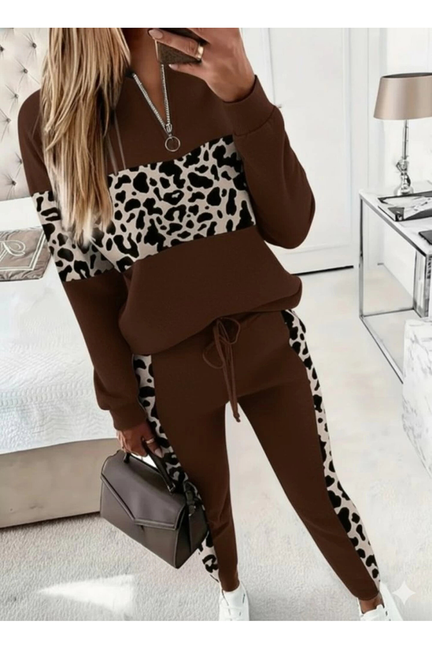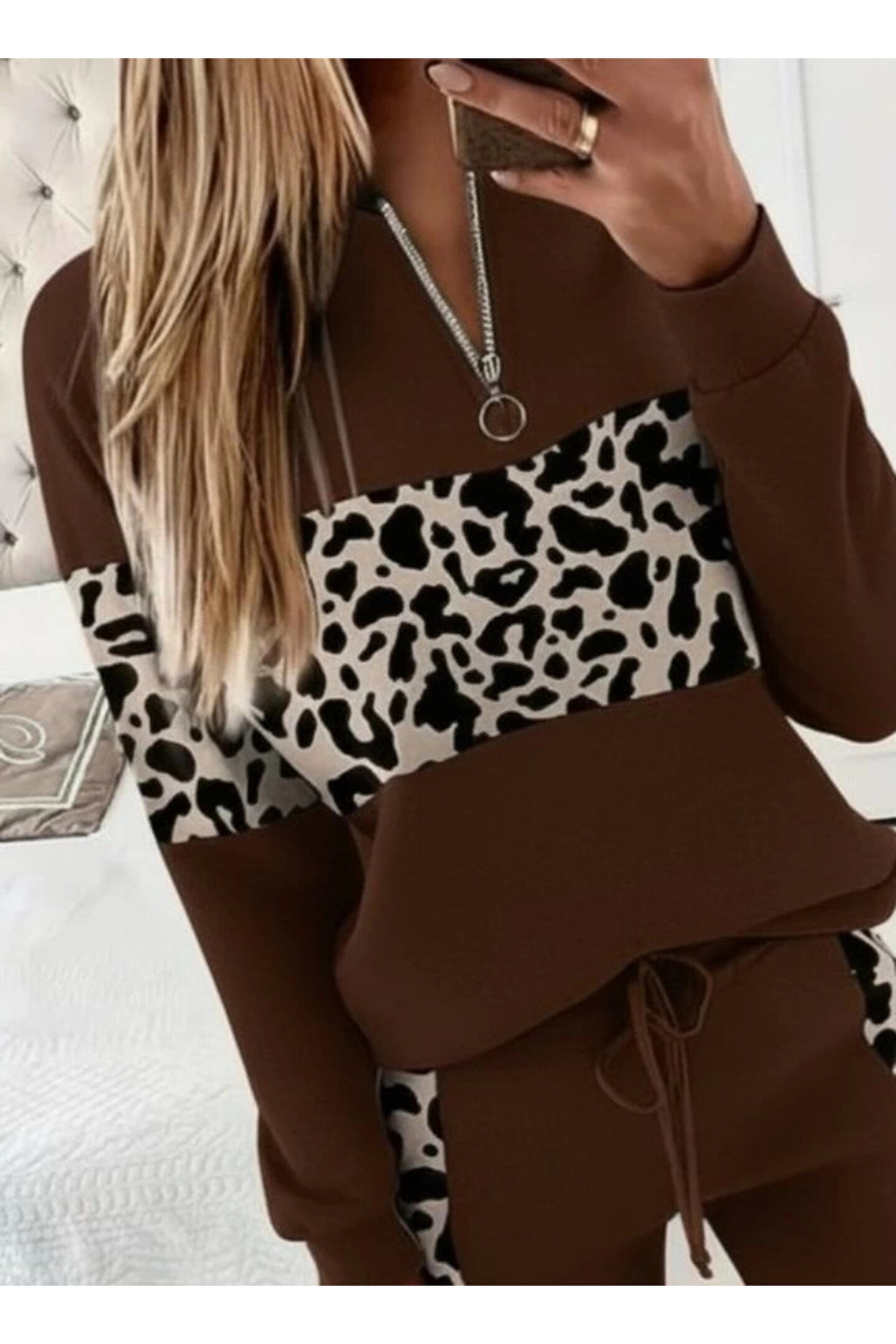Kadın Uzun Kollu Fermuarlı Karışık Desenli Viskon Iki Iplik Bluz Ve Pantolon Ikili Takım