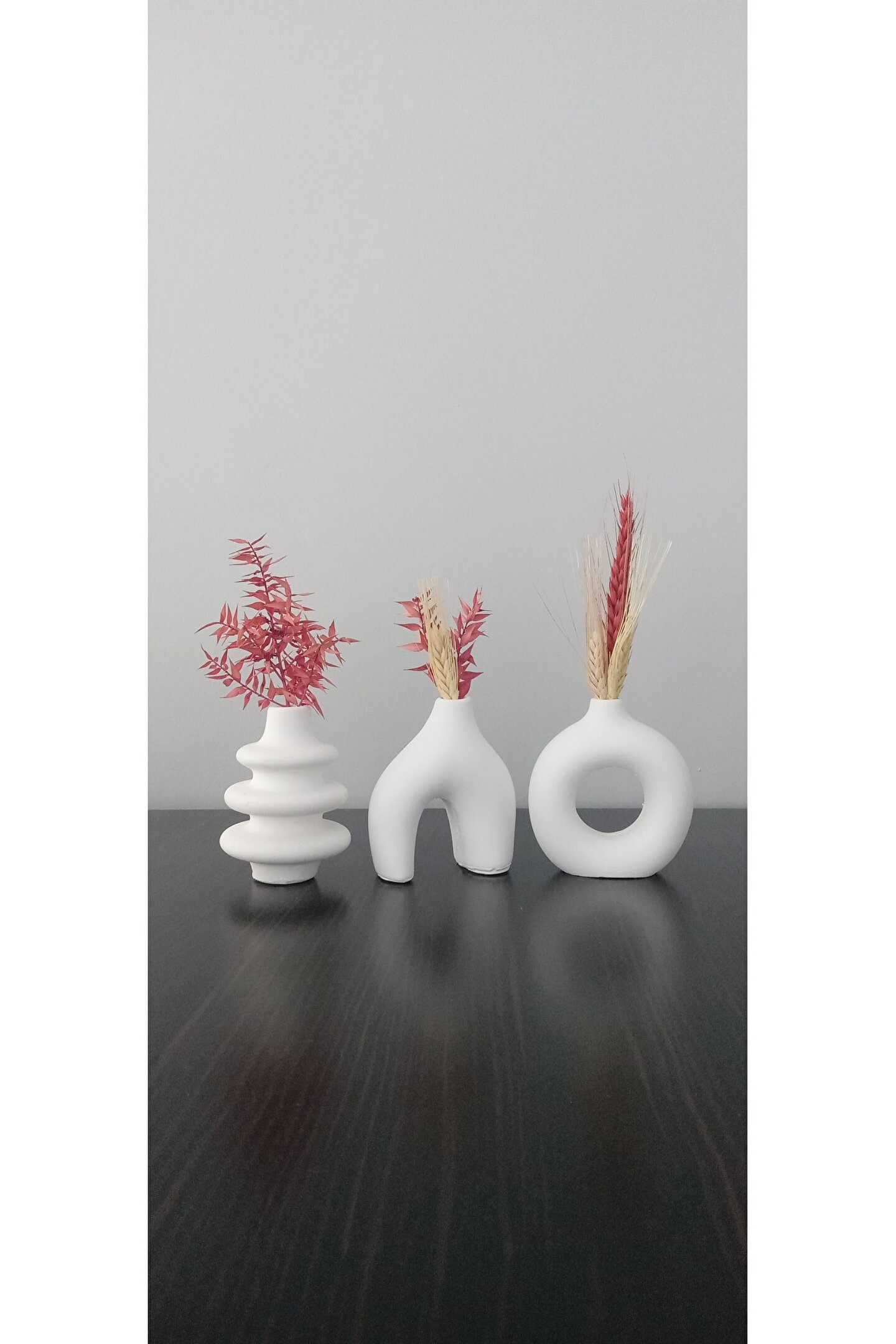 Ürün içeriği 3 adet minimal vazodur. ; Ürün ölçüleri yükseklik 10 cm çap 8 cmdir. ; Ürün alçı taş tozu karışımından yapılmaktadır. ; Patpat ve kutulanarak gönderilir. ; Kırılma tehlikesi minimuma indirilir. ; Ürün tek renktir. ; Rengi kırık beyazdır. ; Ürünler yıpranmaya dayanıklıdır. ; Solma dökülme yapmaz. ; Hafif nemli toz bezi ile rahatça temizlenir. ; Estetik duruşu ile evinizin her köşesine uyacaktır. ; Kuru çiçekler için kullanışlıdır. ; Suyla teması önerilmez.;