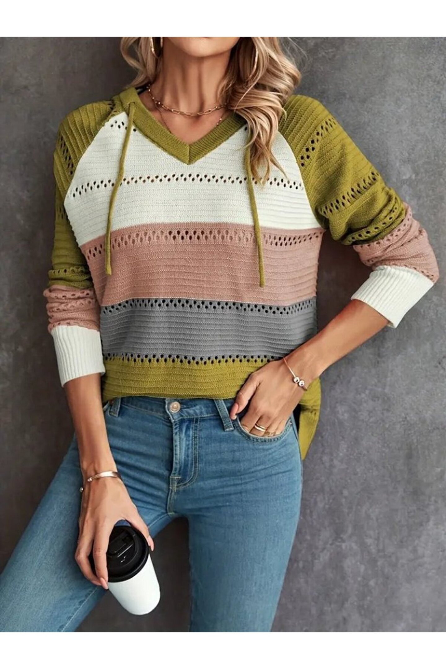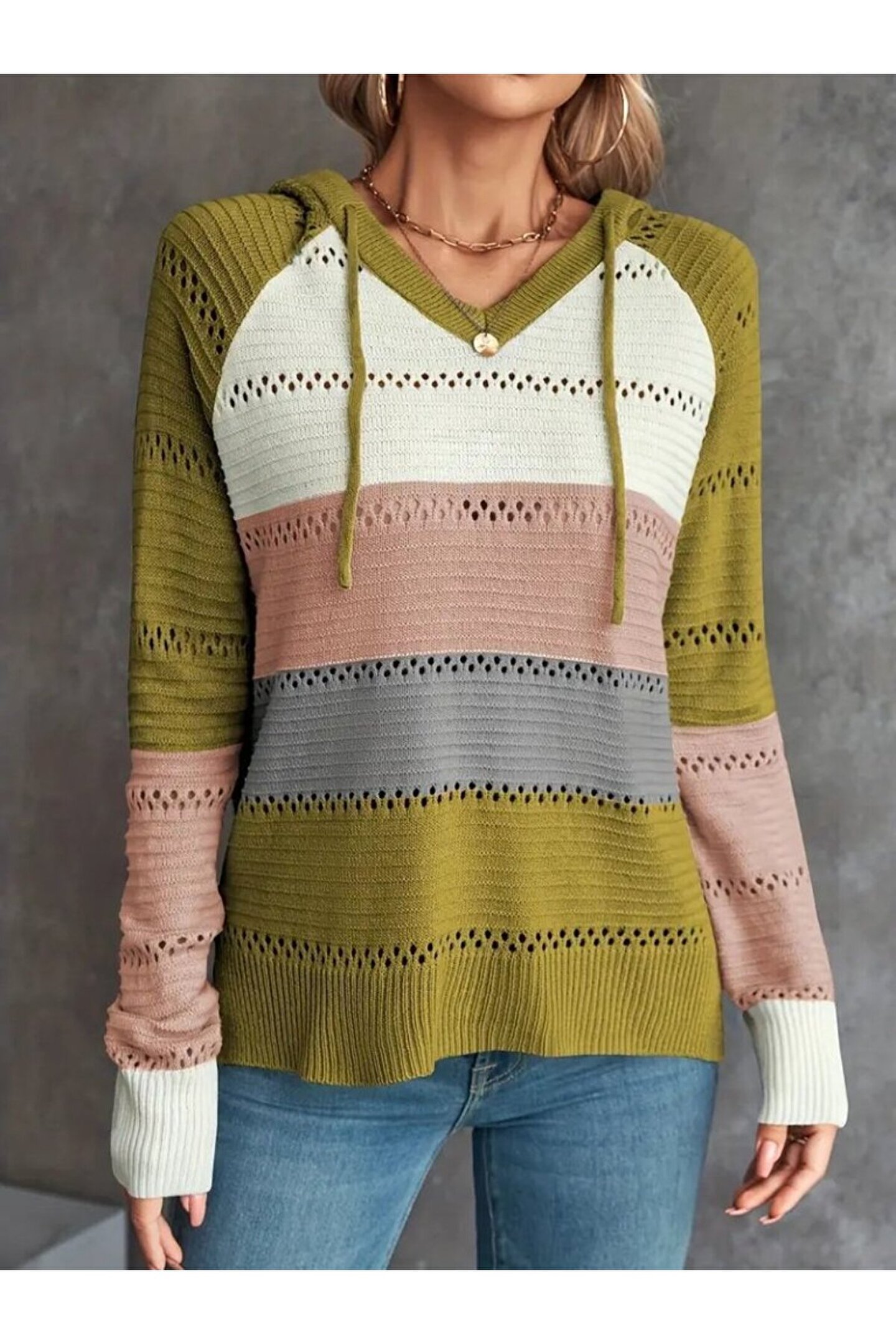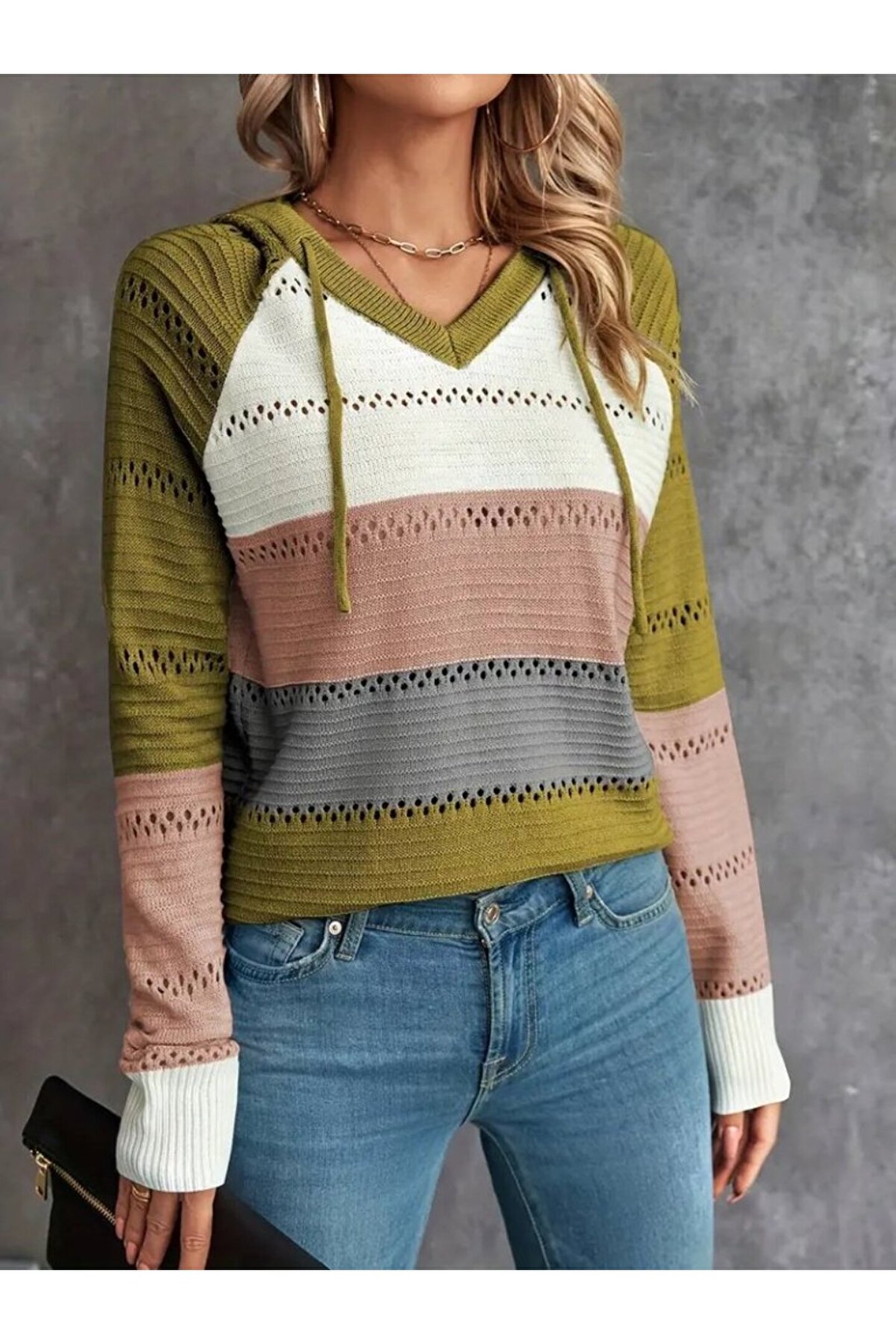 BEFAON EQURİ Kadın Uzun Kollu V Yakalı Bağcıklı Kapşonlu Triko Bluz