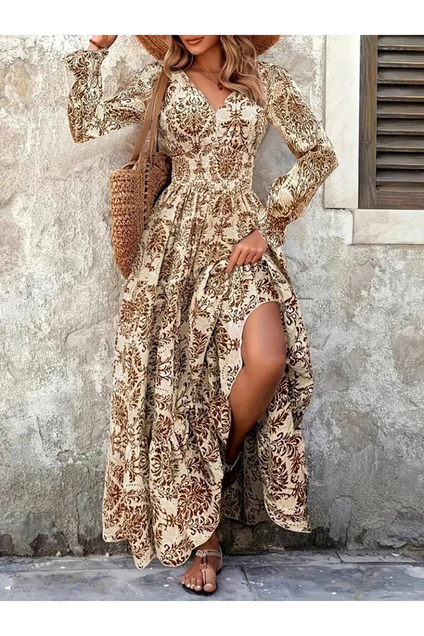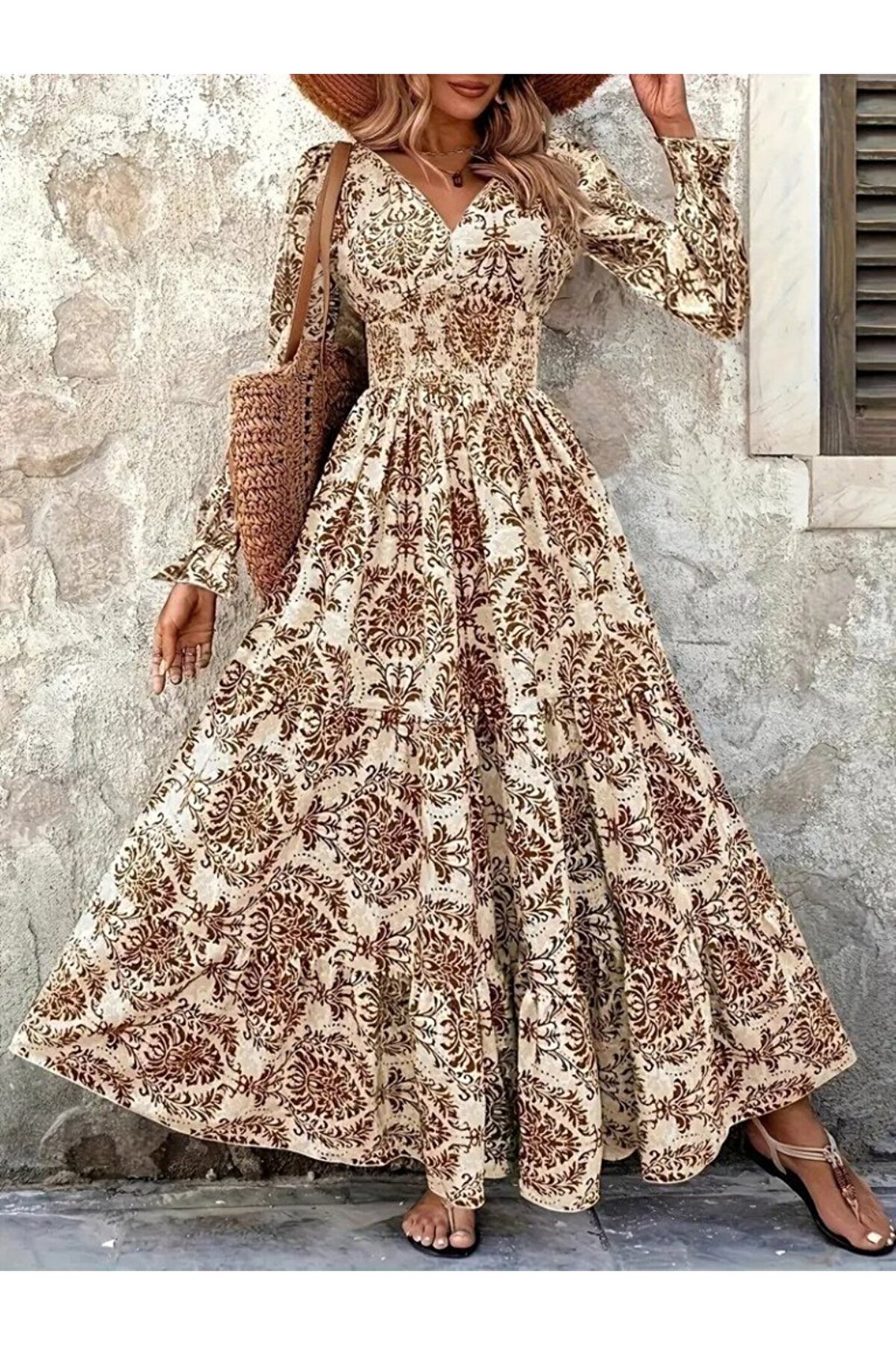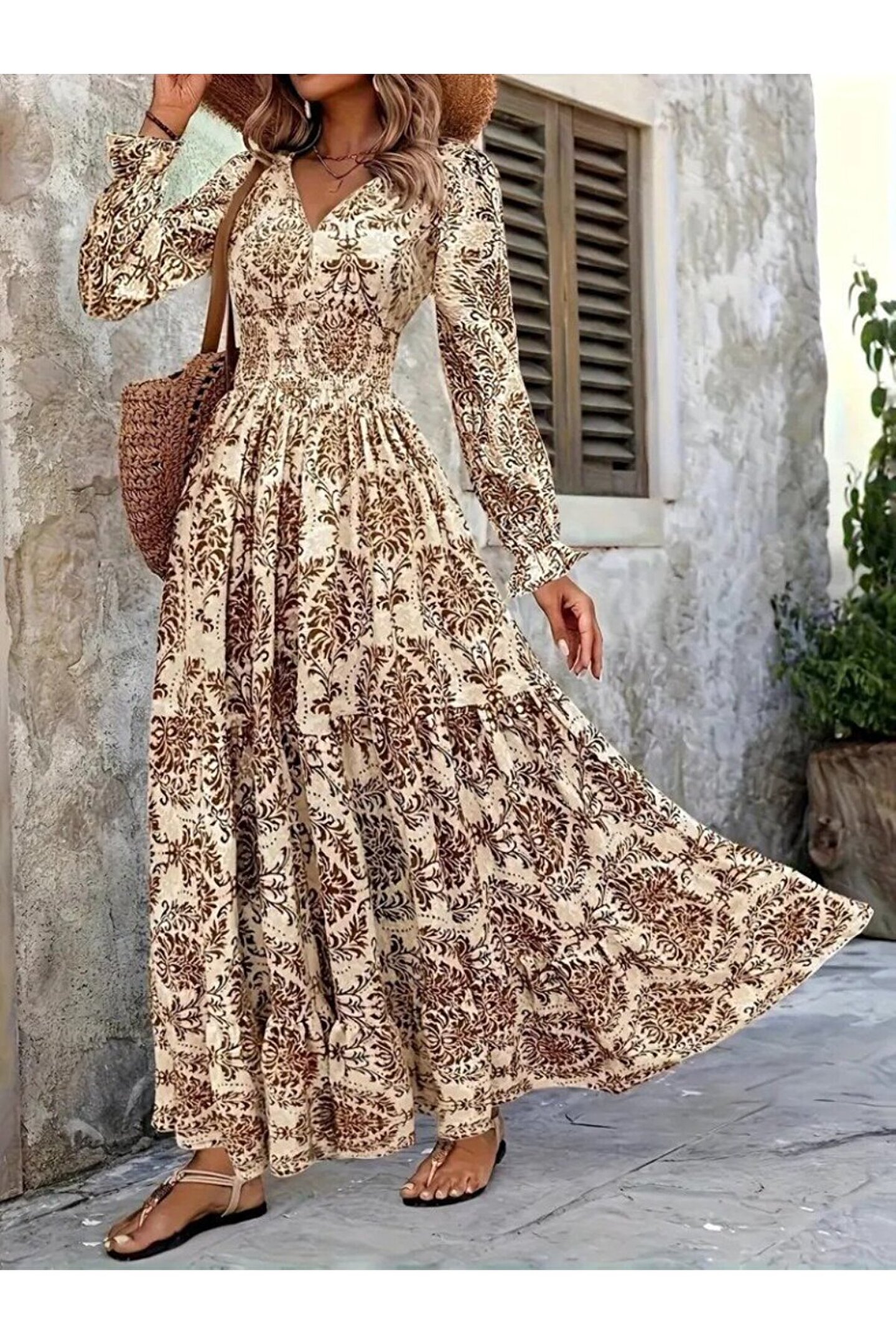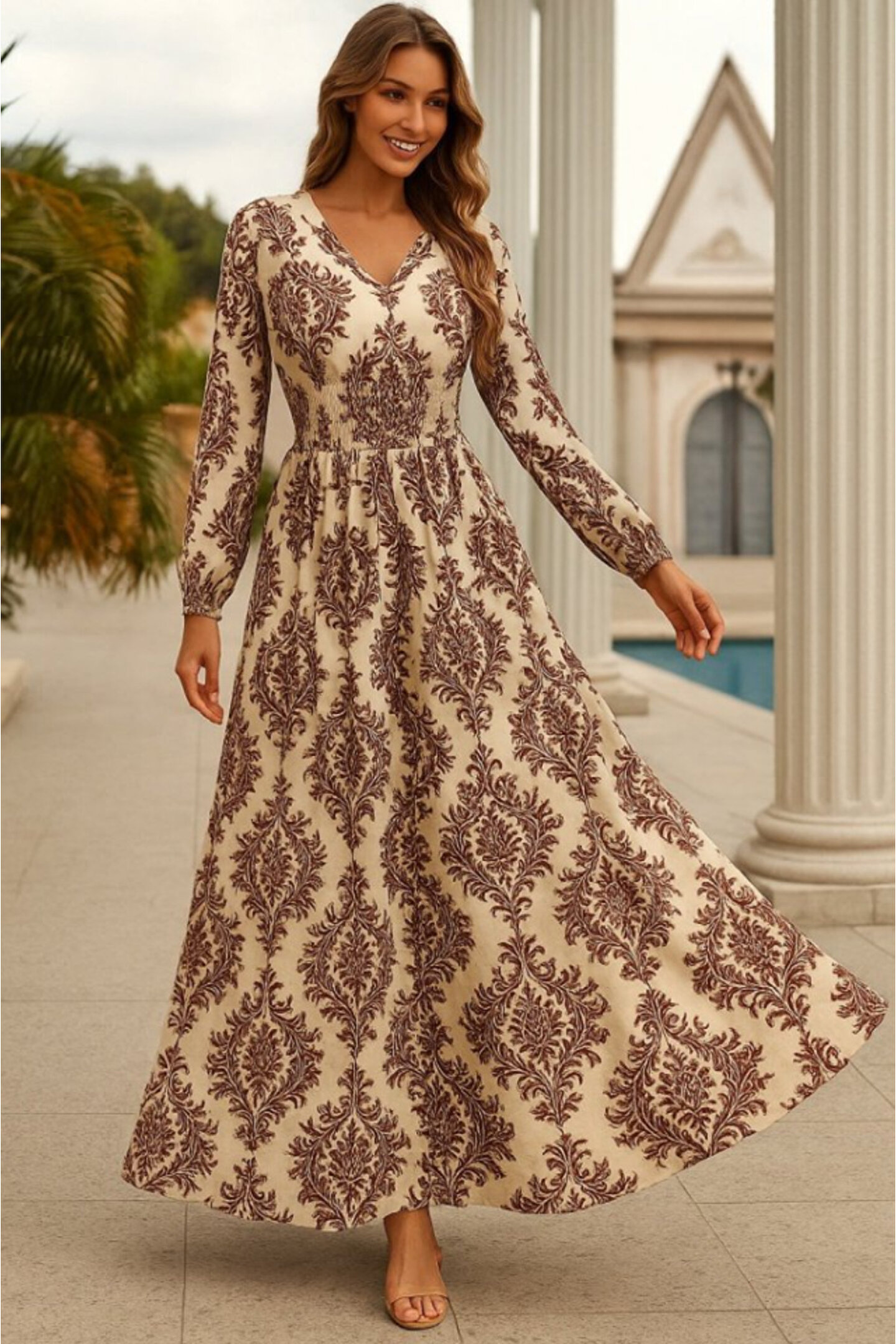 BEFAON EQURİ Kadın Uzun Kollu V Yakalı Desenli Süprem Elbise