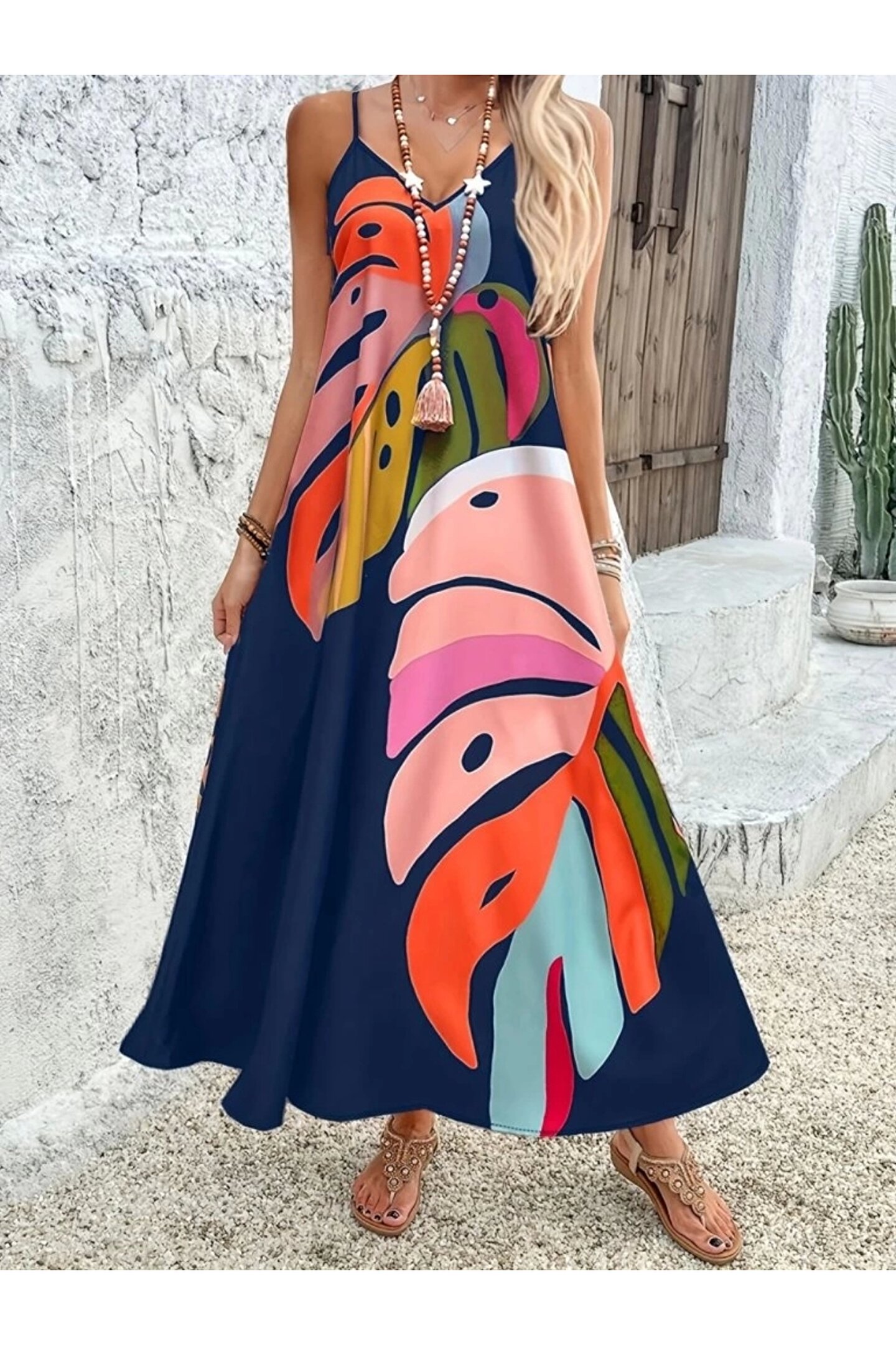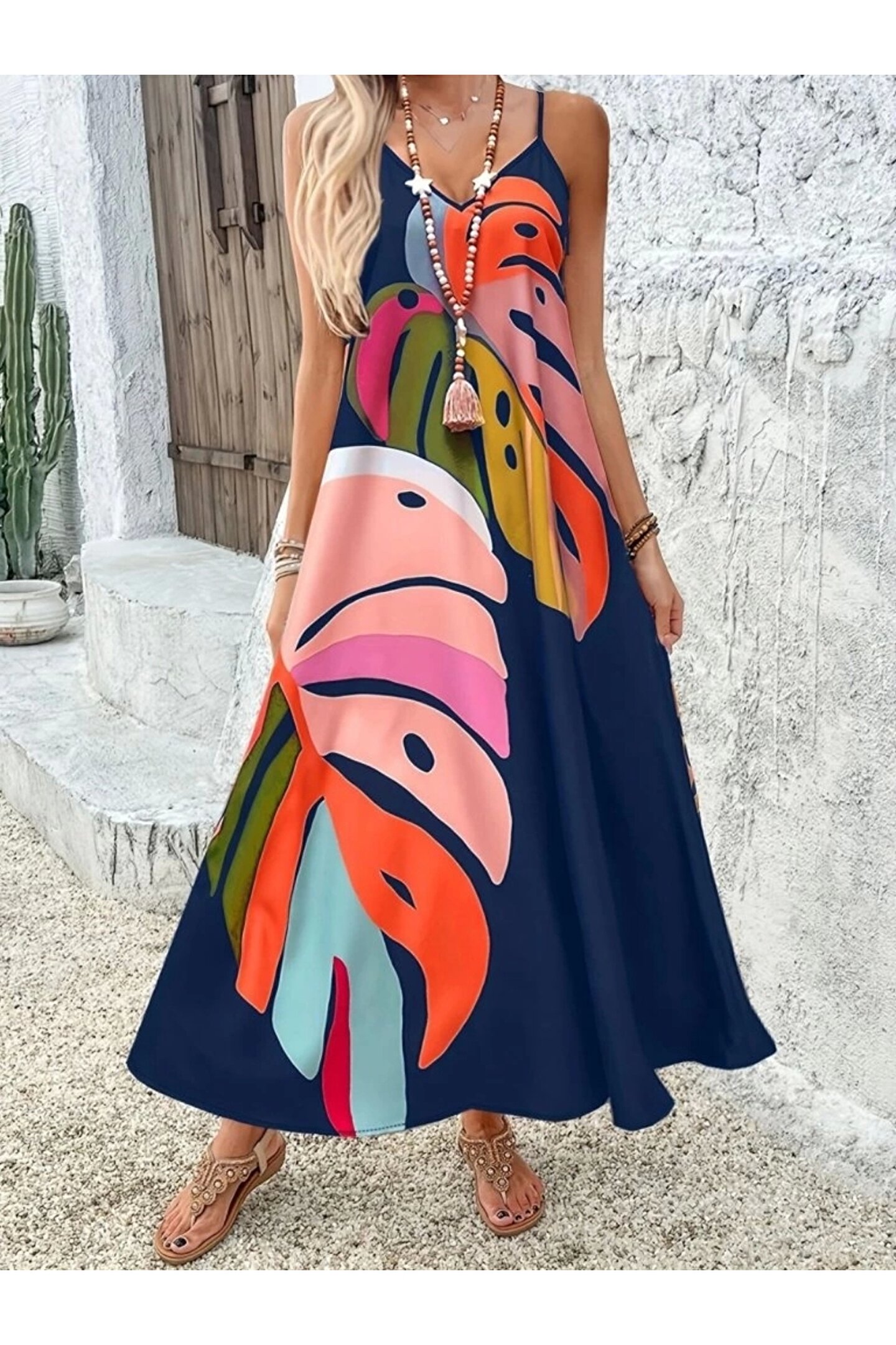 BEFAON Kadın Ip Askılı V Yakalı Desenli Süprem Maxi Elbise