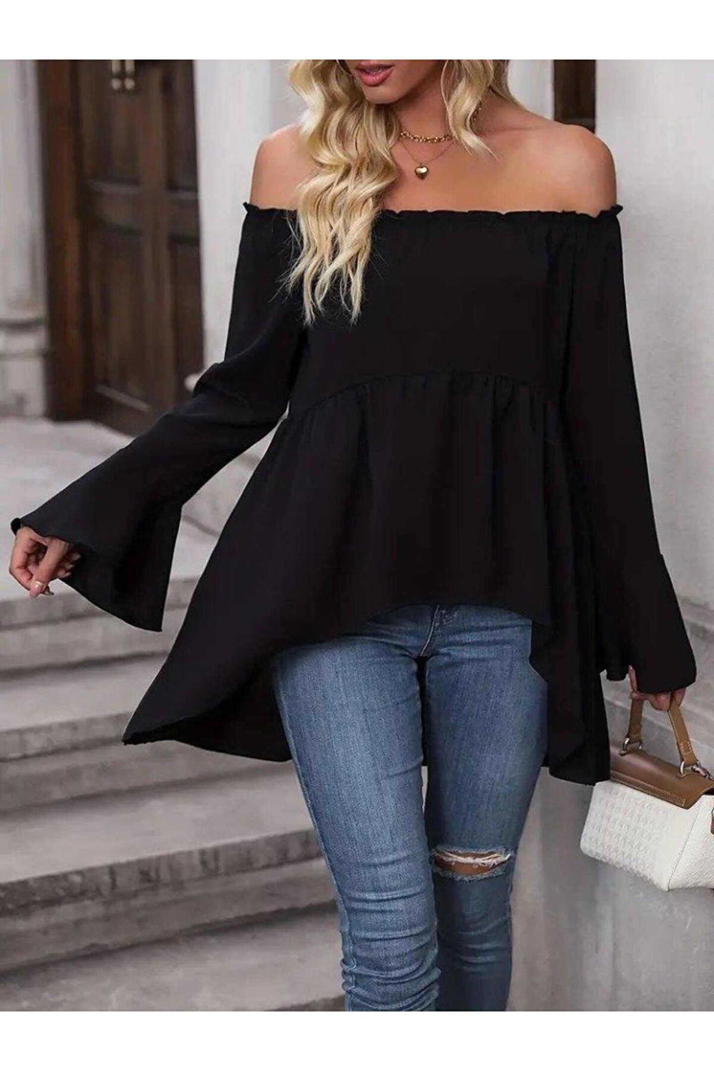 BEFAON Kadın Uzun Kollu Madonna Yaka Asimetrik Detaylı Kolları Ispanyol Viskon Bluz