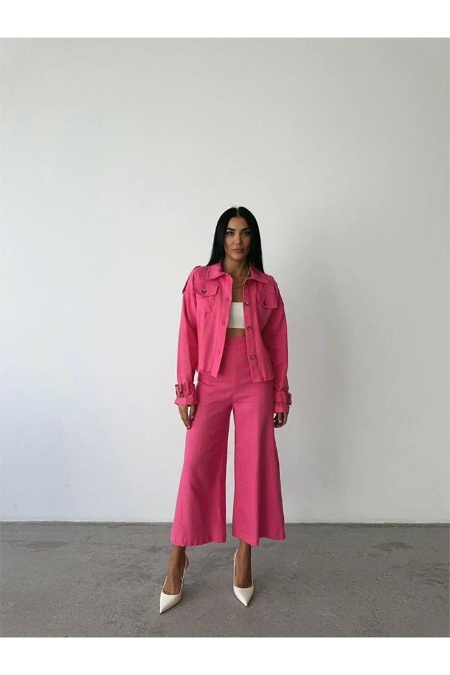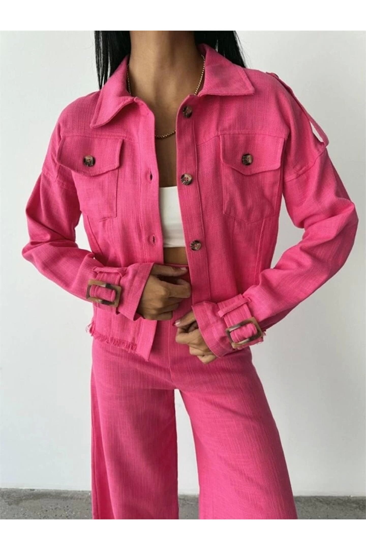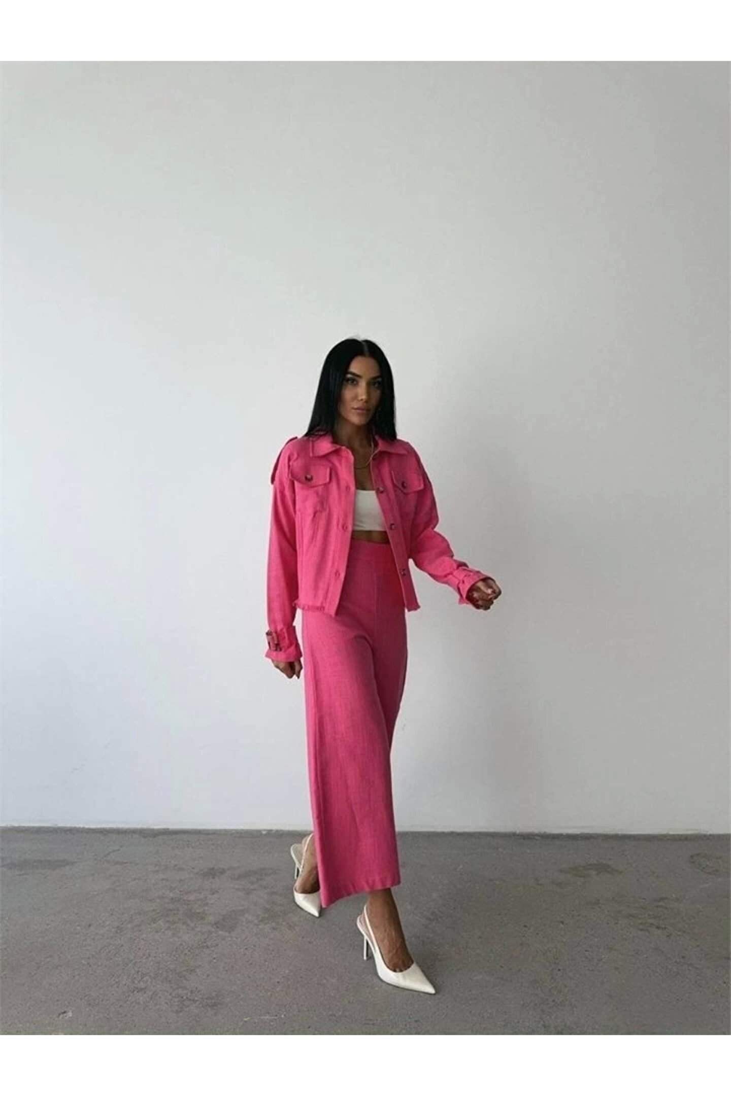 BEFAON KETEN PÜSKÜL DETAYLI GÖMLEK-PANTOLON TAKIM - Fuşya