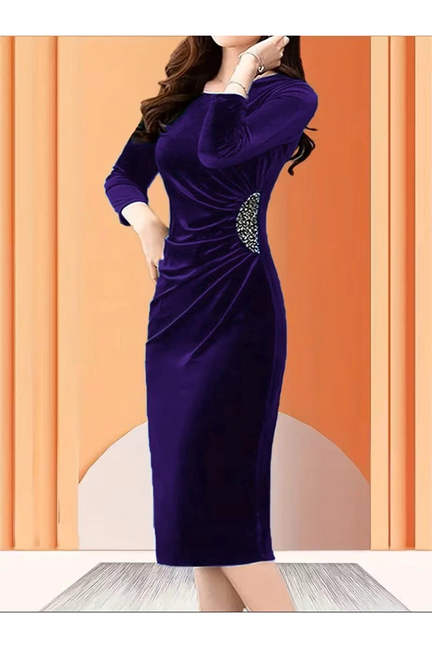 Kadın Uzun Kollu Bot Yaka Yanı Taş Detaylı Midi Kadife Elbise