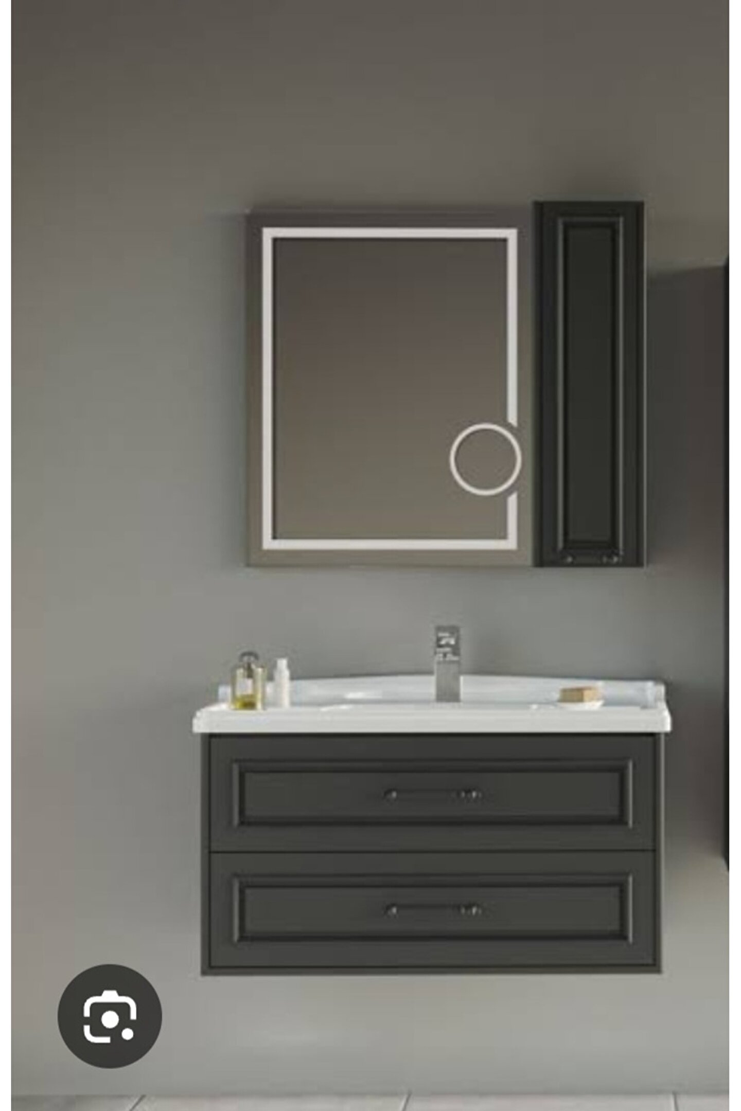 RENK GRİ – ANTRASİTKAPAK MDF LAM + EMAYE RENKGÖVDE MDF-LAM + EMAYE RENKÇekmece tandem slaytSERAMİK LAVABOAYNA LED büyüteçli aynaKAPAK TİPİ FREN KAPAĞIÇekmece tipi frenli çekmece