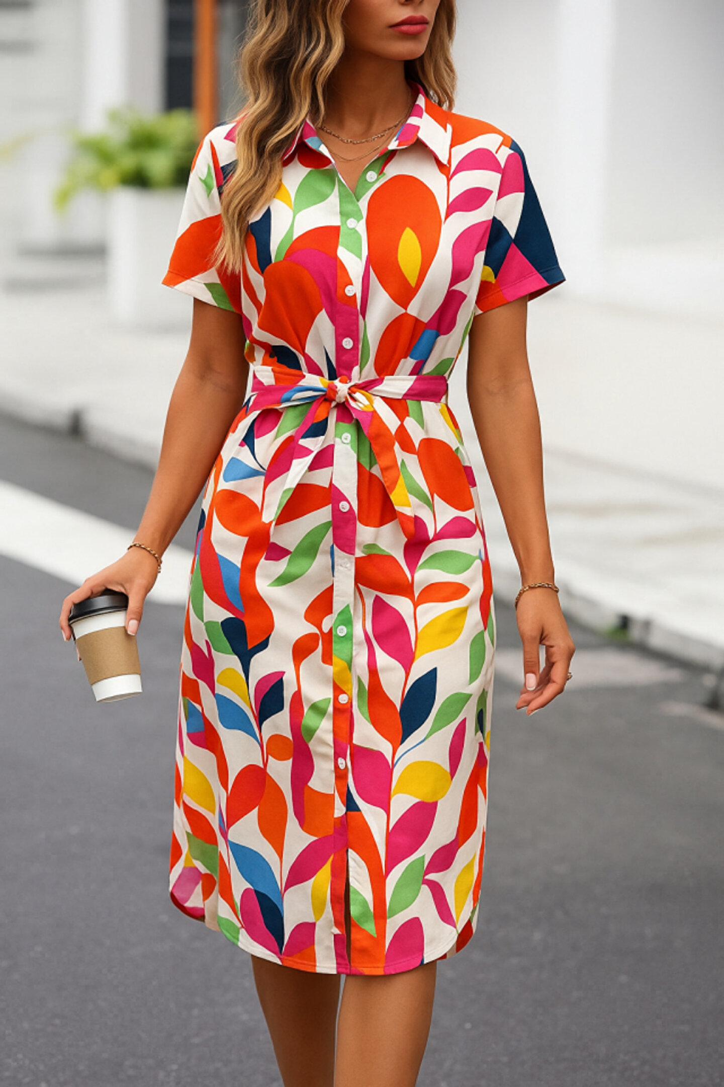 Kadın Kısa Kollu Yakalı önü Düğmeli önden Drapeli Desenli Süprem Elbise