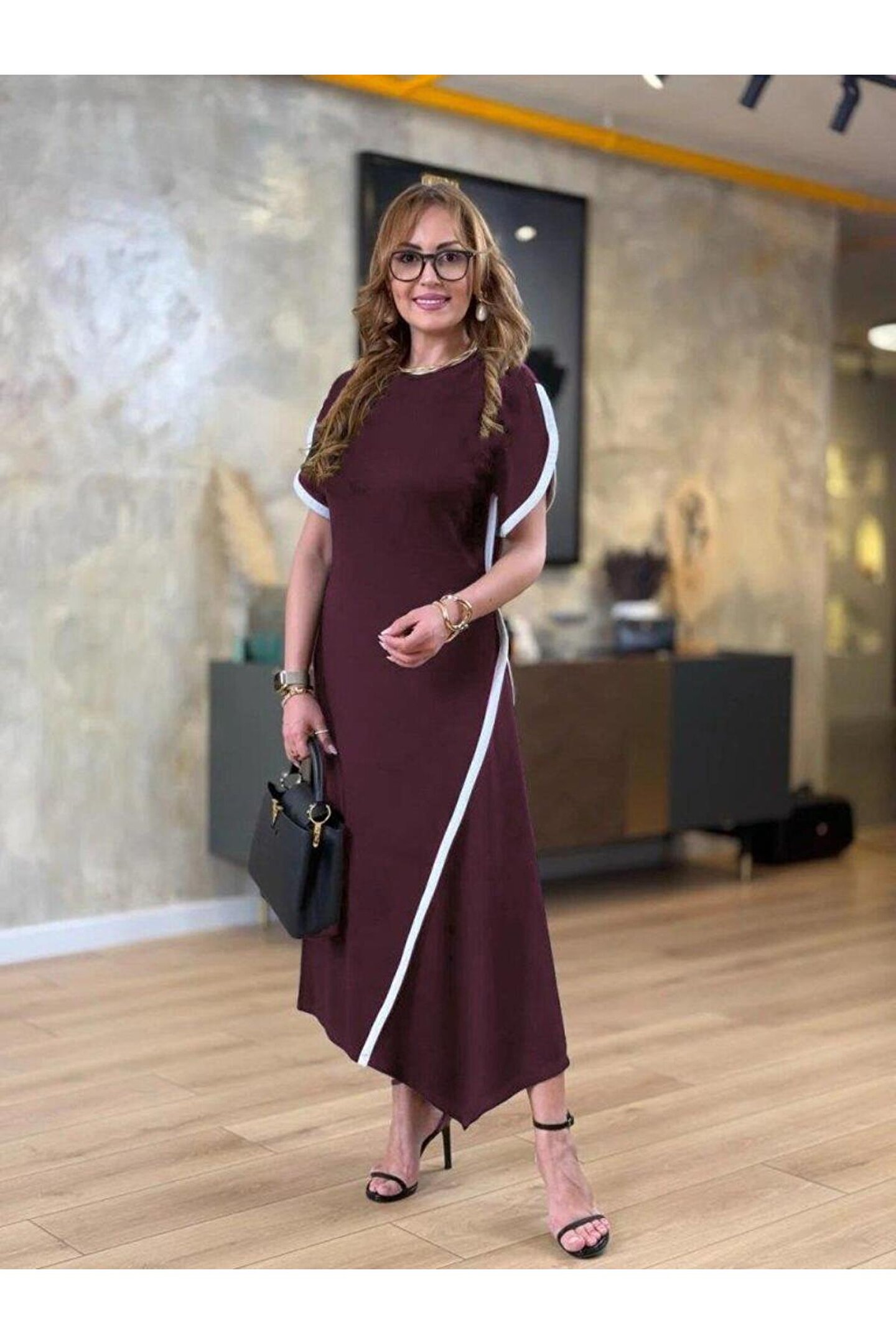 Bijuterria Kadın Kısa Kollu Bisiklet Yaka çift şerit Renk Detaylı Asimetrik Kesim Viskon Iki Iplik Elbise