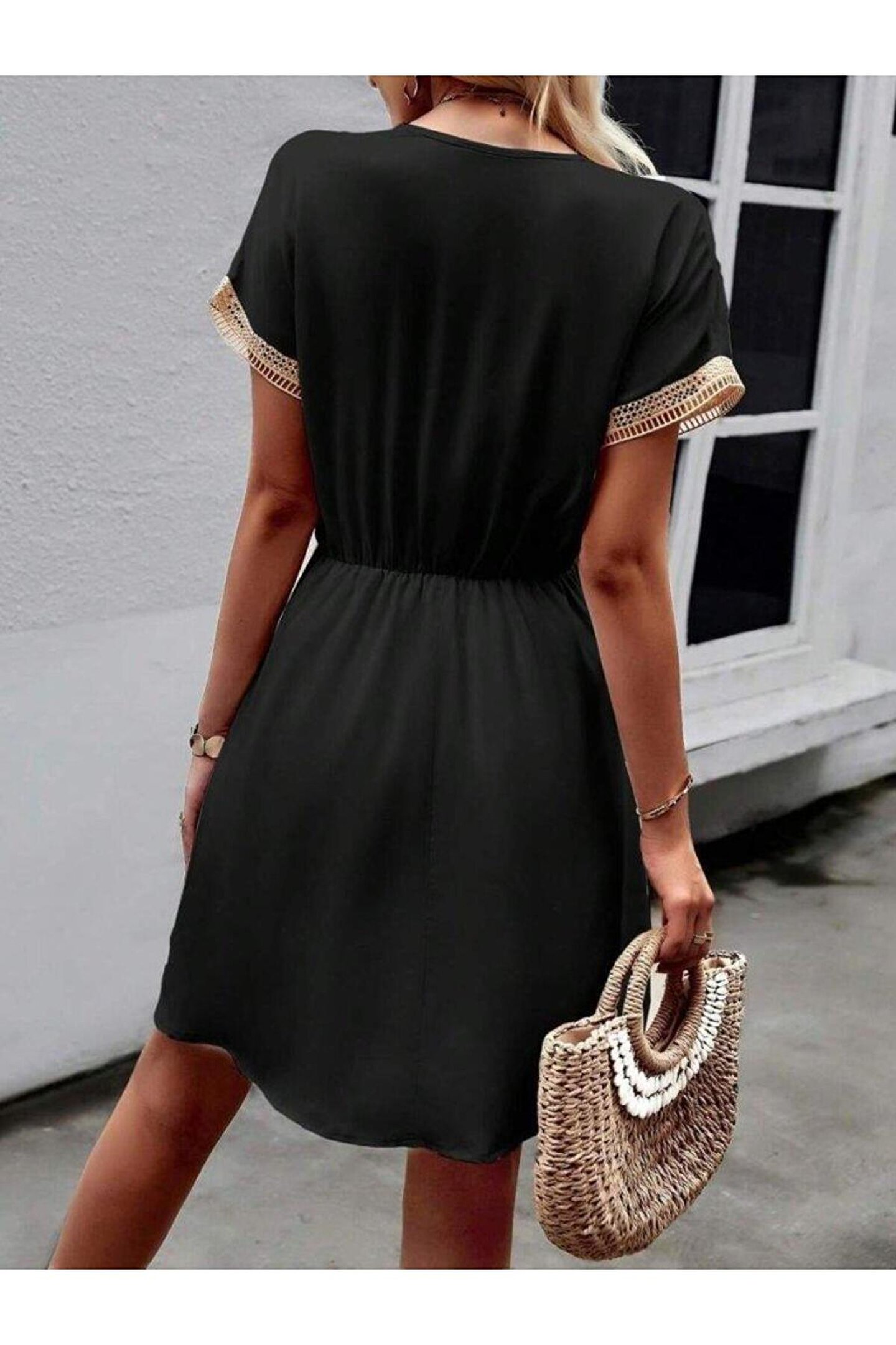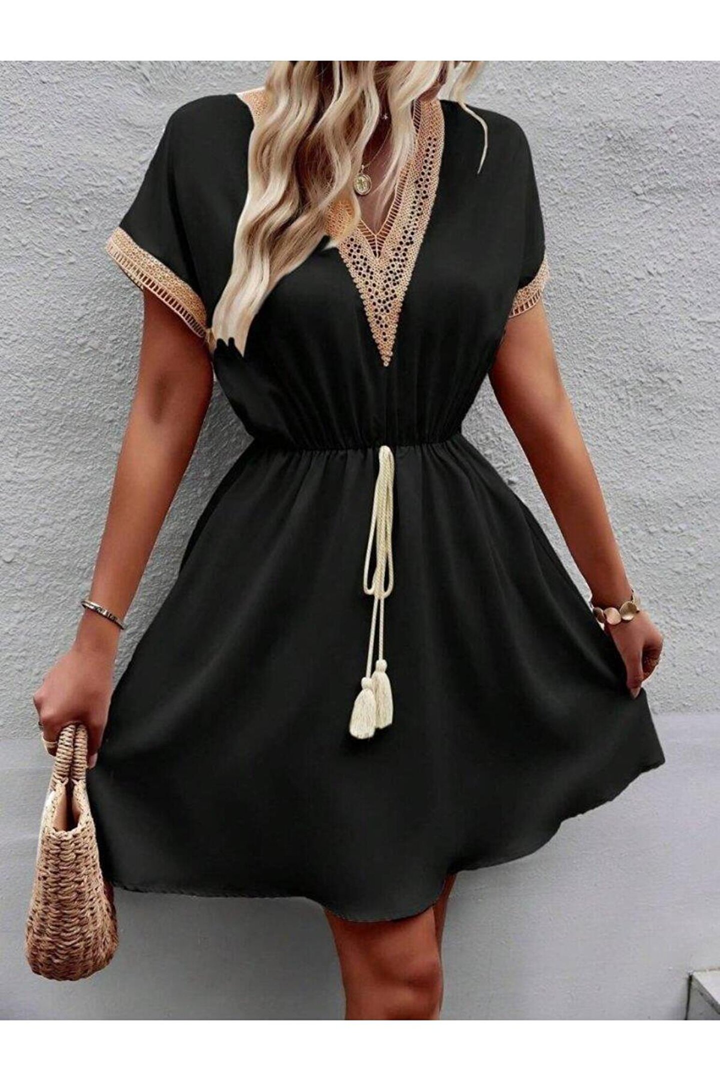 Bijuterria Kadın Kısa Kollu V Yakalı Belinde Bağcıklı Viskon Elbise
