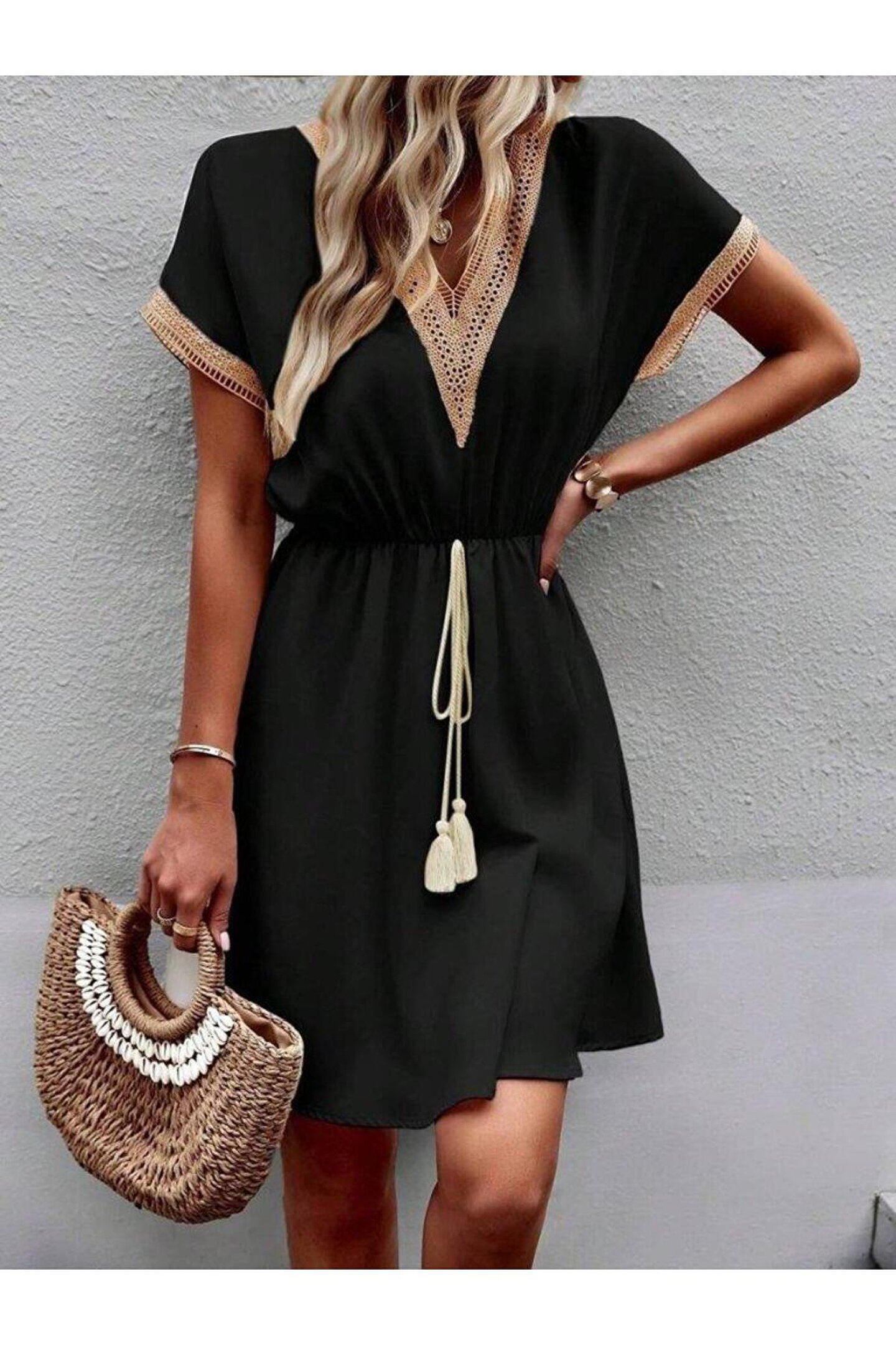 Kadın Kısa Kollu V Yakalı Belinde Bağcıklı Viskon Elbise