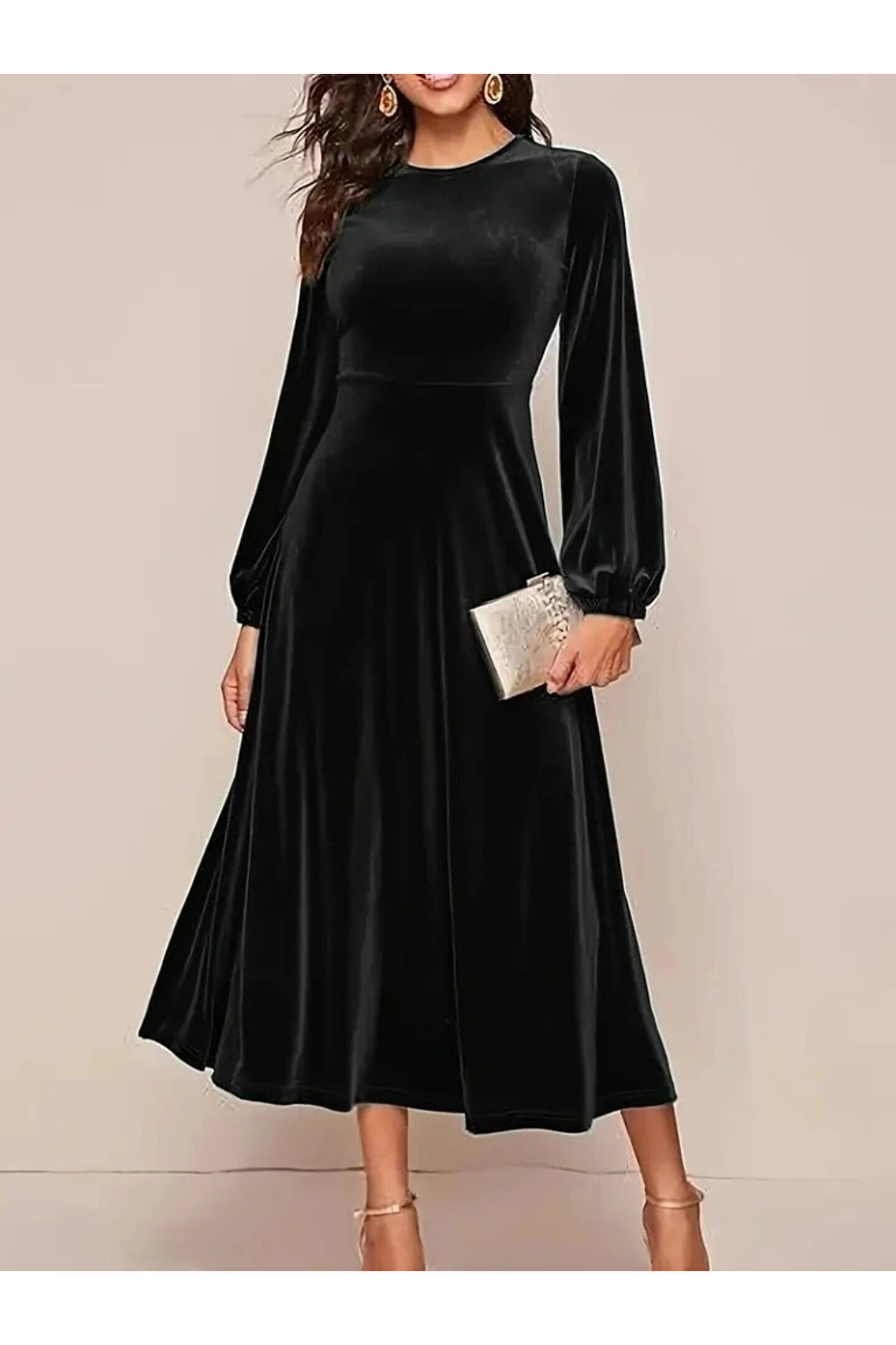 Kadın Uzun Kollu Bisiklet Yaka Midi Kadife Elbise