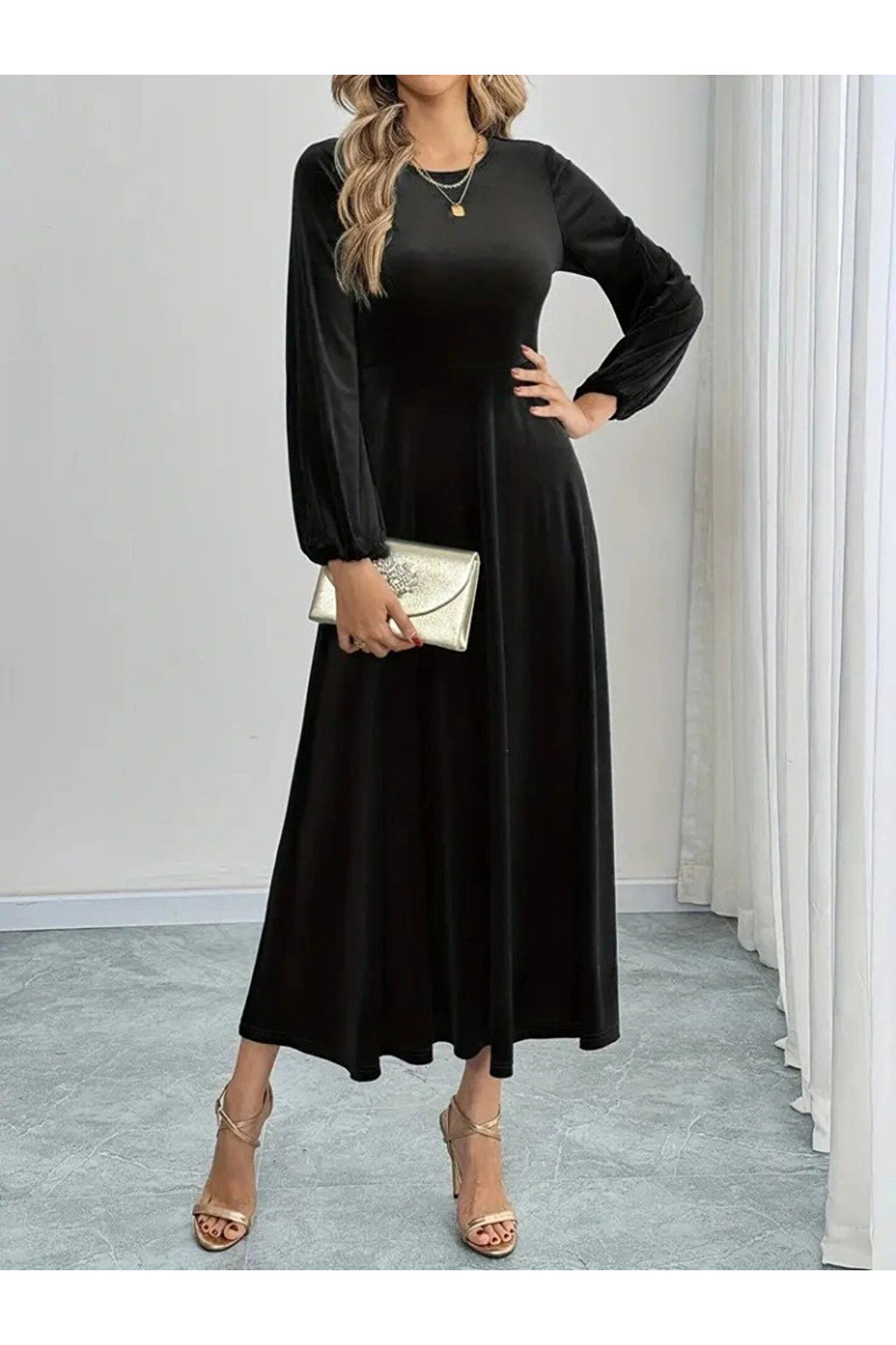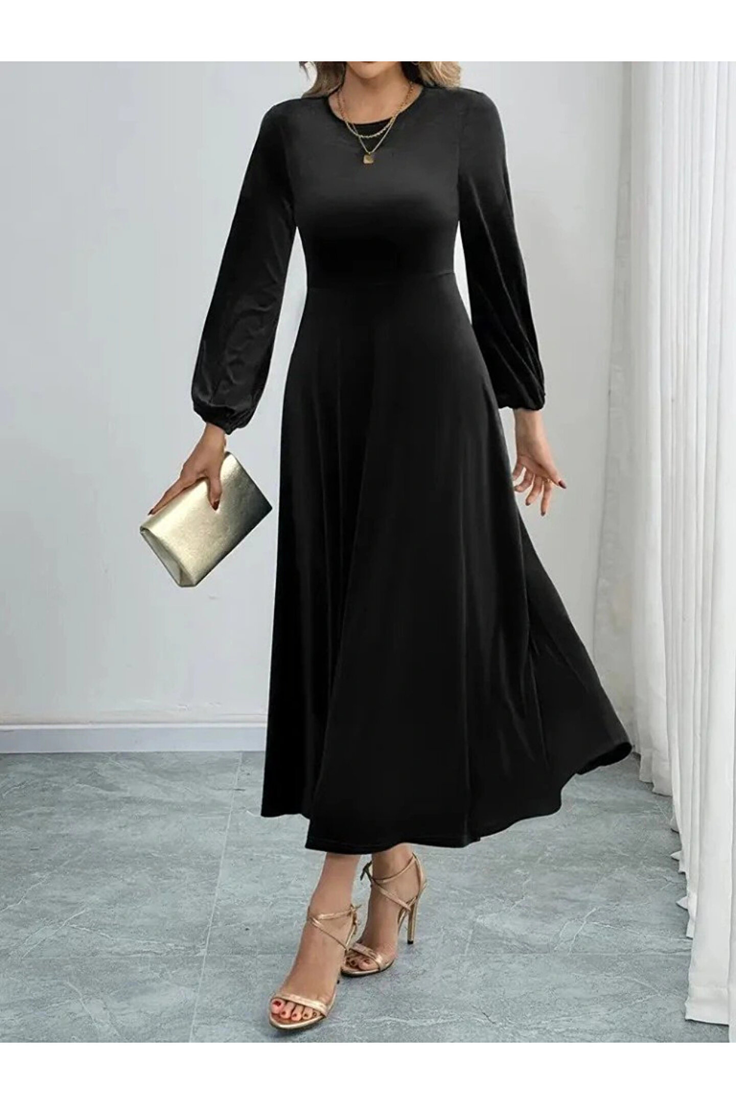 Bijuterria Kadın Uzun Kollu Bisiklet Yaka Midi Kadife Elbise