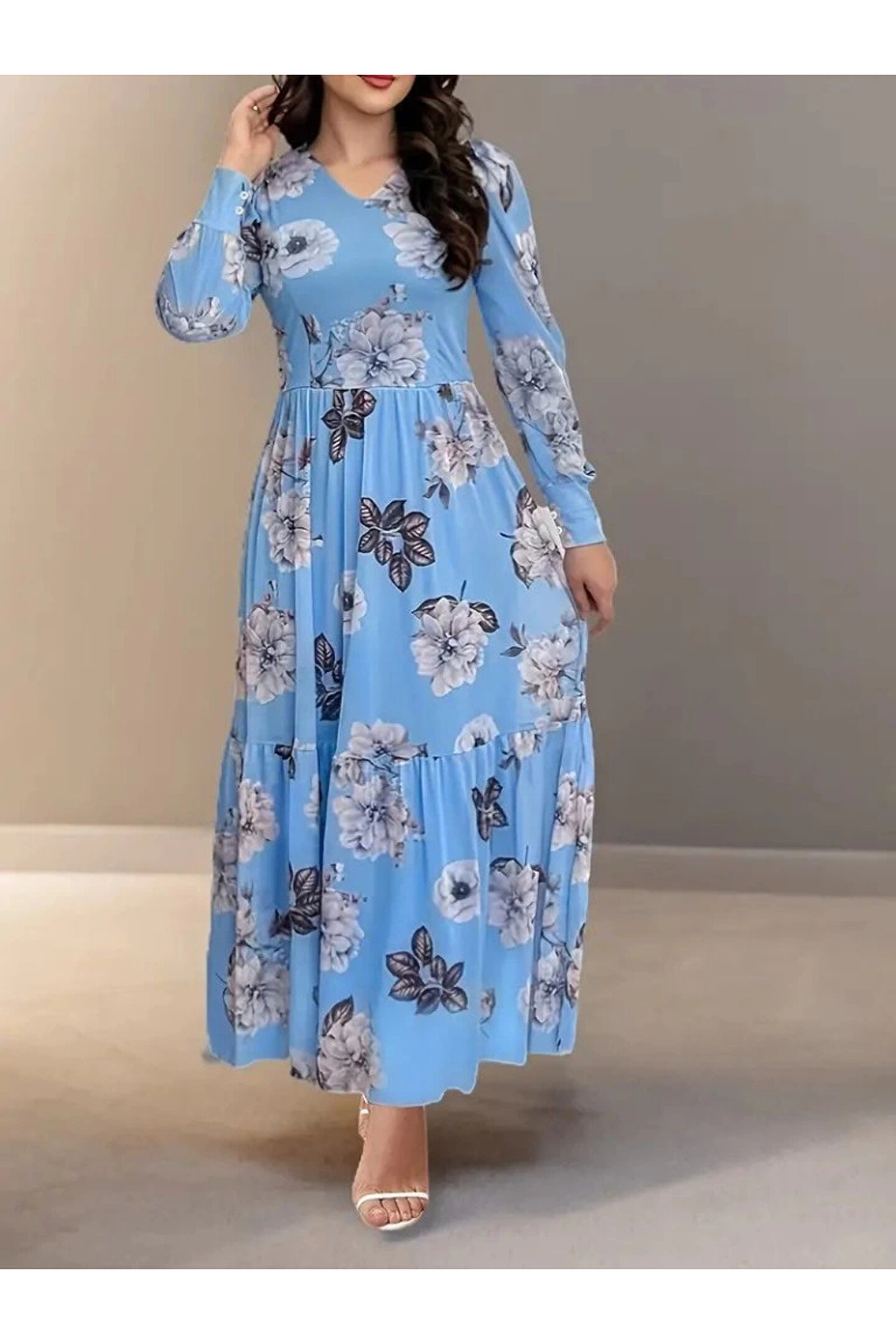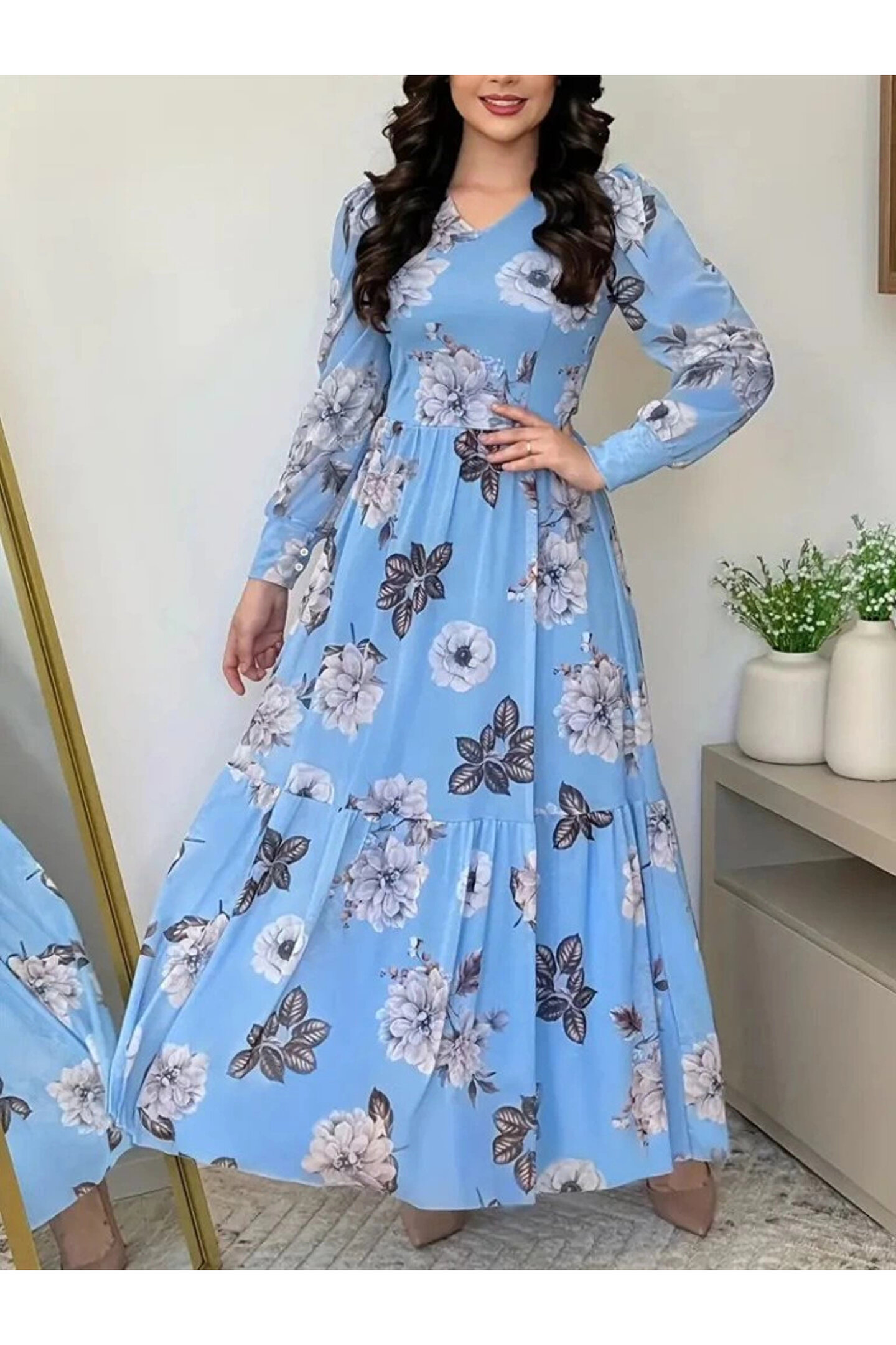 Bijuterria Kadın Uzun Kollu V Yakalı çiçek Desenli Maxi Süprem Elbise