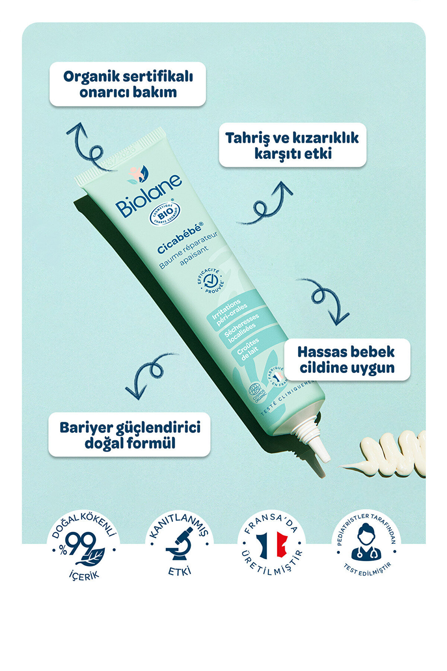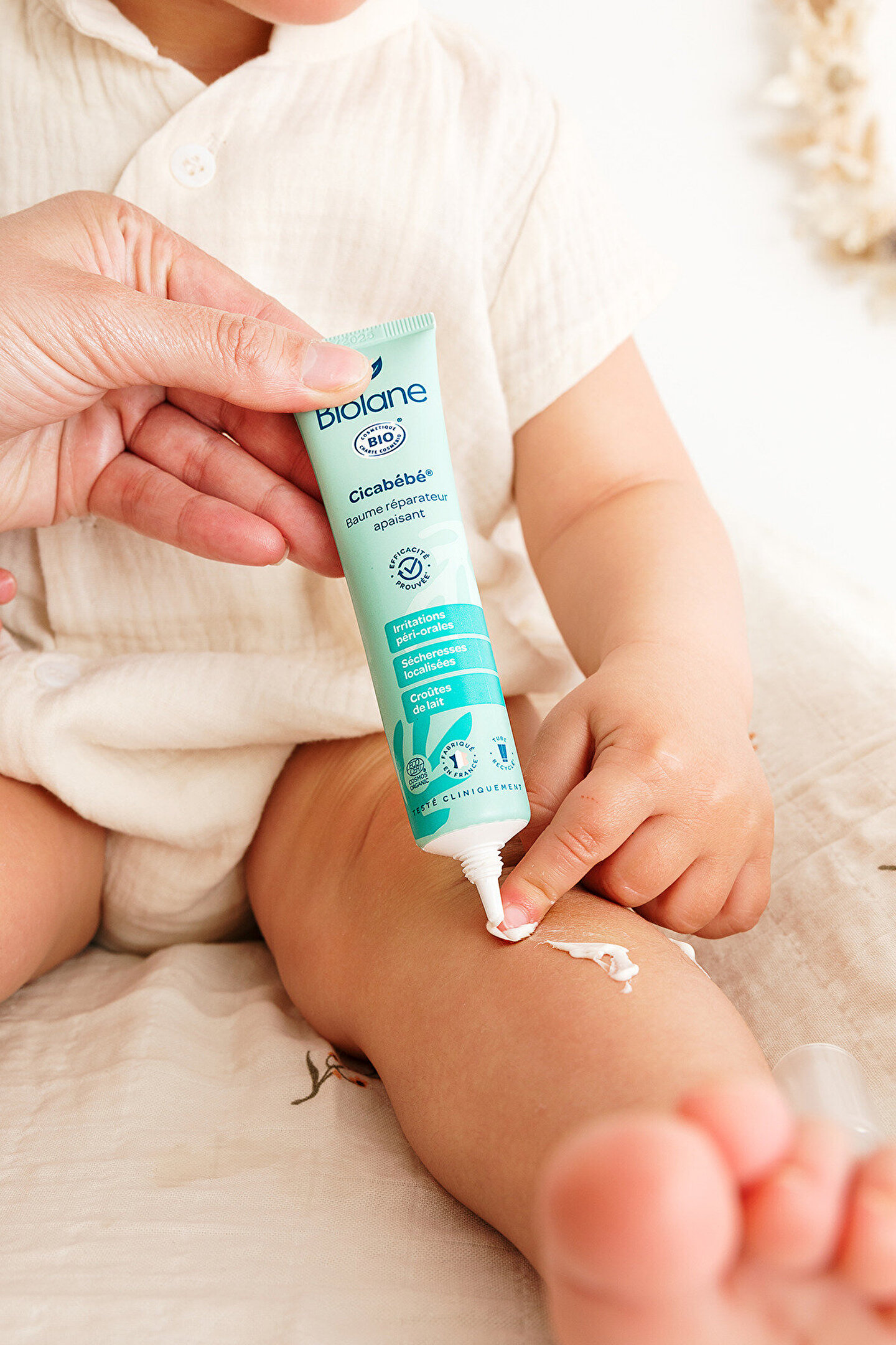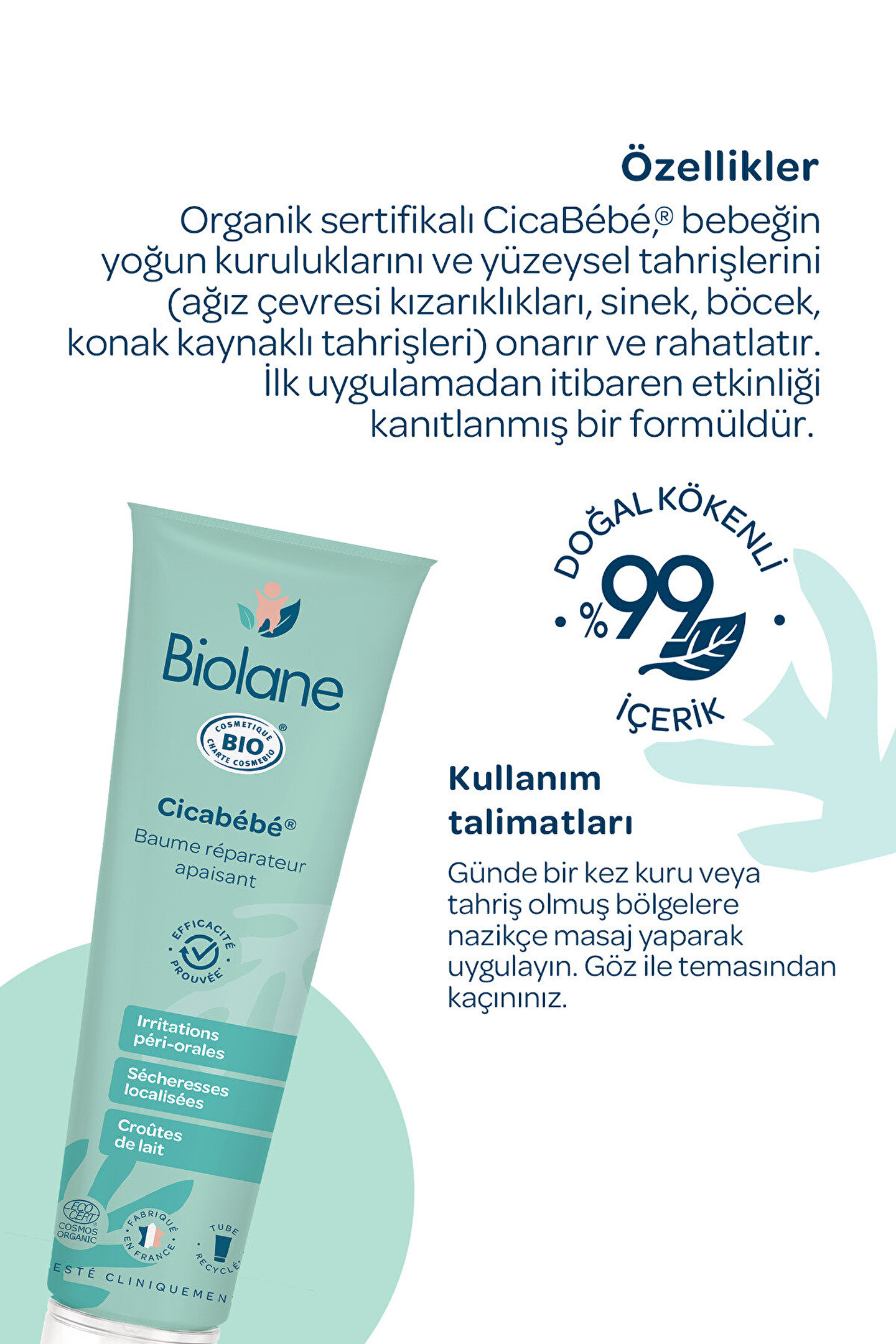Organik sertifikalı Biolane CicaBébé® bebeklerdeki yoğun kuruluğu ve aşırı tahrişi (perioral dermatit, isilik, sinek böcek ısırıkları, bölgesel tahrişler, konak) onarmaya ve rahatlamasına yardımcı olur.