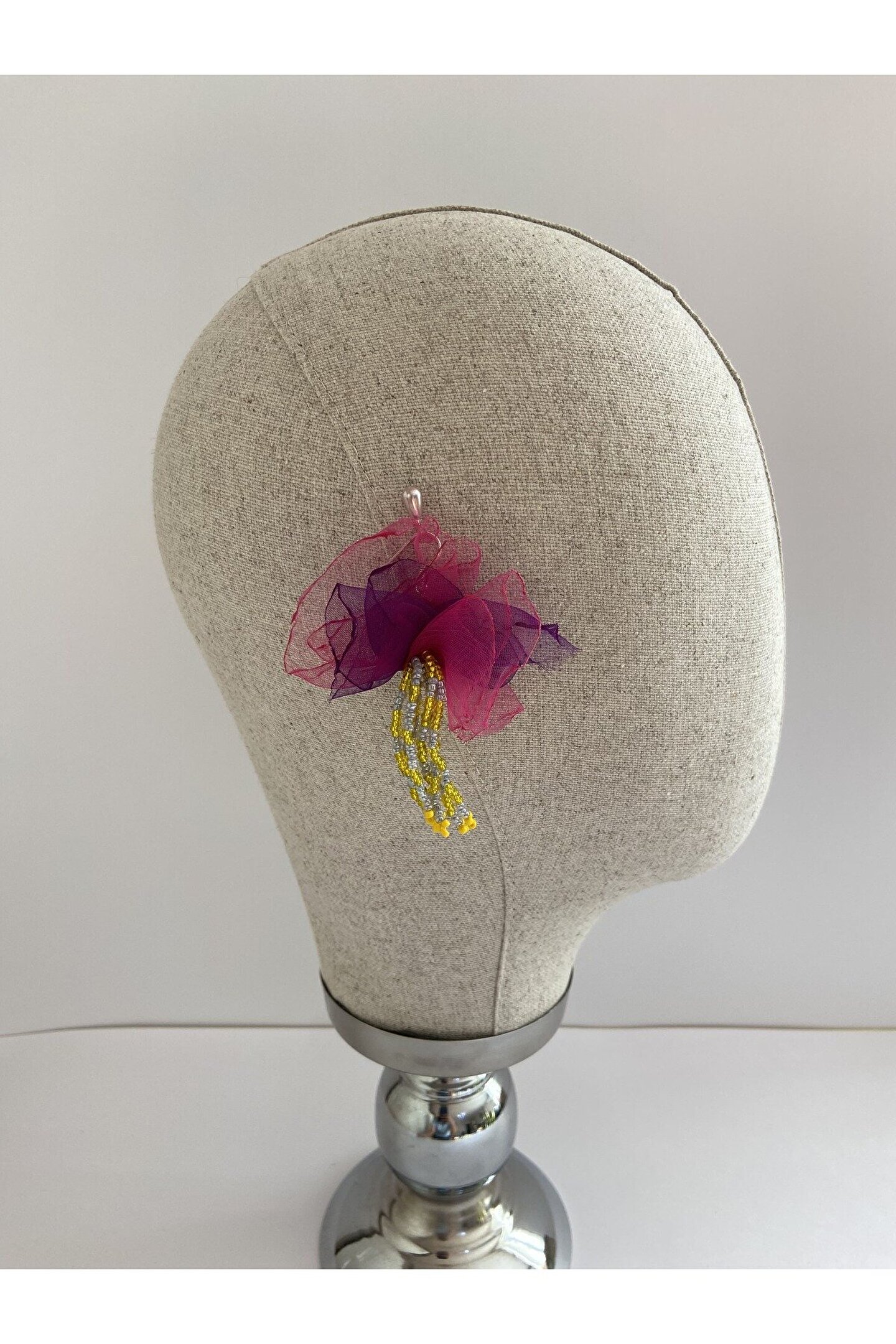 Cemil İpekçi'nin özel defilesi için tasarlanmış bu şık küpe seti, zarafeti ve modern estetiği bir araya getiriyor. Eşsiz mor ve pembe tül detayları, sarı ve gri kum boncuk sallantılarıları ile bezeli bu küpeler, göz alıcı renklerin ve dokuların harmanlanmasını sunarak her tarza mükemmel bir uyum sağlar.