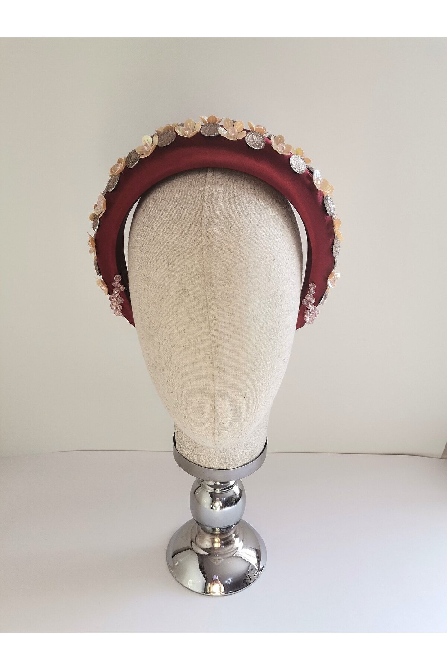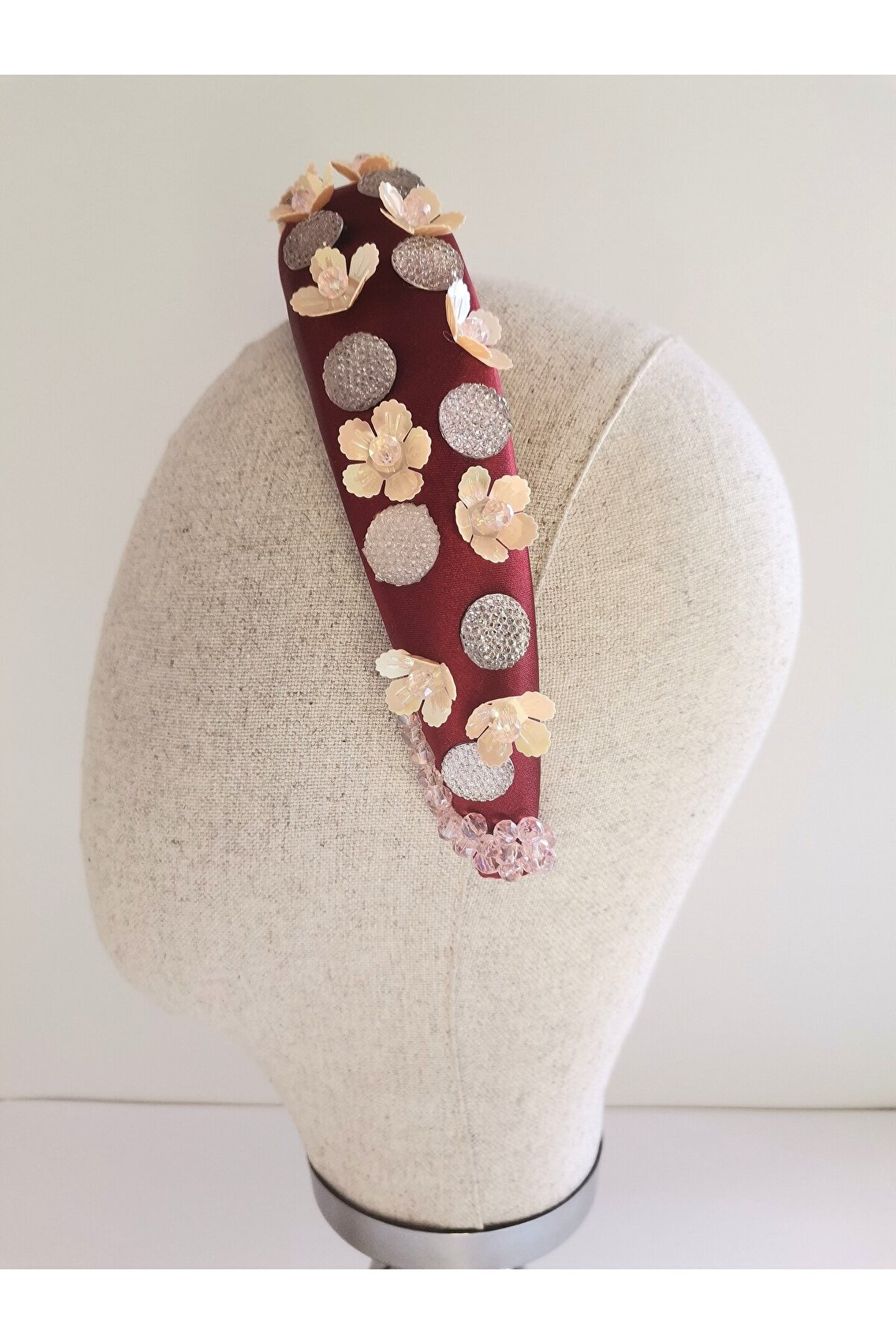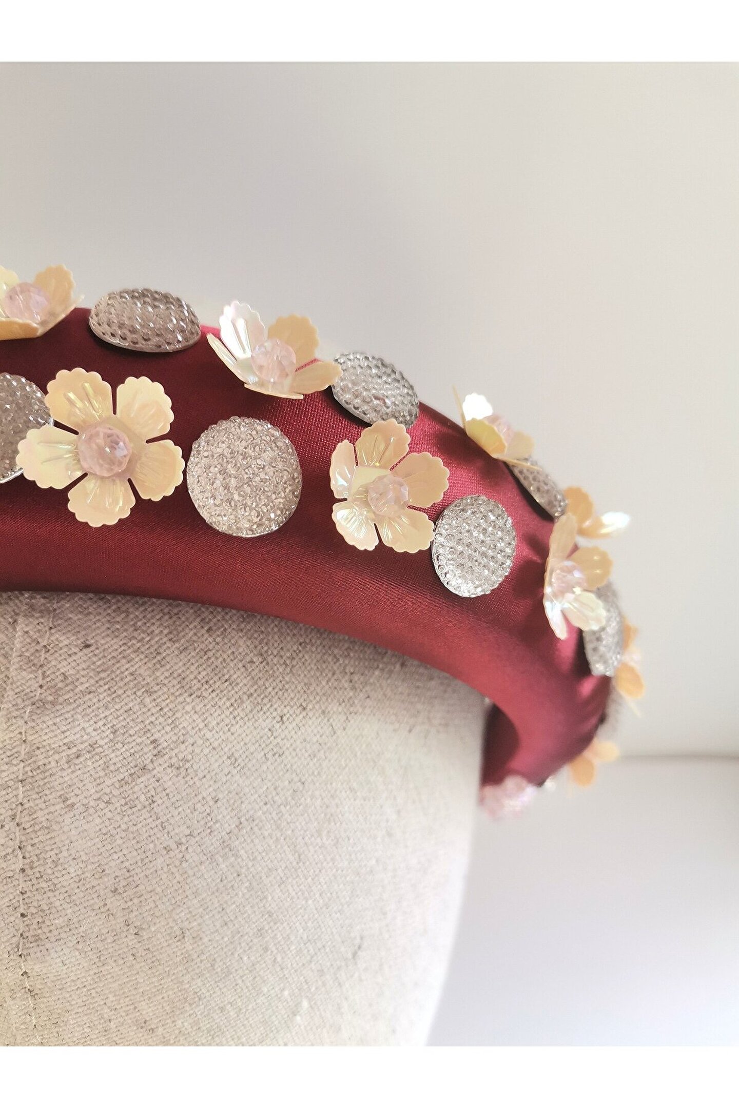 Cemil İpekçi’nin defilesi için özel olarak tasarlanmış bu çarpıcı taç, kırmızı kadife kumaş üzerine çiçek motifli boncuklar, ortasında parlak kristal boncuklar ve büyük parlak taşlar işlenerek özenle hazırlanmıştır. El işçiliği ile şekillenen bu tasarım, zarafeti ve göz alıcı detayları bir araya getiriyor. Kırmızı kadifenin lüks dokusu, boncukların ve taşların ışıltısıyla birleşerek bu tacı hem özel etkinliklerde hem de unutulmaz günlerinizde tercih edilebilecek eşsiz bir aksesuar haline getiriyor. Her stile farklı bir dokunuş katan bu taç, sofistike ve cesur bir görünüm arayanlar için mükemmel bir seçimdir.