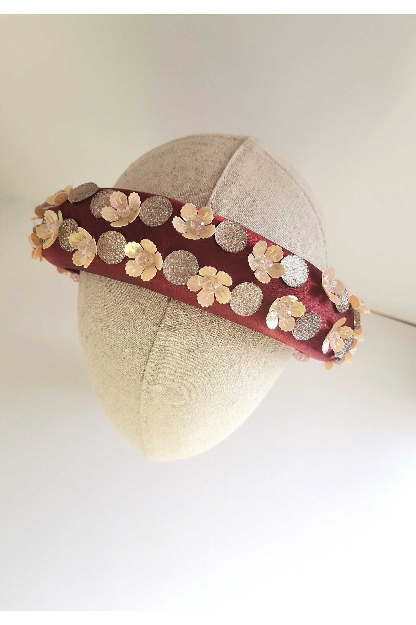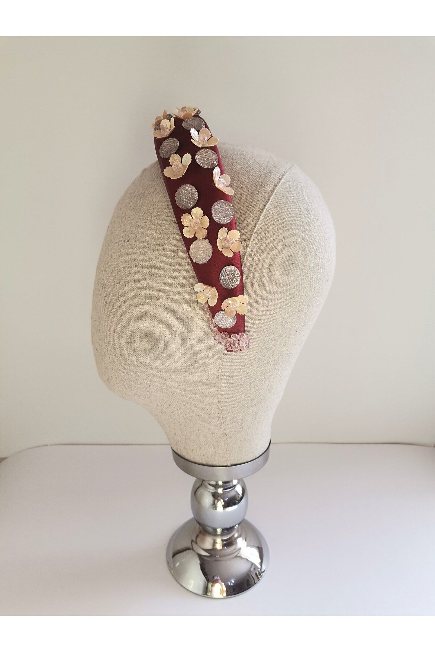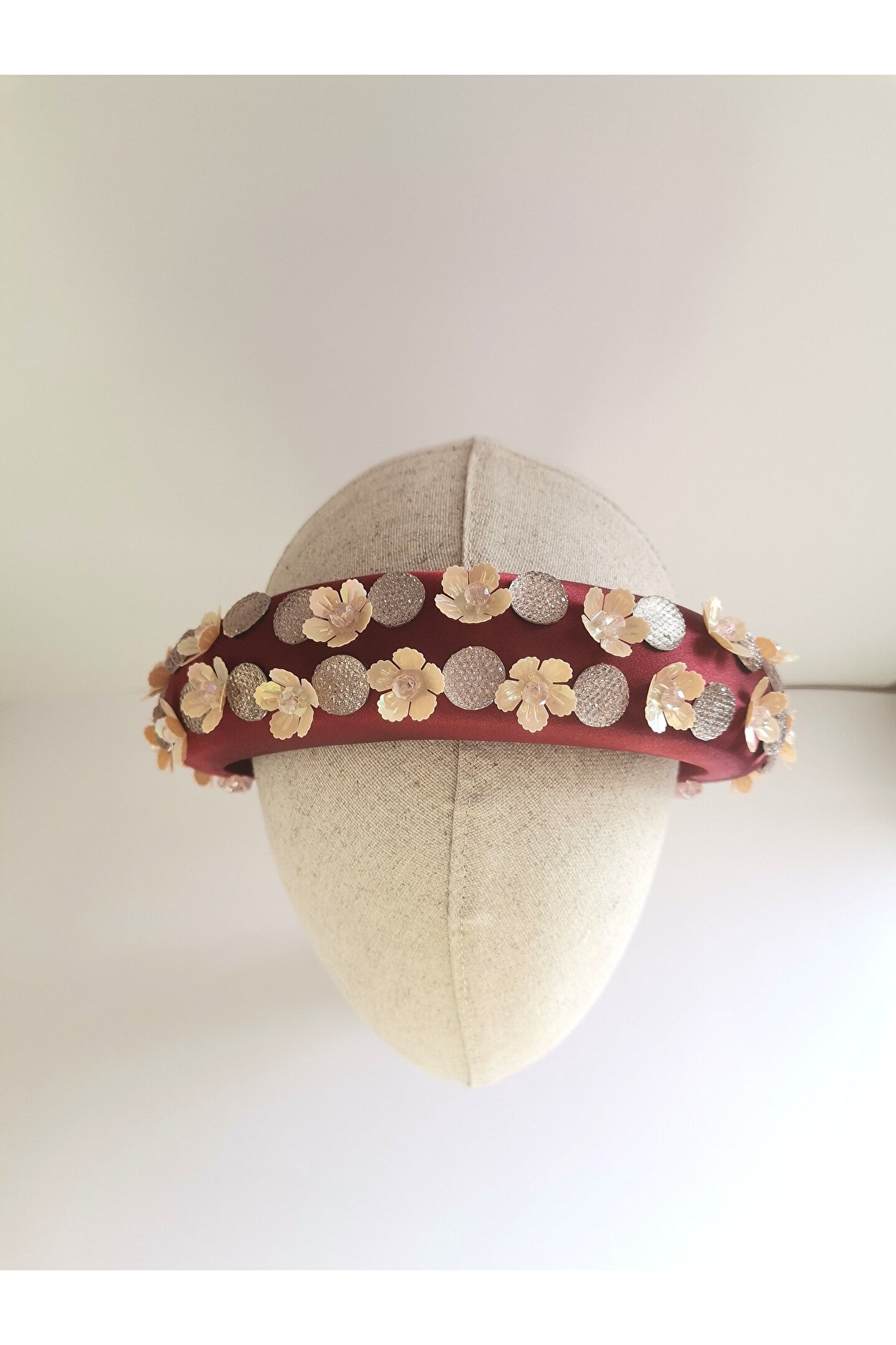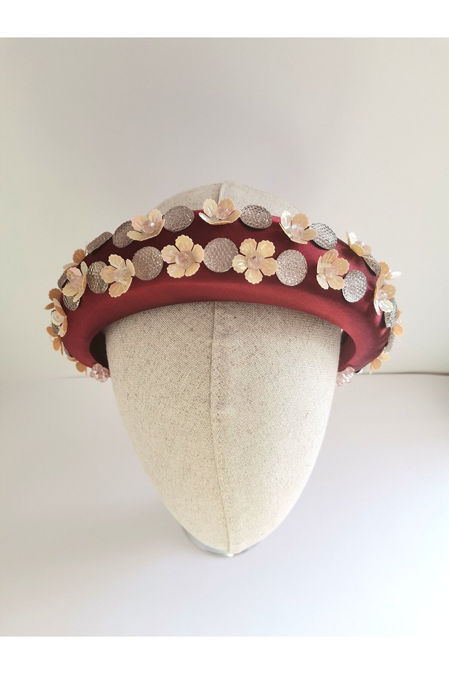 Cemil İpekçi’nin defilesi için özel olarak tasarlanmış bu çarpıcı taç, kırmızı kadife kumaş üzerine çiçek motifli boncuklar, ortasında parlak kristal boncuklar ve büyük parlak taşlar işlenerek özenle hazırlanmıştır. El işçiliği ile şekillenen bu tasarım, zarafeti ve göz alıcı detayları bir araya getiriyor. Kırmızı kadifenin lüks dokusu, boncukların ve taşların ışıltısıyla birleşerek bu tacı hem özel etkinliklerde hem de unutulmaz günlerinizde tercih edilebilecek eşsiz bir aksesuar haline getiriyor. Her stile farklı bir dokunuş katan bu taç, sofistike ve cesur bir görünüm arayanlar için mükemmel bir seçimdir.